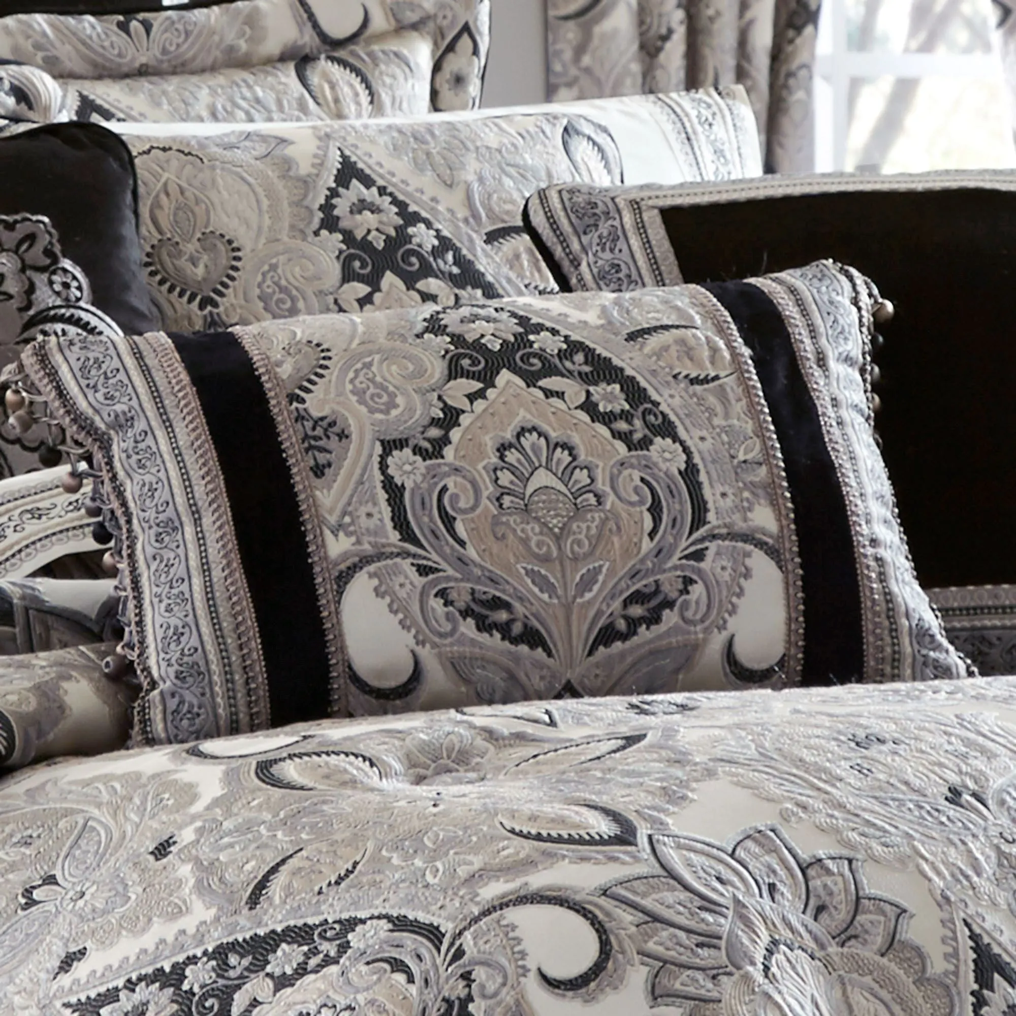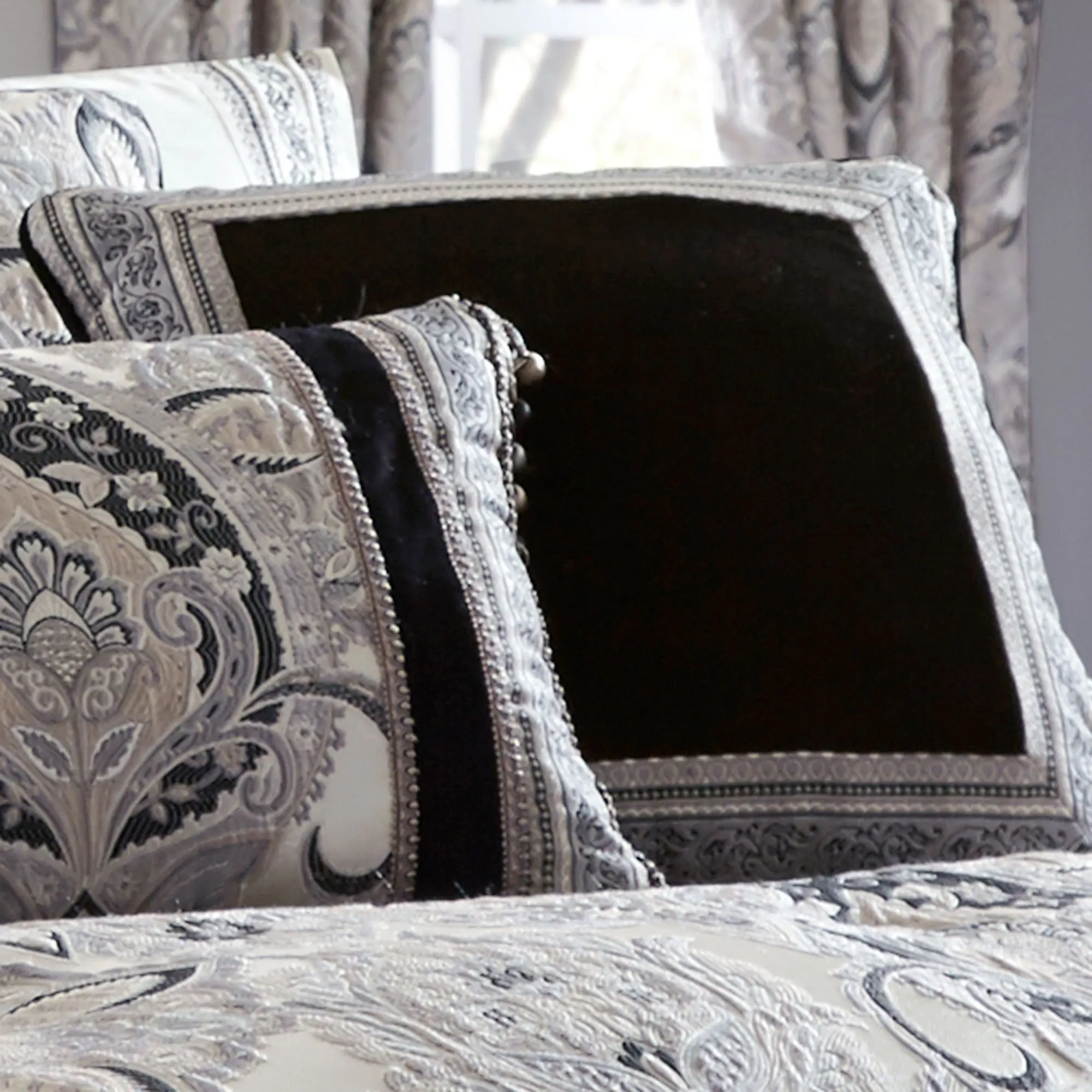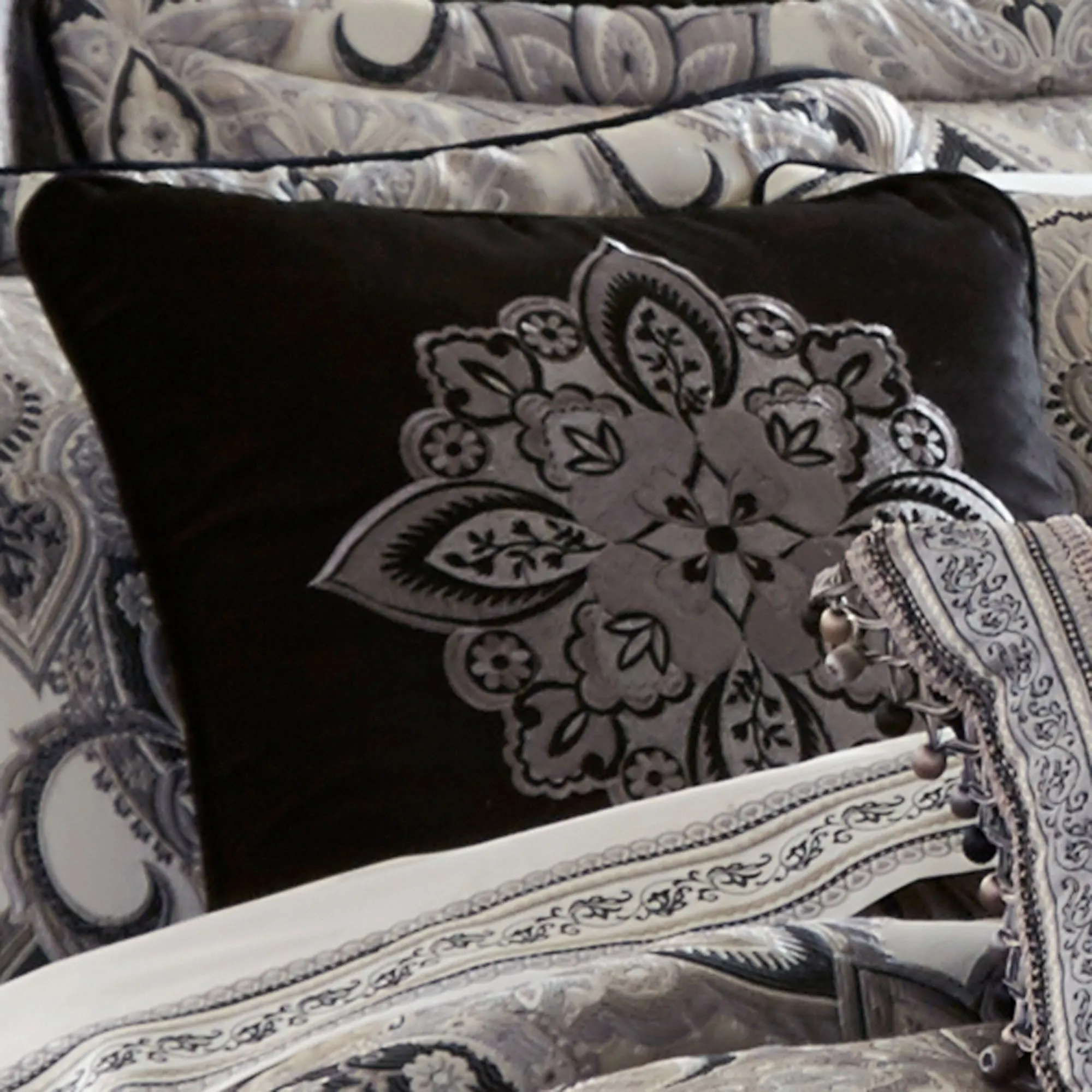 Pillows are polyester with polyester fill. Spot clean. The Embroidered 18" Square has a coordinating embroidered medallion on black velveteen with piped edges. The Piped Framed 18" Square has black velveteen pieced and framed with mitred coordinating trim and piped edges; reverses to coordinating jacquard-woven stripes and scrolls. The Piped 20" Square mimics the comforter face with piped edges; reverses to jacquard-woven diamond latticework. Rectangle has a comforter-match center pieced with black velveteen bands with gimp trim and jacquard-woven stripes and scrolls; ball tassels are on length ends.