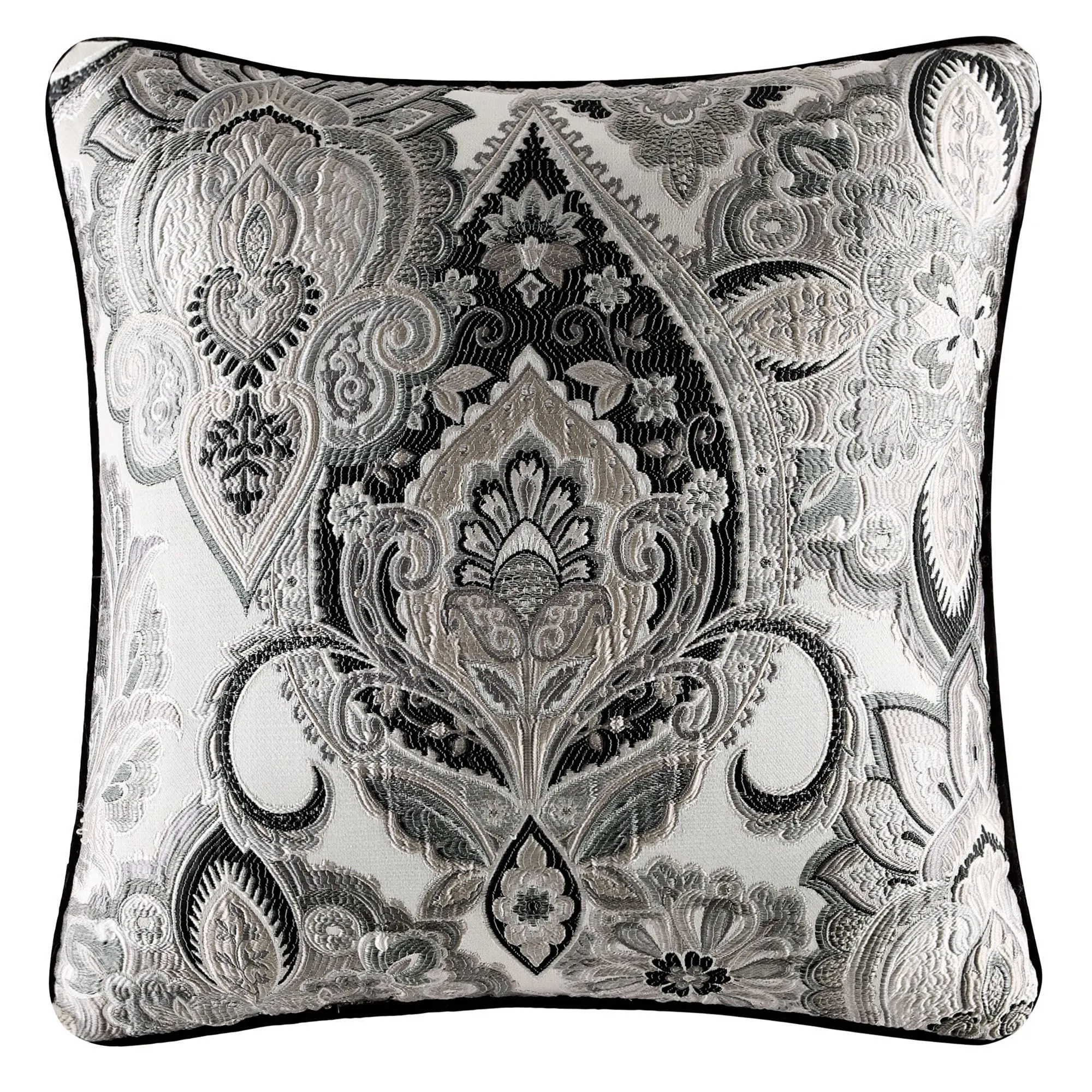 European Sham has black velveteen framed in mitred coordinating trim and piped edges; reverses to a jacquard-woven diamond latticework; zipper closure.