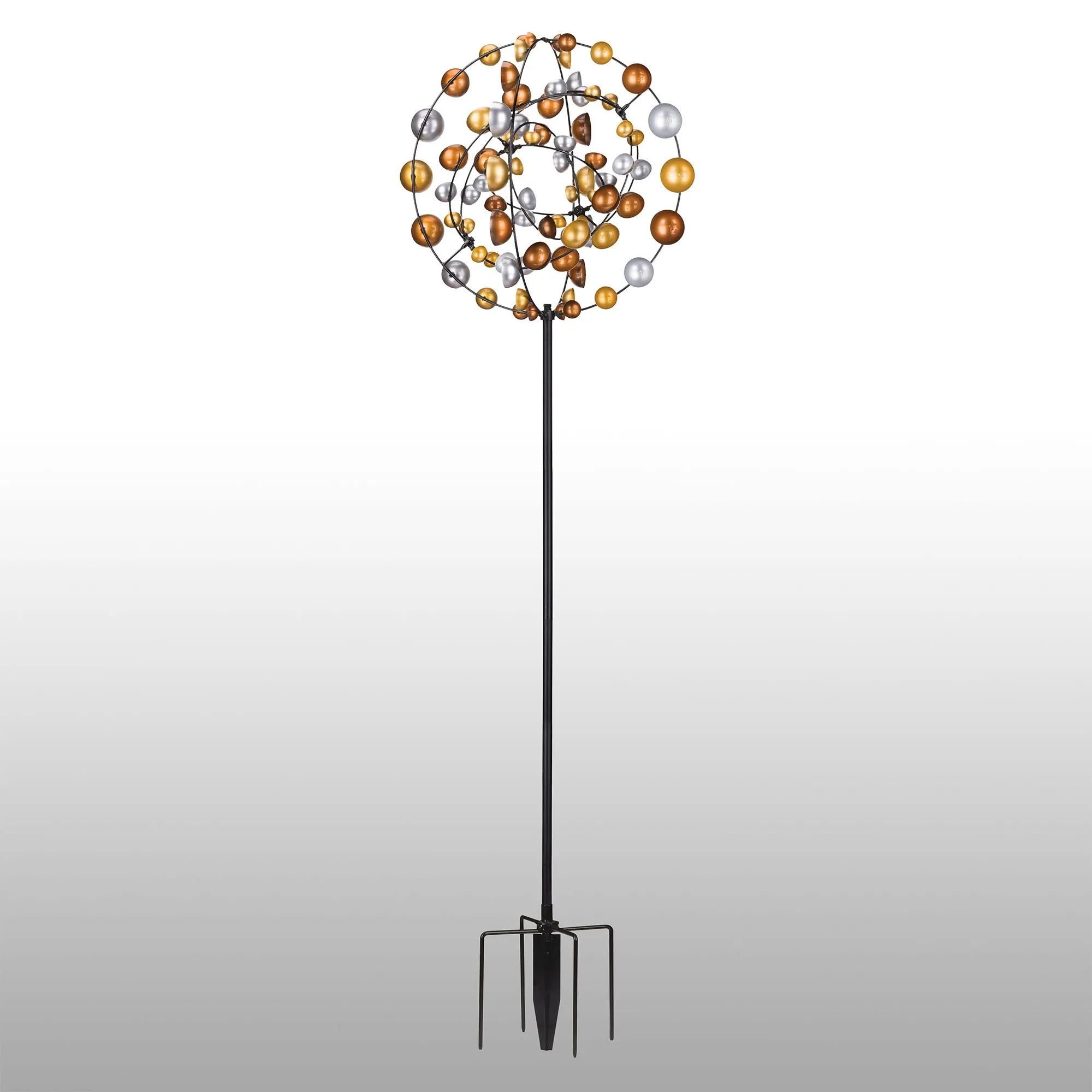 The Gyroscope Wind Spinner adds a hypnotizing element to your outdoor space. In silver, gold, and bronze powder-coat finishes, the metal design features six concentric circles crafted from wind cups. These circles spin independently of each other, creating a mesmerizing visual performance. For outdoor year-round use. Mounted on a pronged ground fork for stability, the wind spinner measures 26"dia.x86"H overall and weighs approx. 11 lbs.
