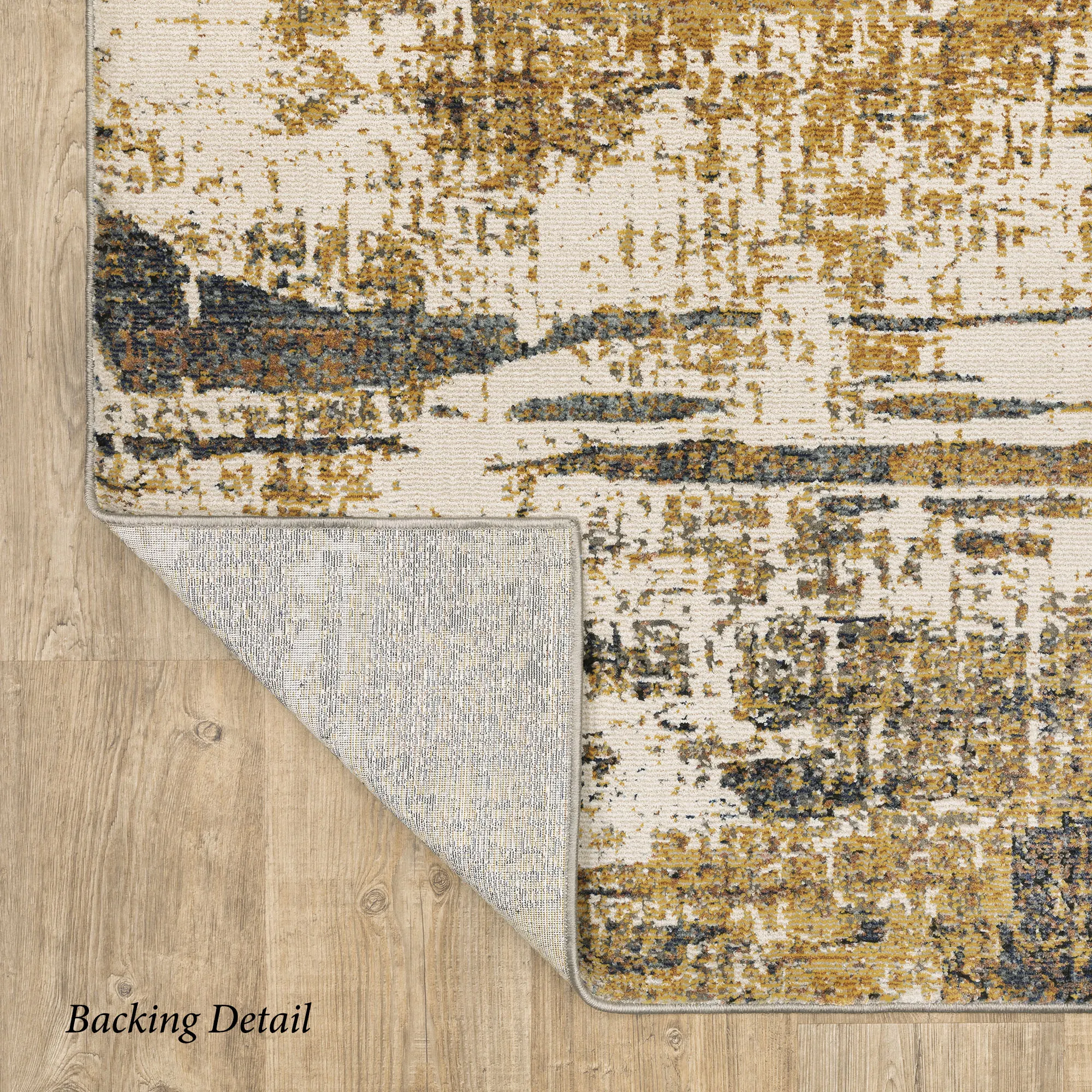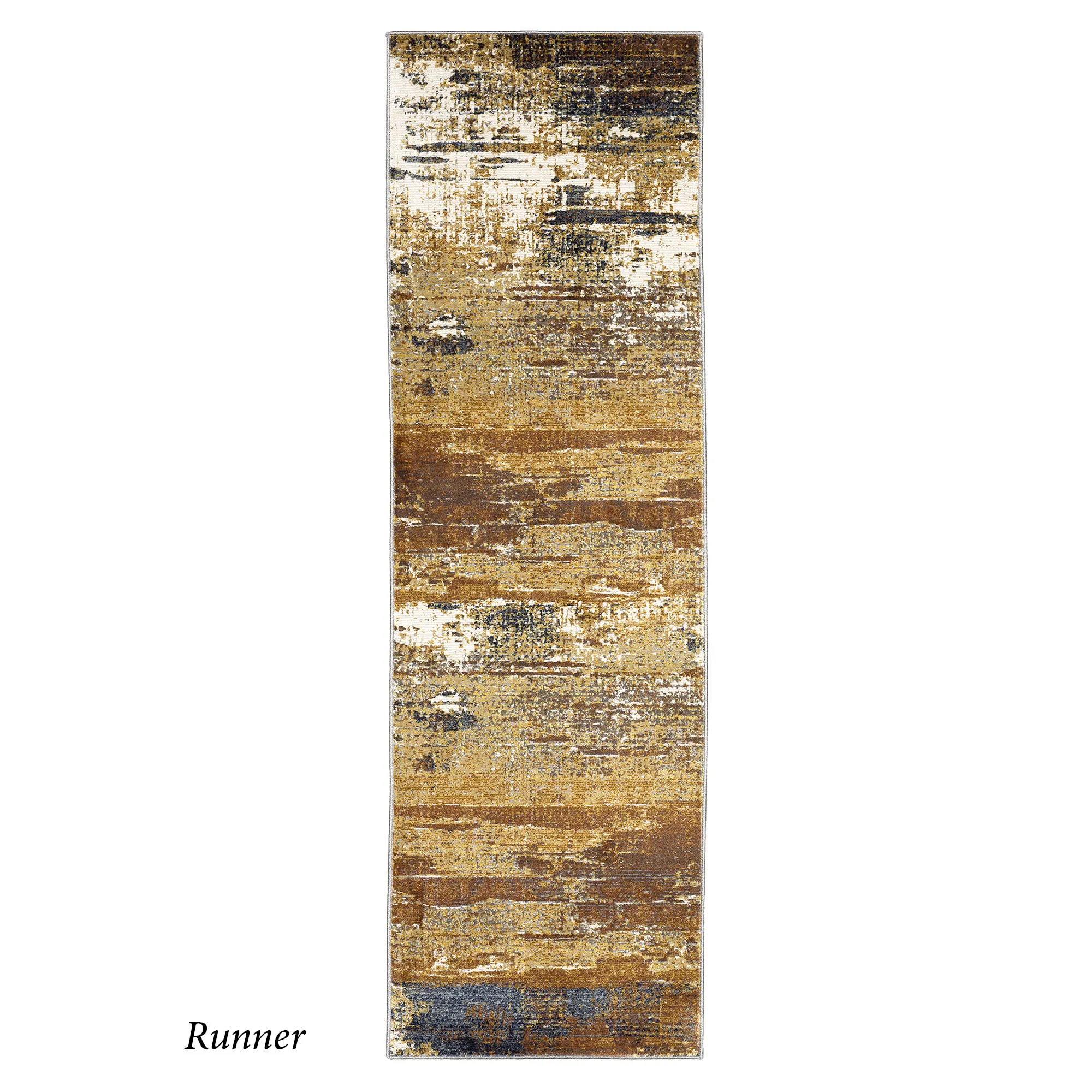 Mingled shades of rust, ivory, blue, and golden yellow uniquely blend in an abstract pattern on the Haider Rug. Power-loomed polyester area rug, .31" thick, has a marble-like design. We recommend professional cleaning by a rug cleaner. Imported.