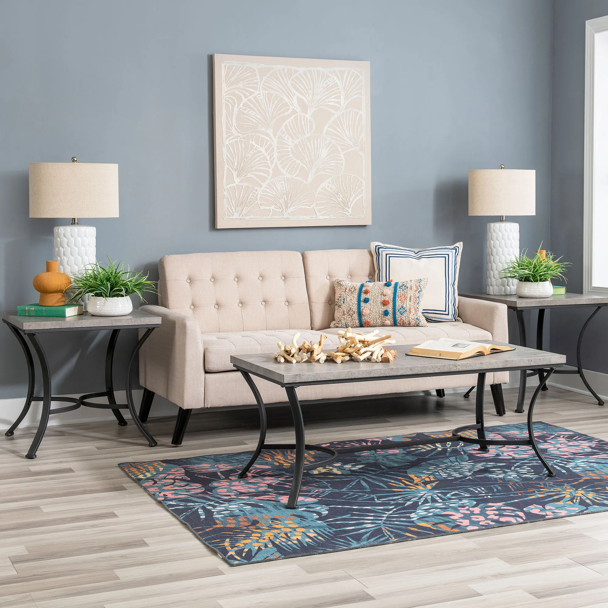 Decorate with the modern look of the Halina Table Set. The three-piece set includes one coffee table and two end tables. Each table has a black powder-coated metal base with flared legs, along with a gray, faux concrete-look on the wooden tops. Each end table is 24"sq.x23"H, and the coffee table is 48"Wx24"Dx19"H. The maximum recommended weight is 200 lbs. for the coffee table and 50 lbs. for each end table. Overall, the set weighs 67 lbs.