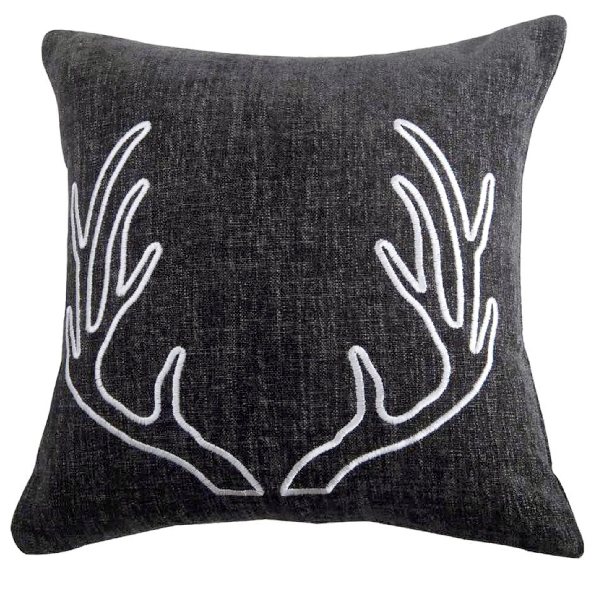 Pillows are reversible with hidden zipper closures and polyester inserts. Spot clean. Tailored Square is chenille framed with tweed and a laced rope detail; reverses to chenille. Embroidered Square is chenille with white antler embroidery, tailored edges, and a solid chenille reverse. Piped Rectangle is cotton/polyester houndstooth with a horizontal decorative zipper accent; reverses to houndstooth.