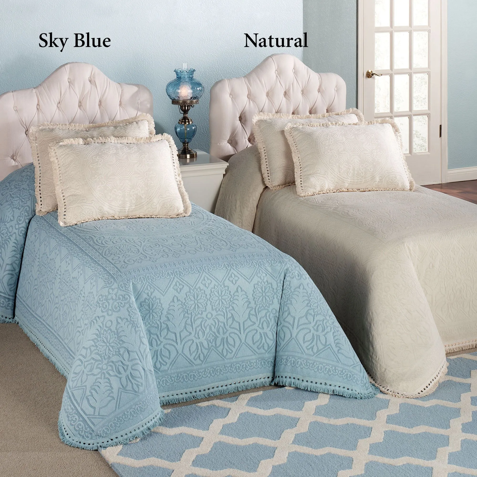 Fringed Bedspread features a woven center medallion on the top of the bed, surrounded by floral scrolls. The 21" drop has floral medallions with a scrolling border. Fringe on three sides is 100% cotton. For bedspreads, specify Twin, Full, Queen, or King.