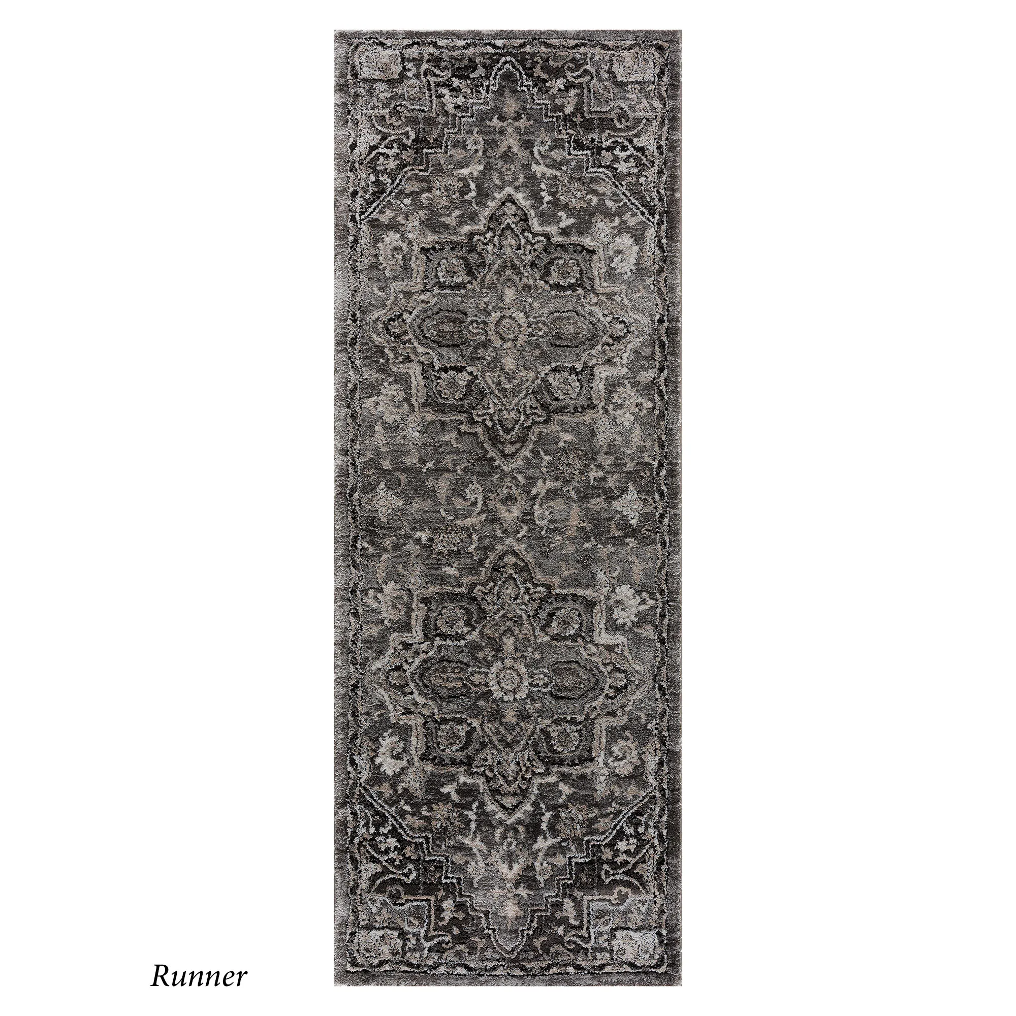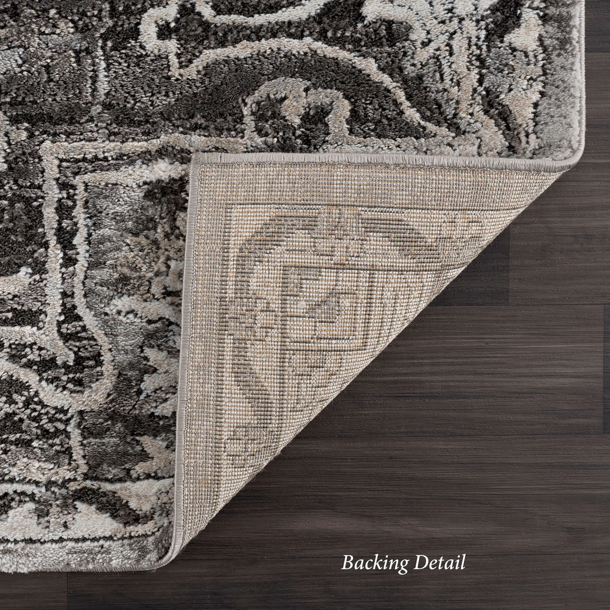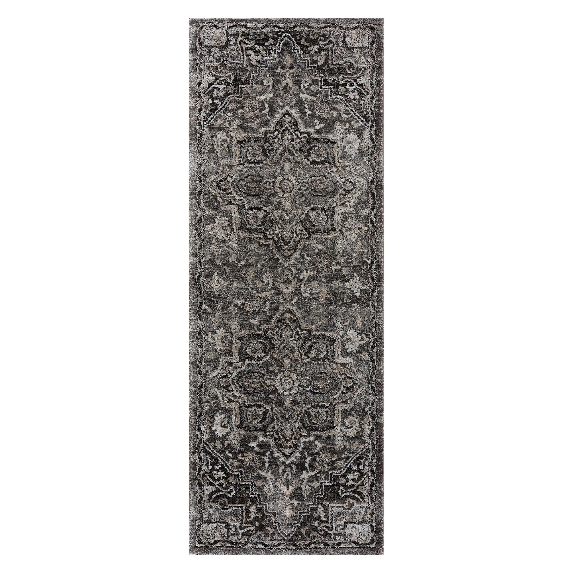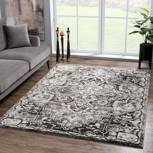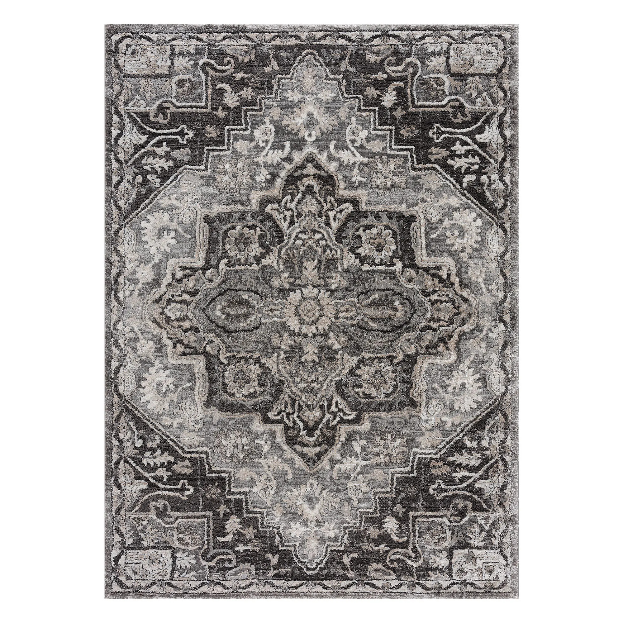 The Hannah Area Rug exudes a traditional design in classic grayscale hues. Power-loomed from a polyester/polypropylene blend, the .71" thick rug features a unique hi-low texture throughout a charcoal, gray, beige, and ivory intricate medallion design. We recommend professional cleaning by a rug cleaner. Imported.