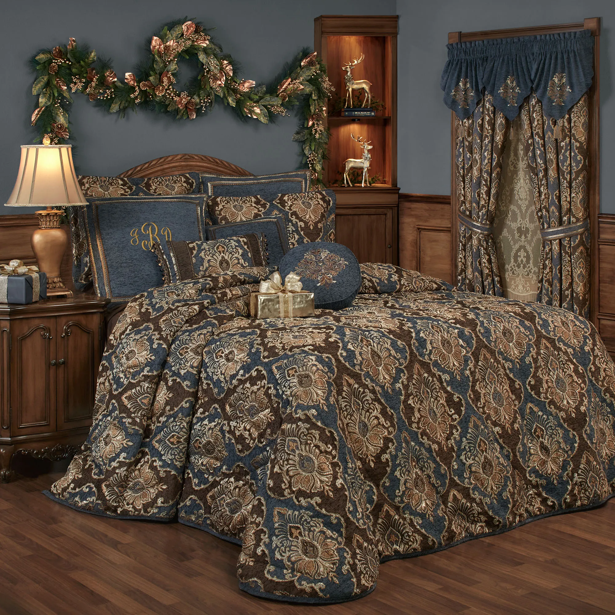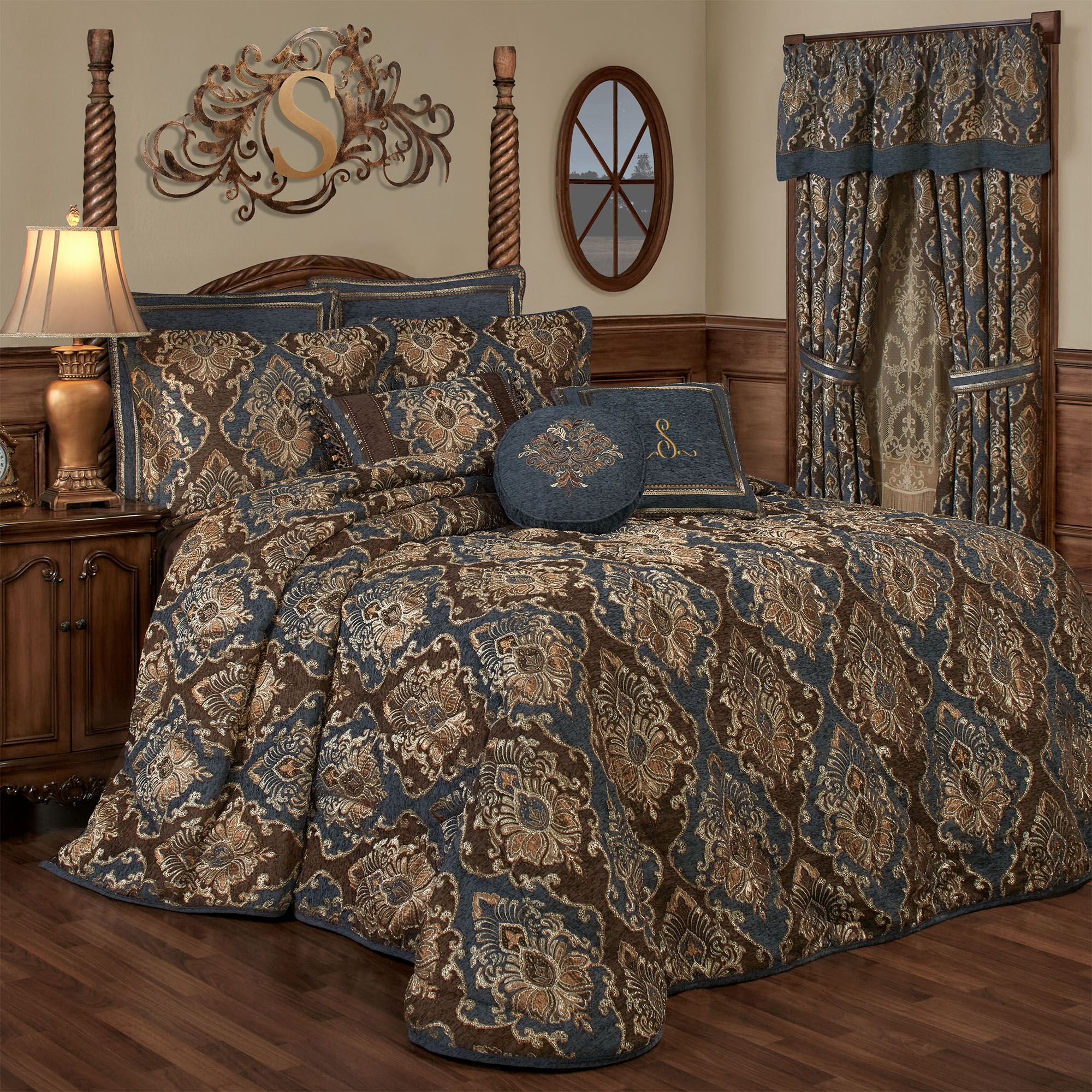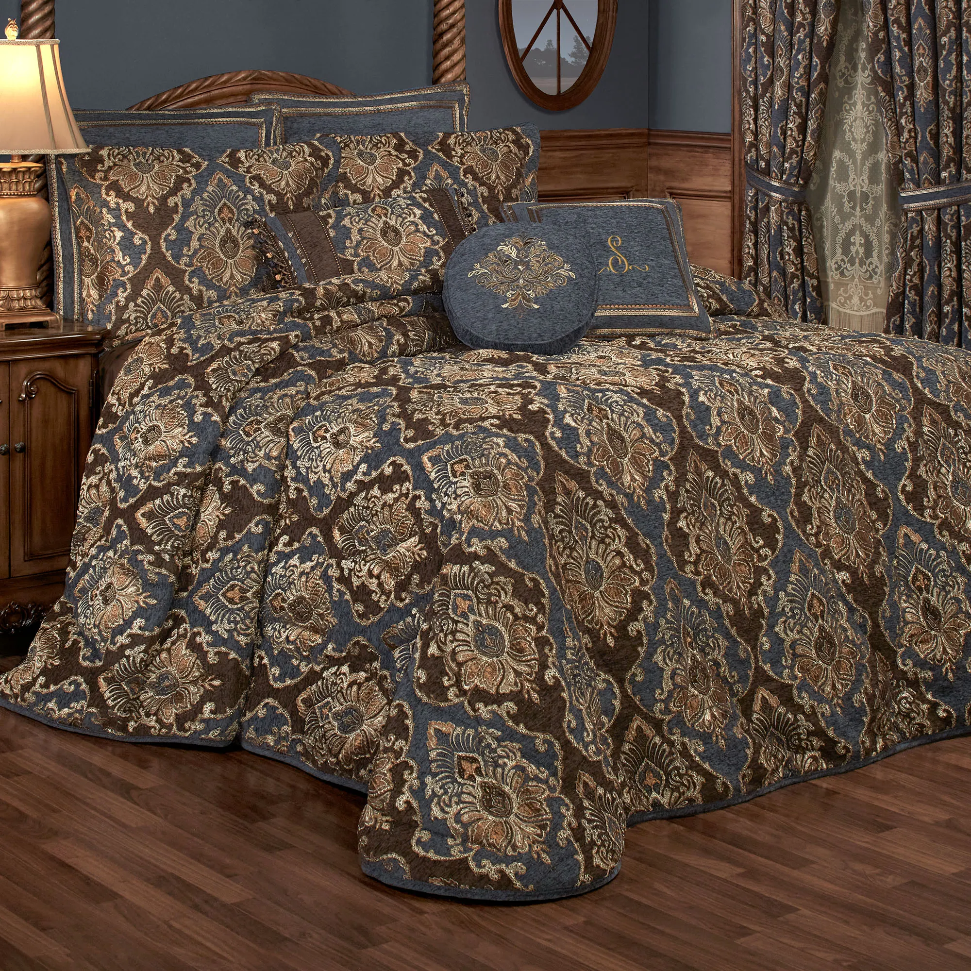 The Hanover Grande Damask Bedspread glistens with the subtle shimmer of golden tones. The jacquard-woven polyester bedspread features gold-hued damask designs throughout blue and chocolate chenille. Oversized bedspread has wavy channel quilting, a 24" drop, and a chocolate polyester microfiber back. Fill is polyester. Dry clean only. Imported.
