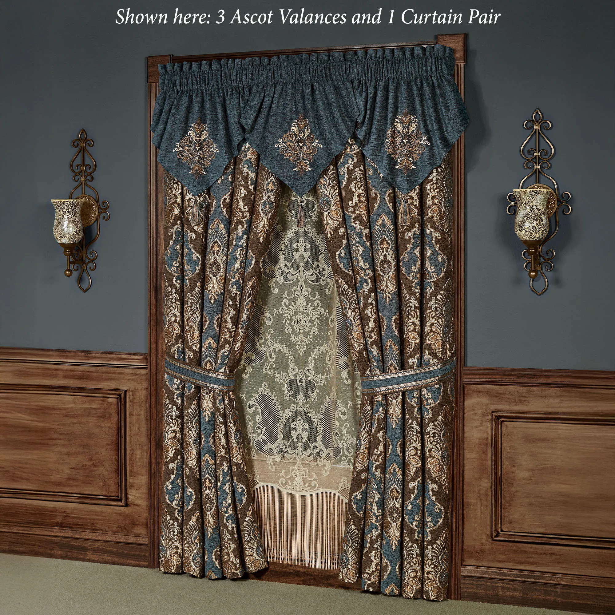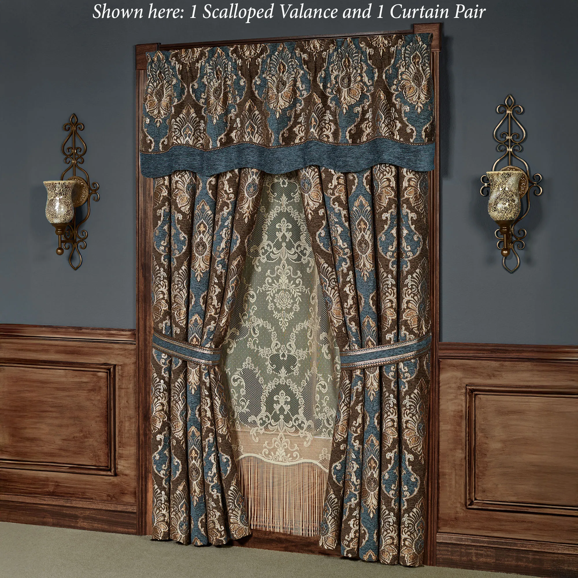 Lined Window Treatments have tailored edges and 3" rod pockets. Wide Curtain Pair has damask and includes tiebacks. Each Ascot Valance is blue chenille with gold embroidered damask and a tassel accent. Scalloped Valance has a damask top pieced with gimp trim and a blue chenille bottom.