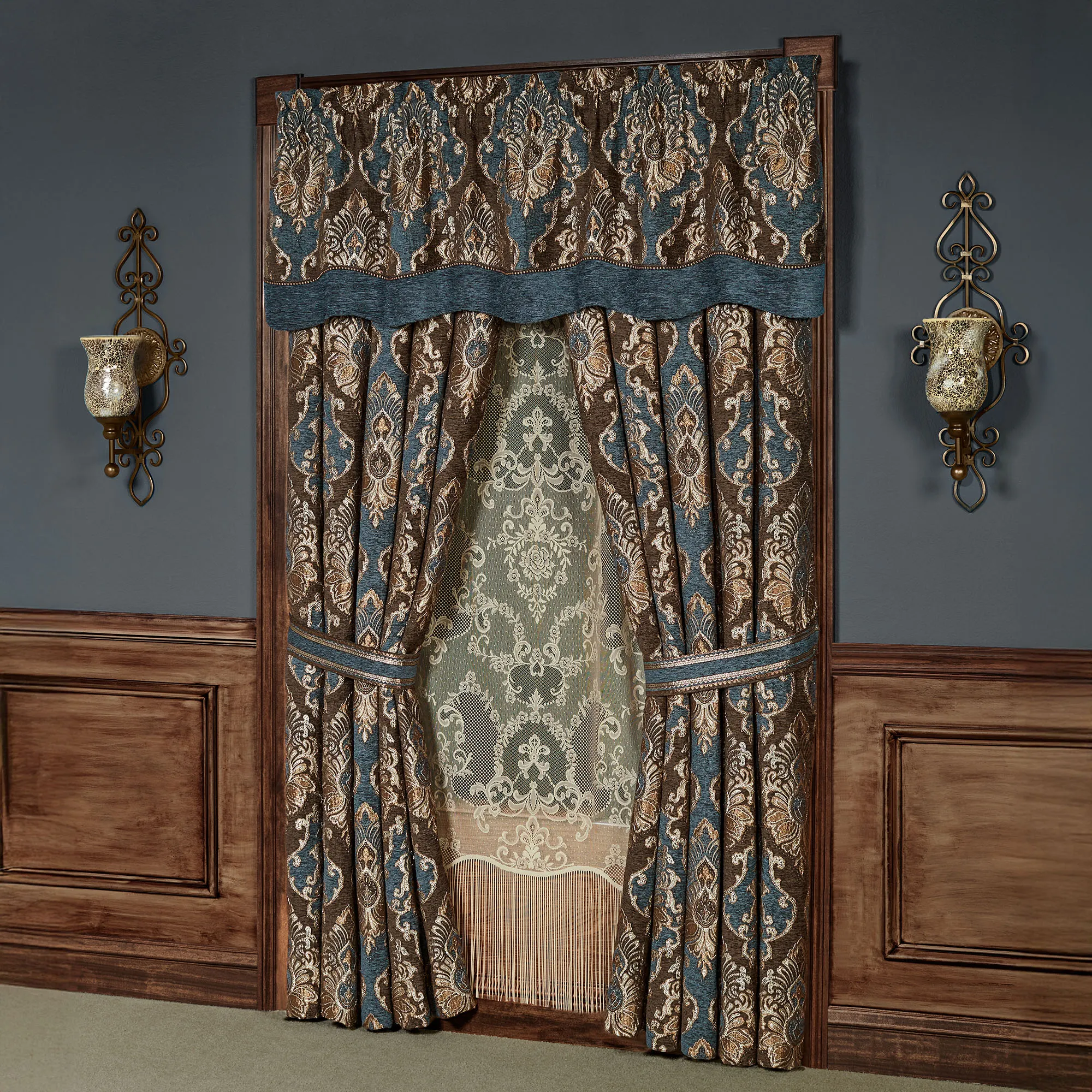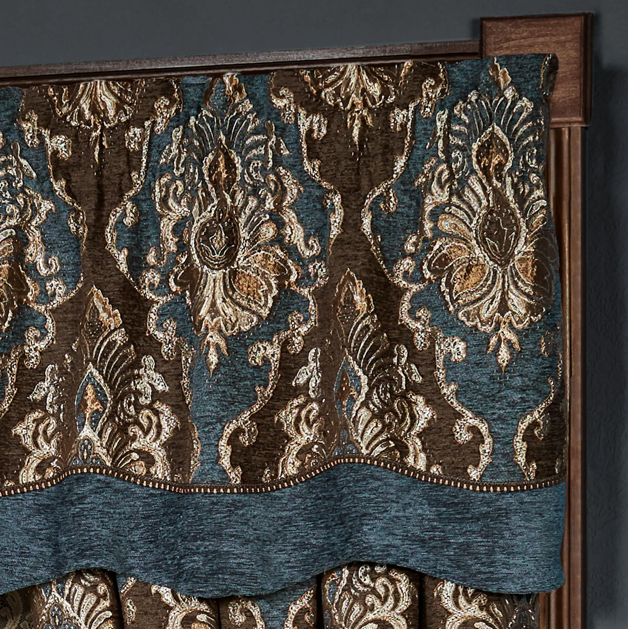 The Hanover Damask Window Treatment glistens with the subtle shimmer of golden tones. The jacquard-woven polyester window treatment features gold-hued timeless damask designs throughout blue and chocolate chenille. The lined window treatment has tailored edges and 3" rod pockets. Specify Scalloped Valance or Wide Curtain Pair. The Scalloped Valance has a damask top pieced with gimp trim and a blue chenille bottom. The Wide Curtain Pair includes tiebacks. Dry clean only. Imported. The curtain pair width is the total width of two panels together.
