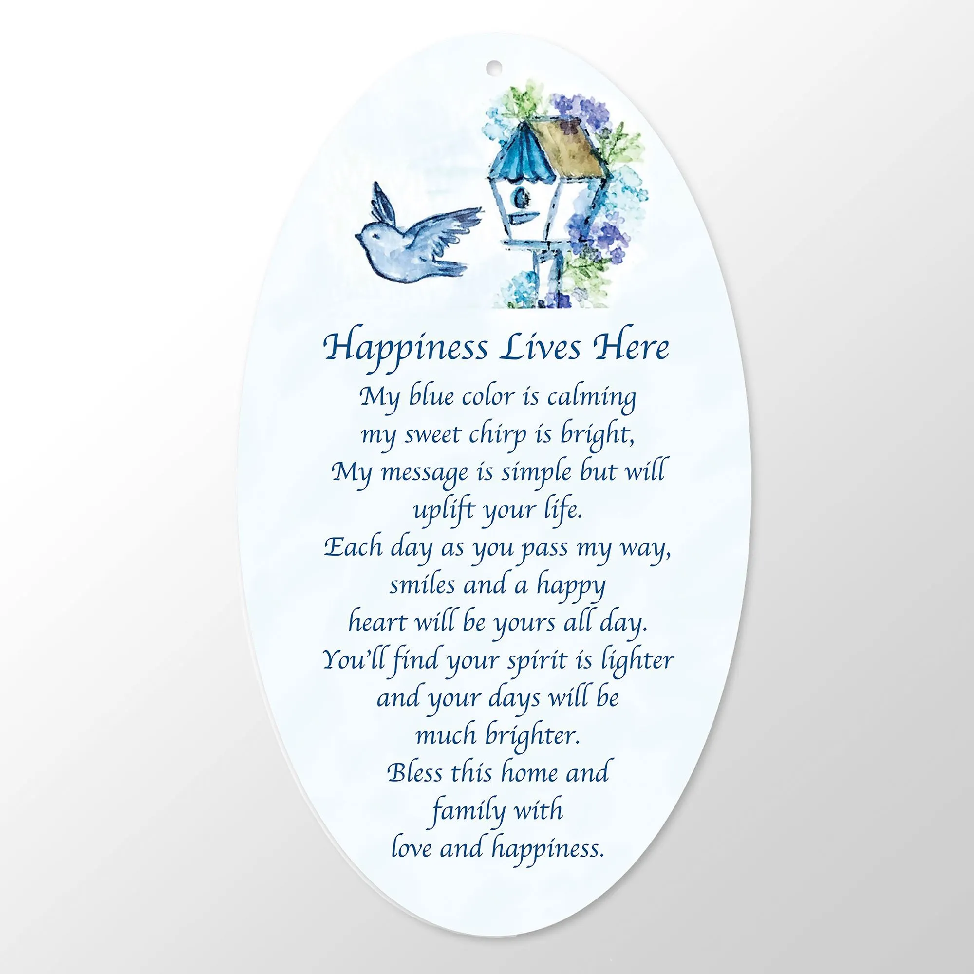The Happiness Lives Here Bluebird Ornament, from the Facets(R) Collection by Enesco(R), adds a touch of natural grace to a window or Christmas tree. With a beautifully detailed faceted design, the high-grade acrylic ornament resembles a bluebird with wings spread wide. A hanging ribbon and gold-finished metal medallion reading "Happiness Lives Here" is included. The included poem card also reads "My blue color is calming - my sweet chirp is bright, My message is simple but will uplift your life. Each day as you pass my way, smiles and a happy heart will be yours all day. You'll find your spirit is lighter and your days will be much brighter. Bless this home and family with love and happiness." Measures approx. 5"Wx4"Dx3"H; dimensions do not include the 4"L ribbon hanger.