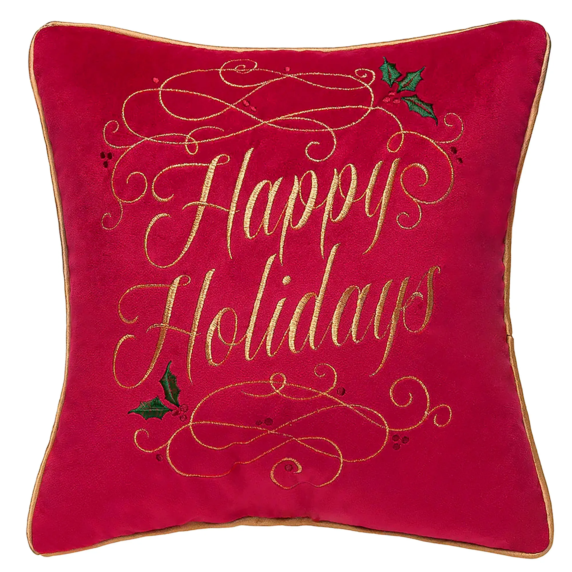 Display sweet sentiments this season with the Happy Holidays Decorative Pillow. This red polyester pillow has intricate embroidered swirl designs and "Happy Holidays" in metallic gold along with green holly leaves and red berries. Gold piping accents the edges. Measures 16". Fill is polyester. Spot clean. Imported.