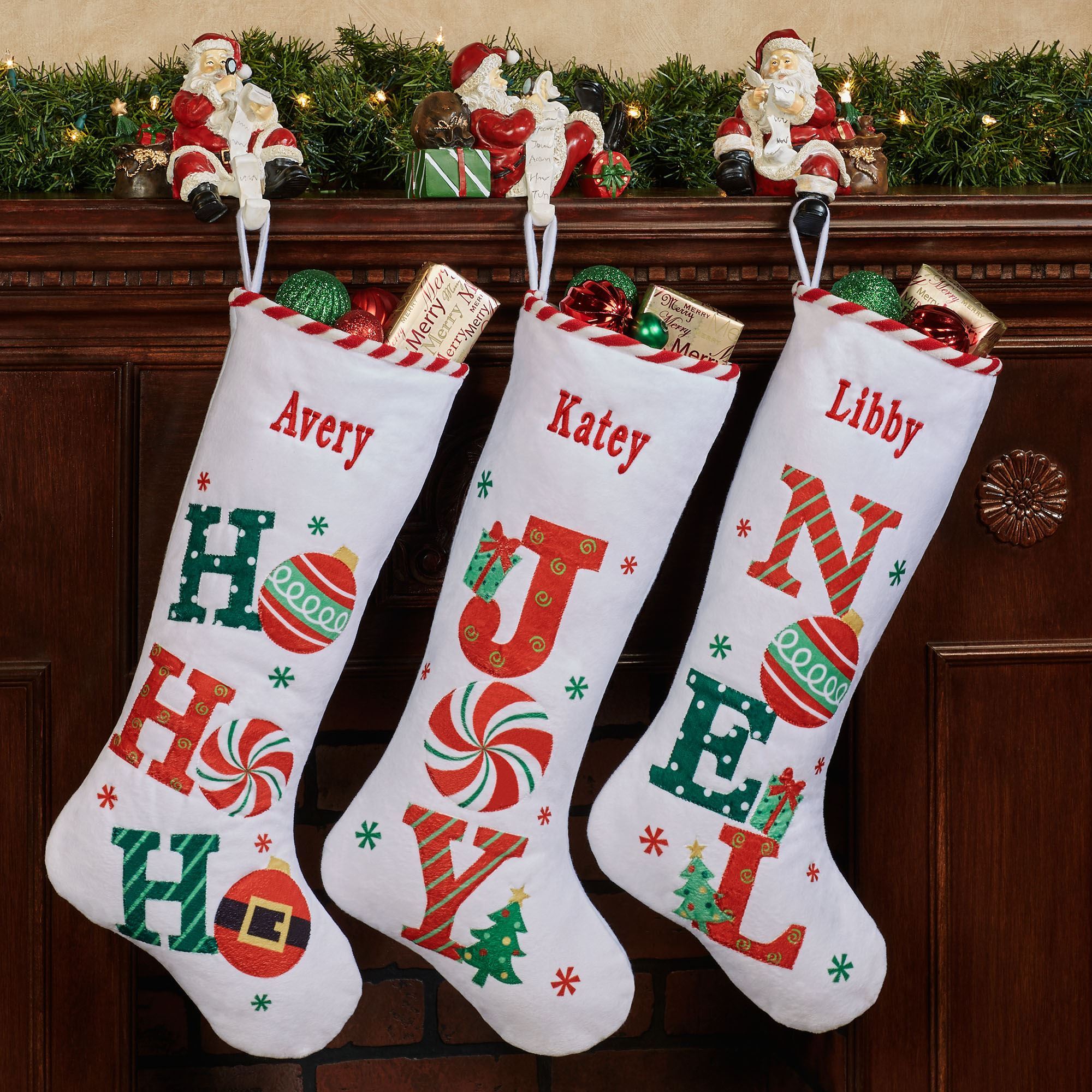 Decorate your home with classic words found during the happiest of Happy Holidays. Topped with twisting red and white, each white velour polyester stocking features a festive word design crafted from fun polka dotted, spiral, and striped patterns. Peppermints or ornaments craft each "o," while snowflakes decorate the background. Personalization is available, as shown, for FREE! Click on the burgundy "i" icon below the item name for more information. With an attached loop for hanging, each stocking measures 7"Wx22"L. Christmas stockings are sold individually. Spot clean. Imported.