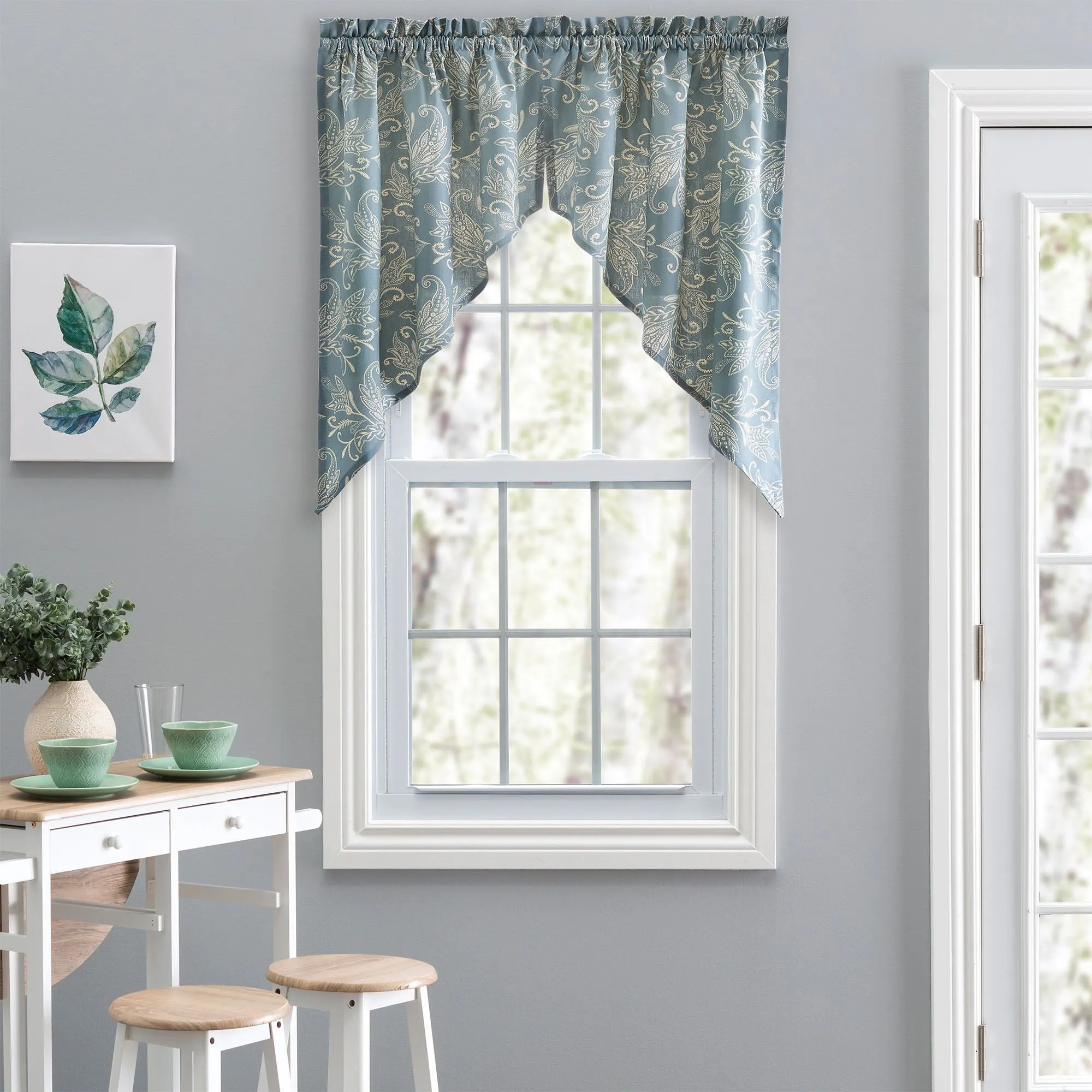 Lovely leaves flourish with traditional grace upon the Harlan Window Treatment. The cotton/polyester designs feature light cream patterns. All items, except the Curtain Pair and Scalloped Valance, have 1.5" rod pockets. Specify Curtain Pair, Swag Valance Pair, Tailored Valance, or Scalloped Valance. Curtain Pair has a 3" rod pocket and includes tiebacks. Lined Scalloped Valance has a 3" rod pocket and piped edges. Machine washable. Made in Pakistan. The curtain pair width is the total width of two panels together.