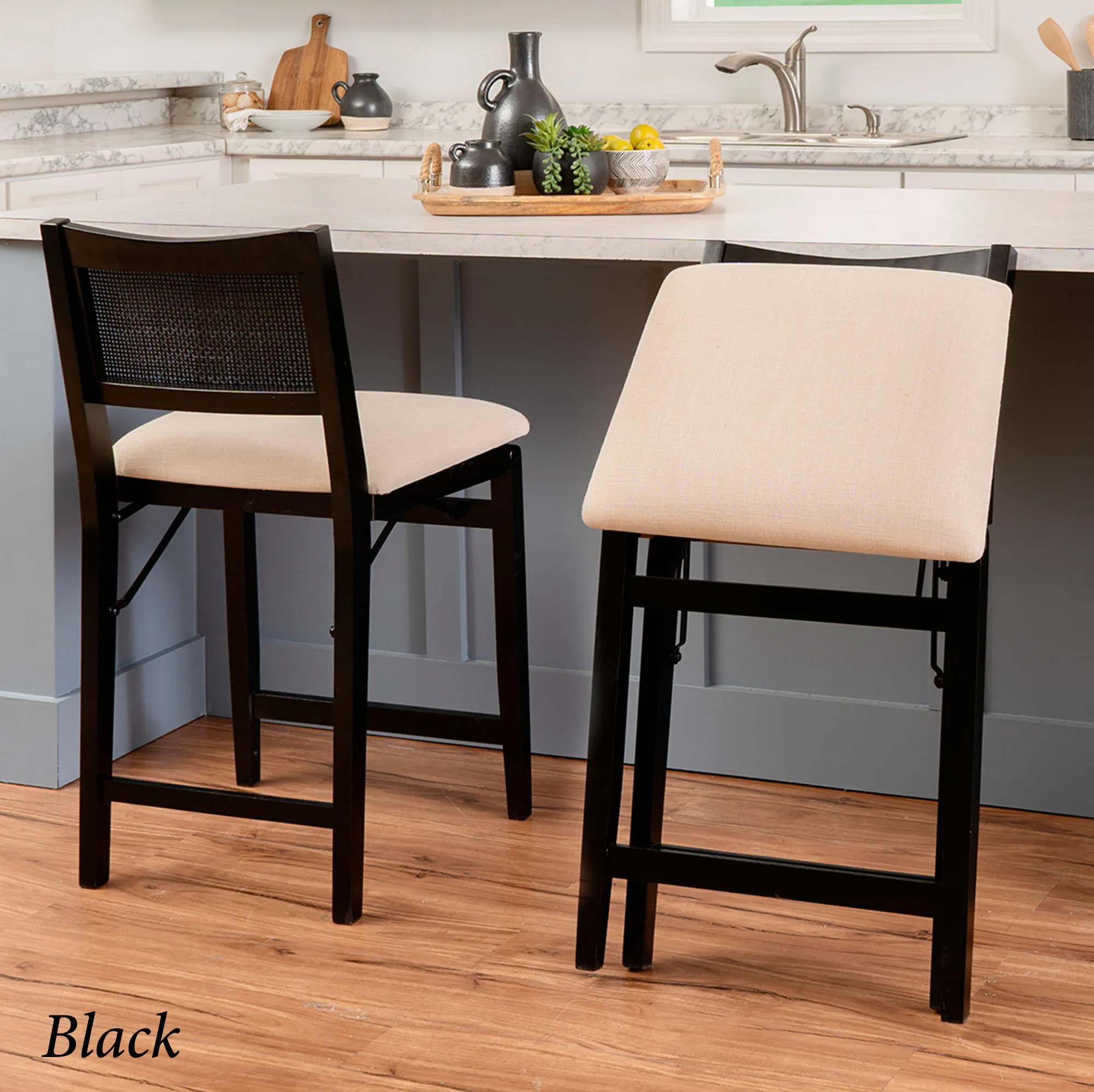 The Harlan Folding Counter Stool is wooden, foam, and polyester. Imported.
