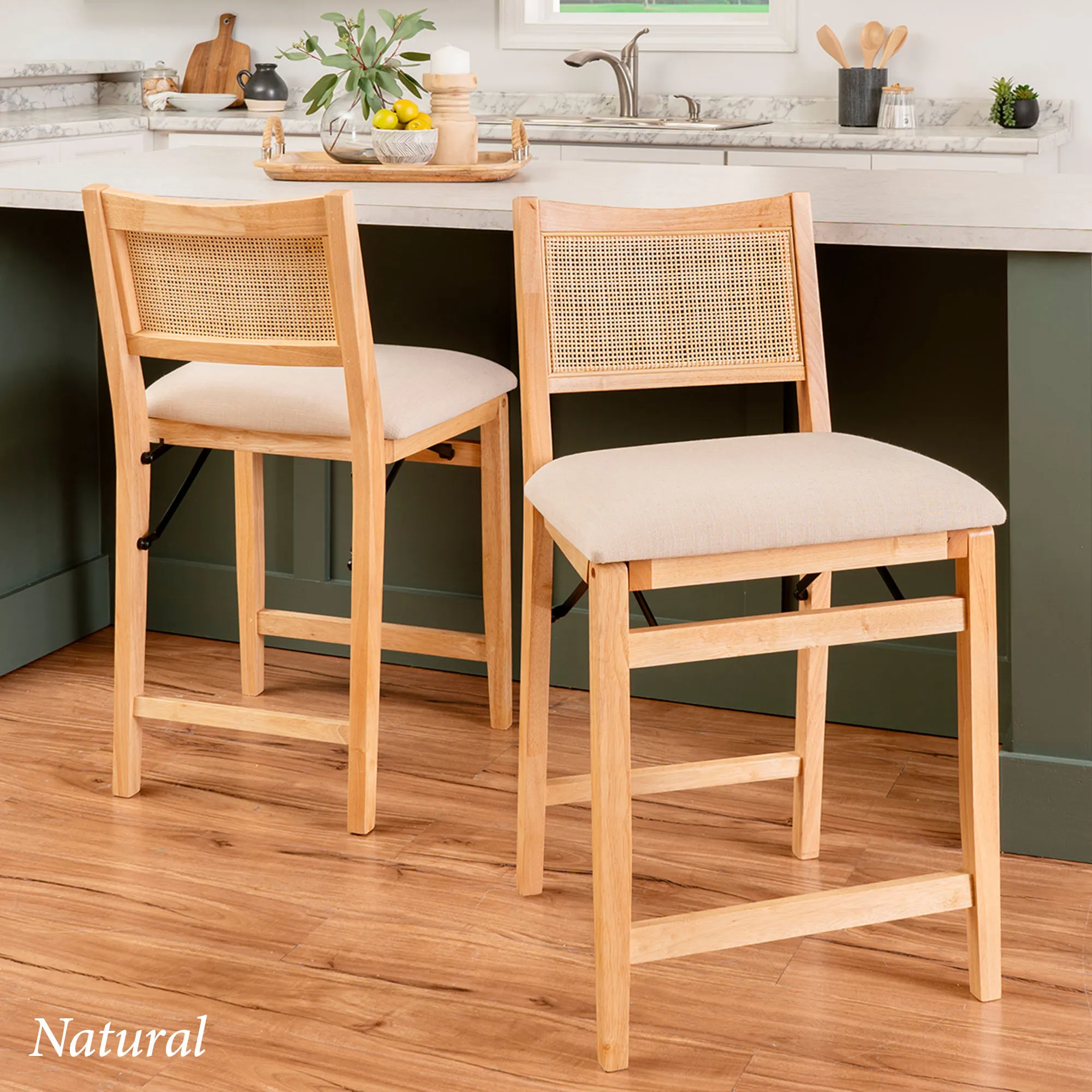 Add extra seating and undeniable style with the Harlan Folding Counter Stool. Capable of folding flat when not in use, the tall stool features a chic design with sleek lines, a rattan-style back, a comfortable footrest, and a foam-filled upholstered seat. The light beige, woven polyester cushion provides a neutral accent to complement your space. Seat height is 26". Maximum recommended weight is 300 lbs. Overall, the wooden folding stool measures 20"Wx21"Dx38"H and weighs approx. 17 lbs. Spot clean the cushion.