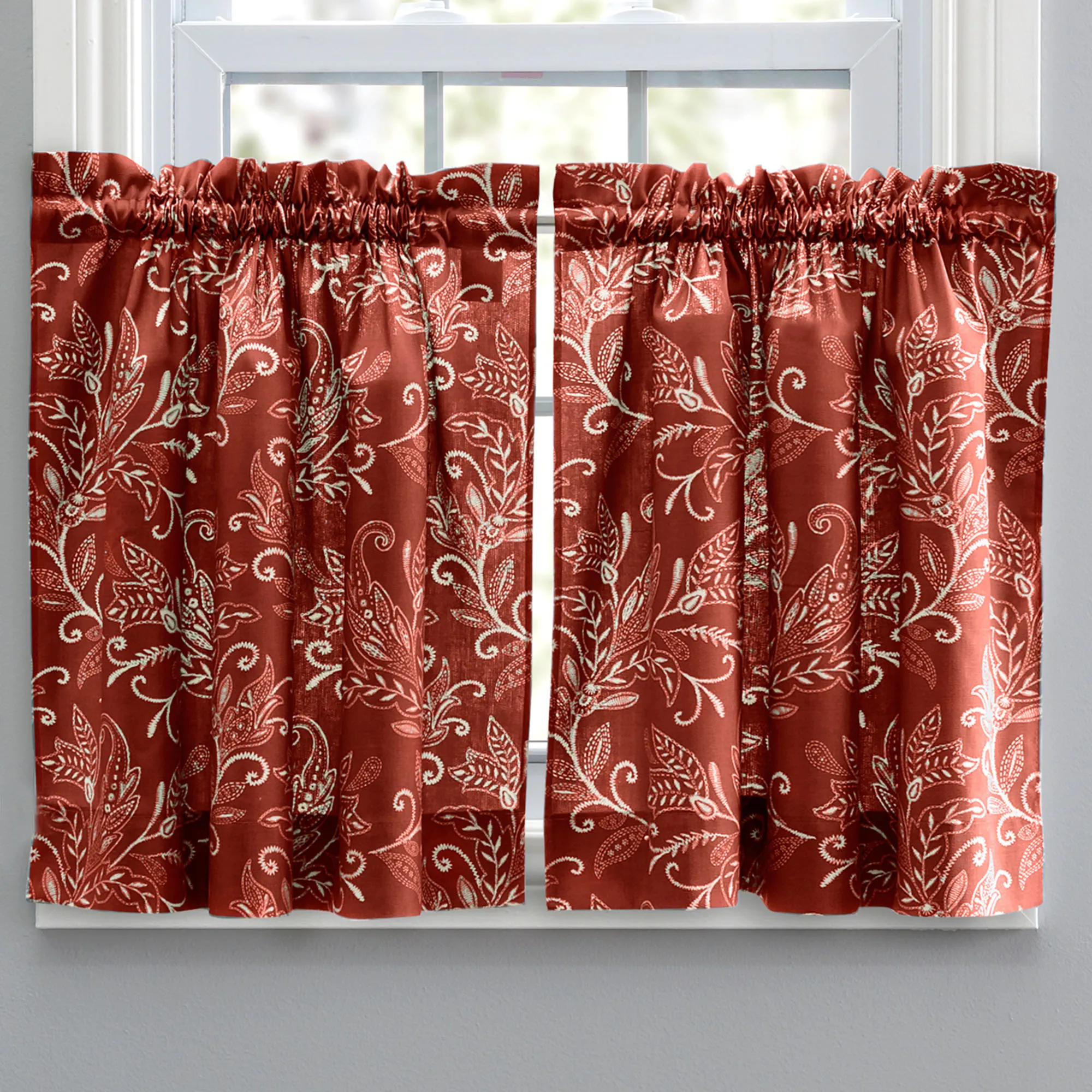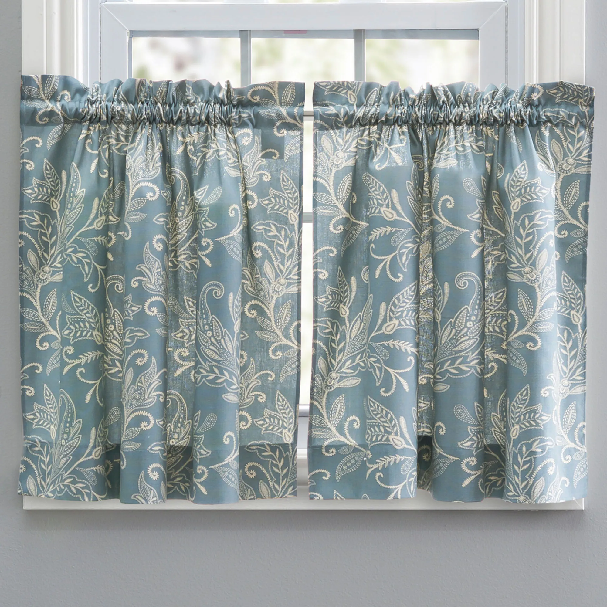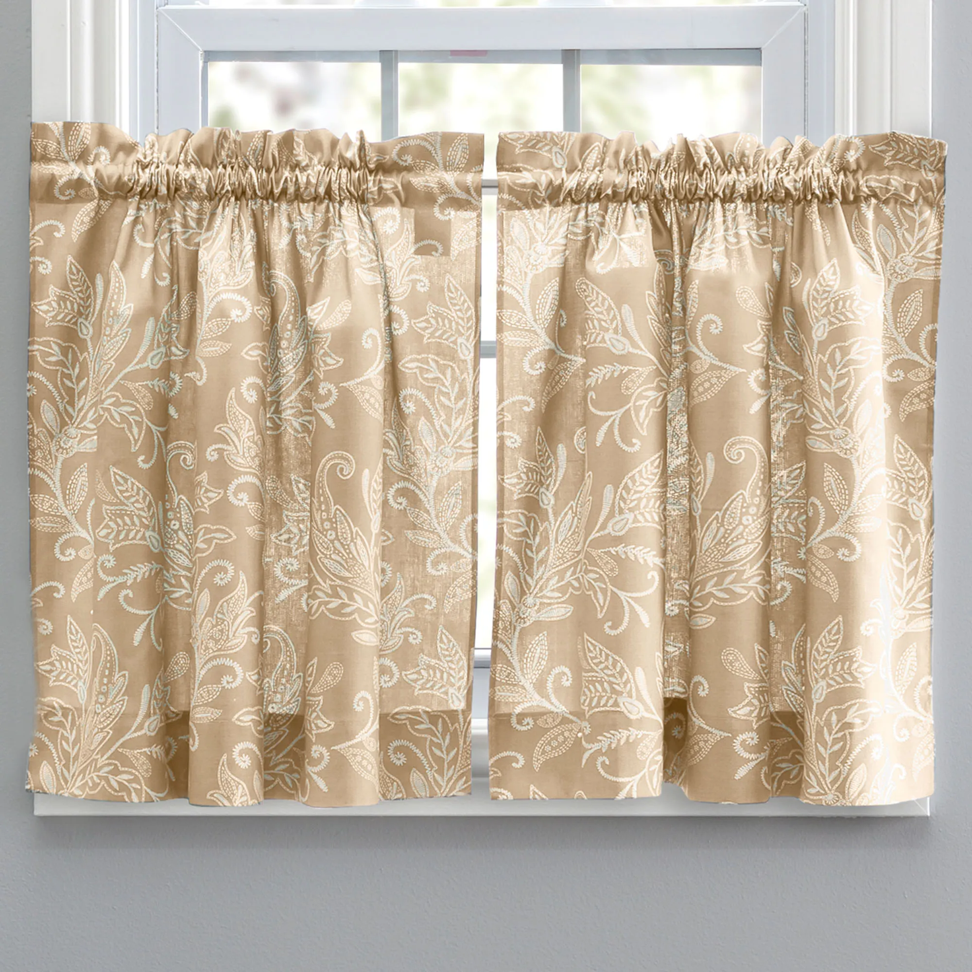 Lovely leaves flourish with traditional grace upon the Harlan Tier Window Treatment. The cotton/polyester designs feature light cream patterns. All items, except the Scalloped Valance, have 1.5" rod pockets. Specify Tier Pair, Tailored Valance, Swag Valance Pair, or Scalloped Valance. Lined Scalloped Valance has a 3" rod pocket and piped edges. Machine washable. Made in Pakistan.