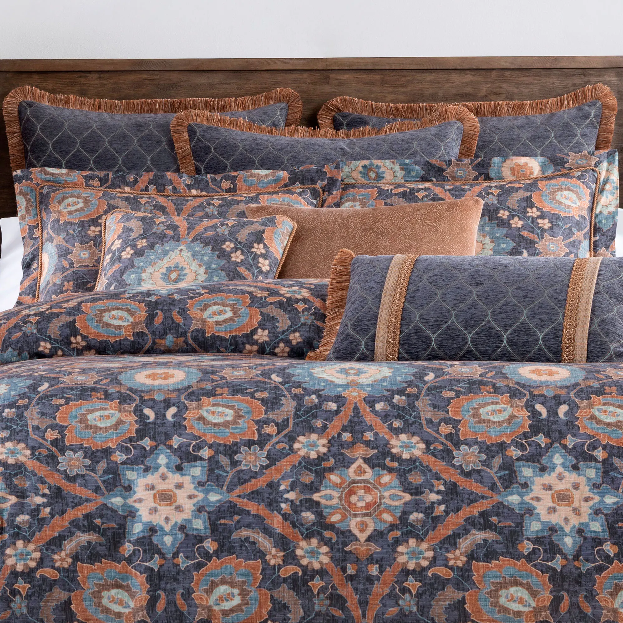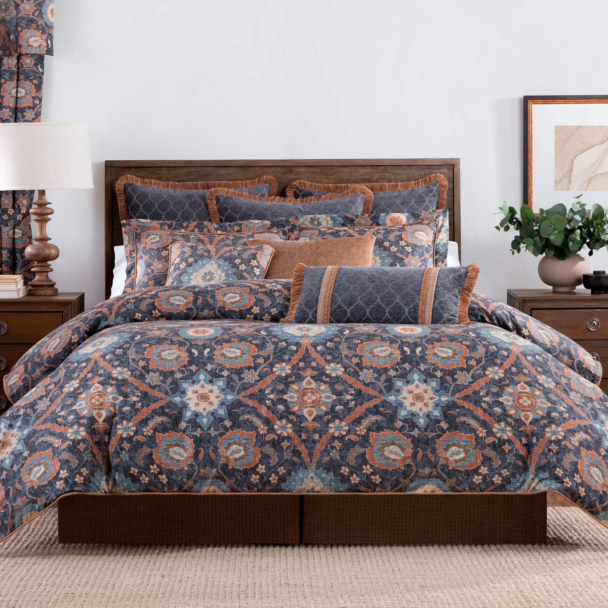 Kaleidoscopic wonder patterns the charming Harlow Bedding with a fusion of timeless and chic style. From Rose Tree, the printed cotton ensemble features bold hues of blue, brown, rust, and cream throughout the Jacobean floral and medallion designs. A blue woven ogee motif and color-coordinating fringed ends add a charming complement to the accent elements.