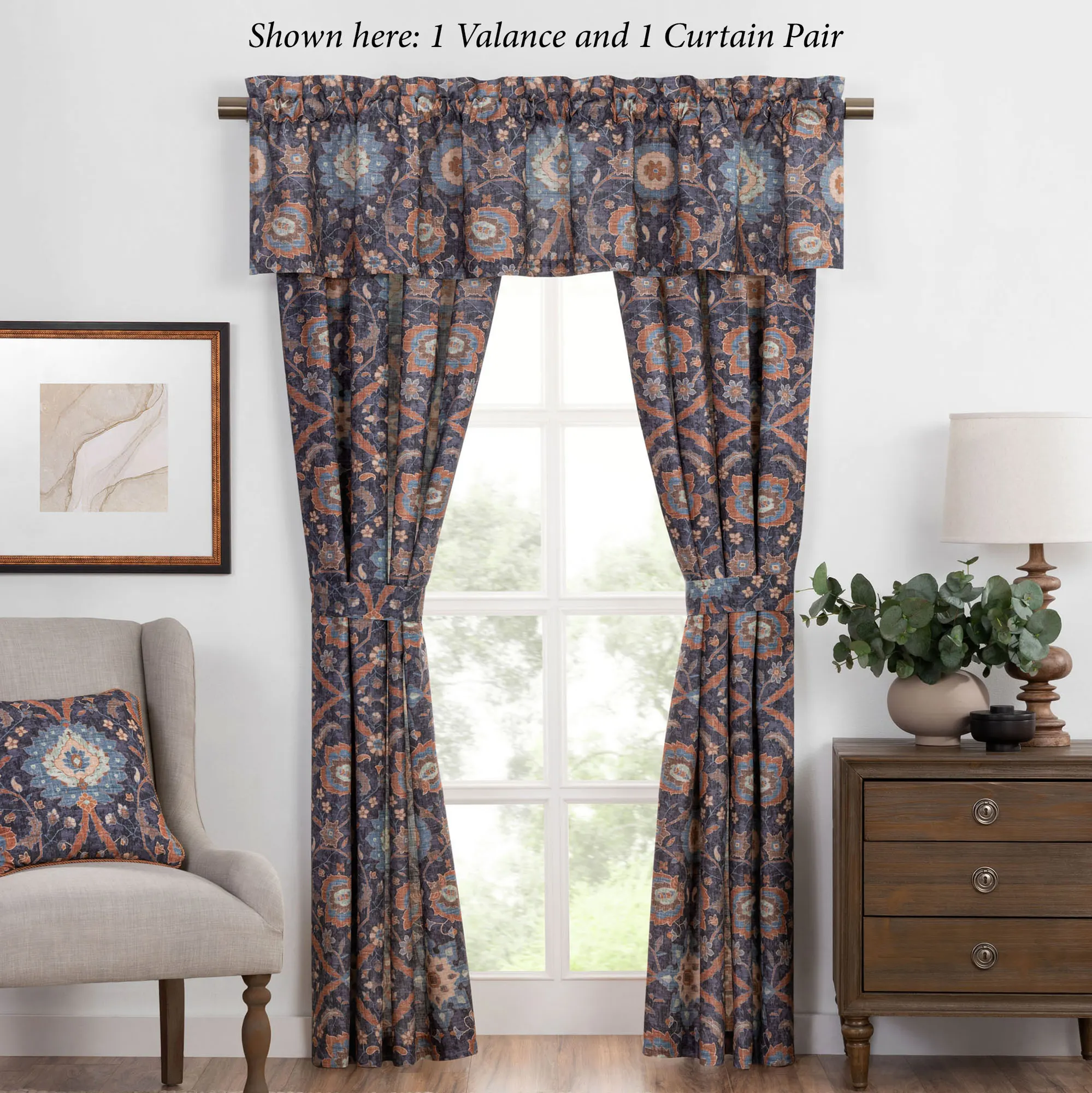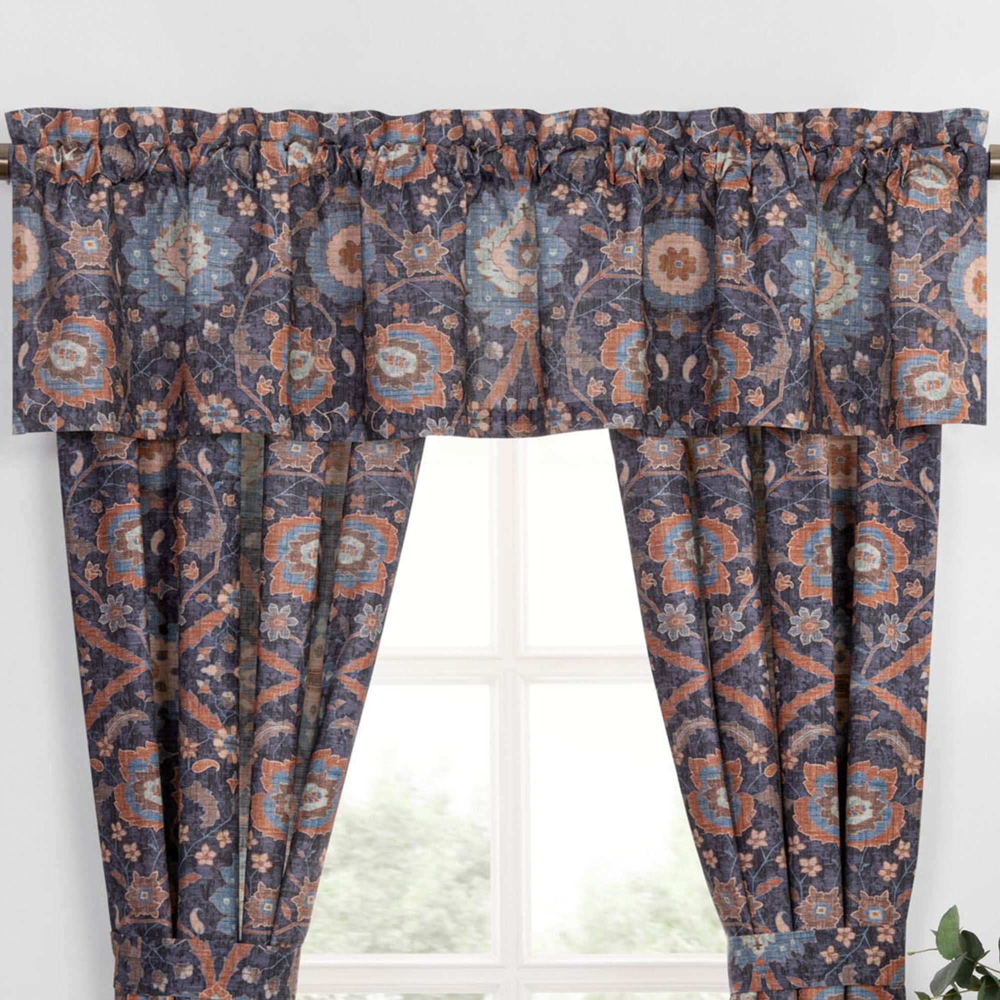 Window Treatments have tailored edges and 3" rod pockets. The lined Wide Curtain Pair includes tiebacks. Valance is also available.