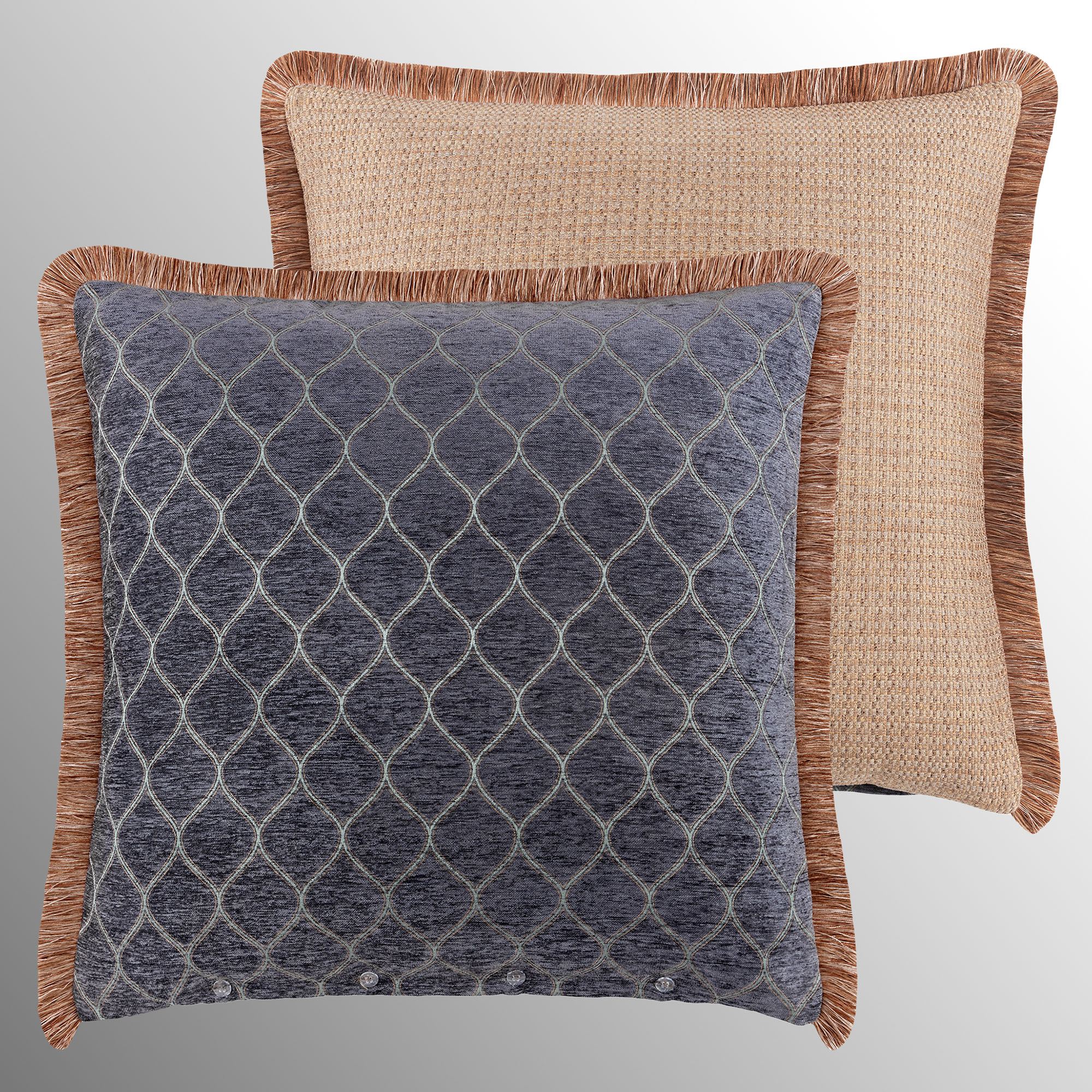 Reversible polyester Pillows have tailored edges. Spot clean. Rectangle has ogees, gimp trim accents, and fringed ends; reverses to woven rust and cream. Square is light brown ombre textured velvet.