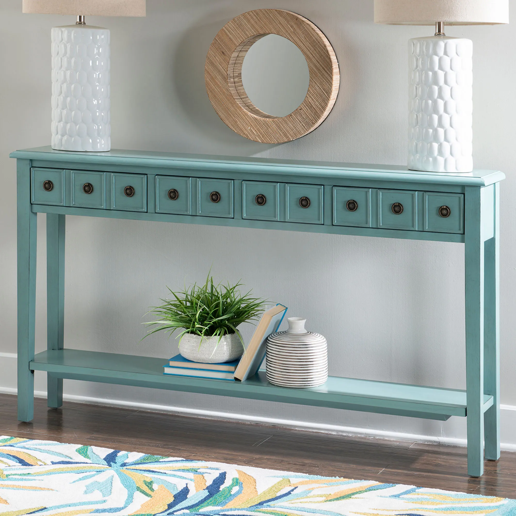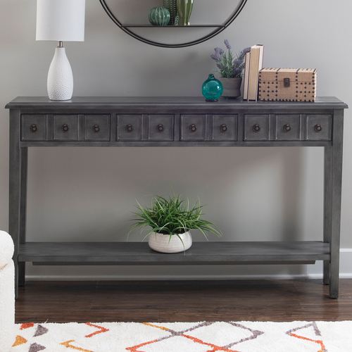 Simplistic lines and convenient storage craft the Harlow Long Console Table. In a distressed, solid color finish, the wooden table features sleek straight legs, a wide lower shelf, a beveled display top, and four drawers with charming paneled fronts. The Cream finish has wormhole distressing. Antique bronze pulls also decorate each drawer front. Overall, the console table measures 60"Wx10"Dx35"H and weighs approx. 66 lbs.