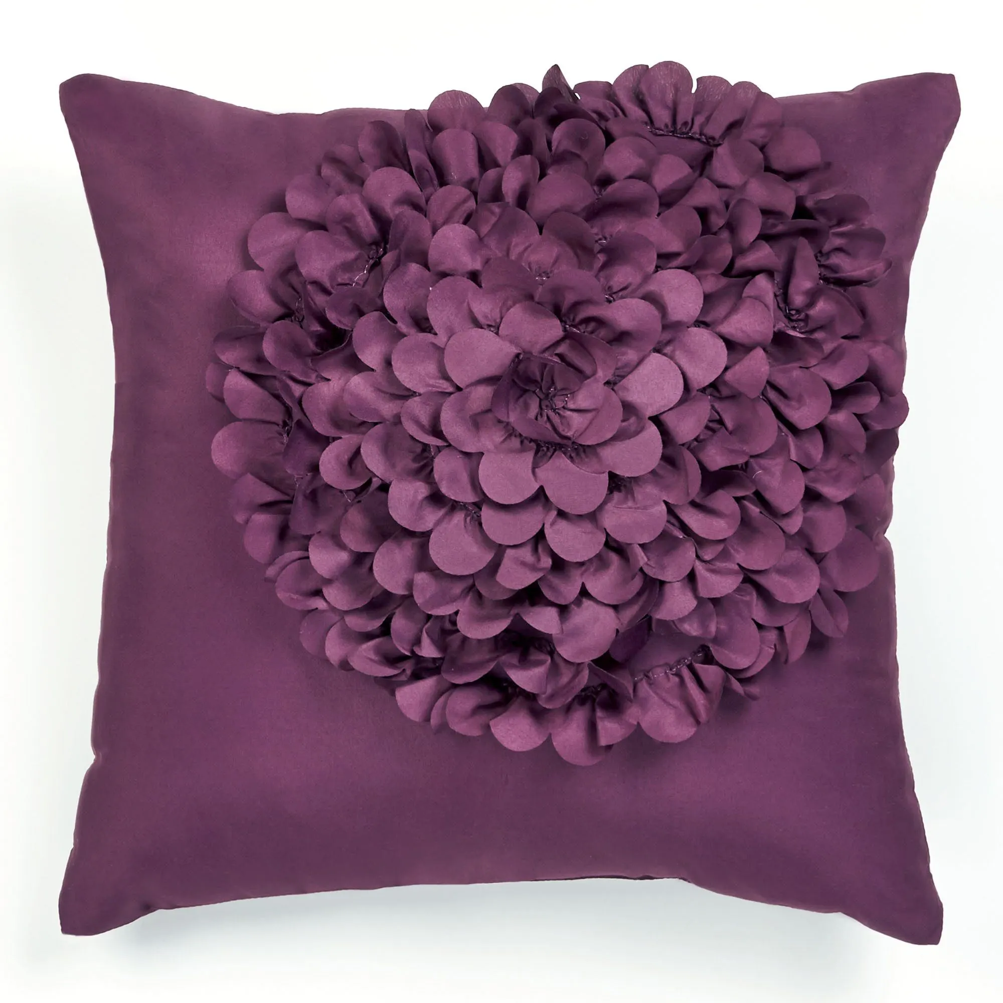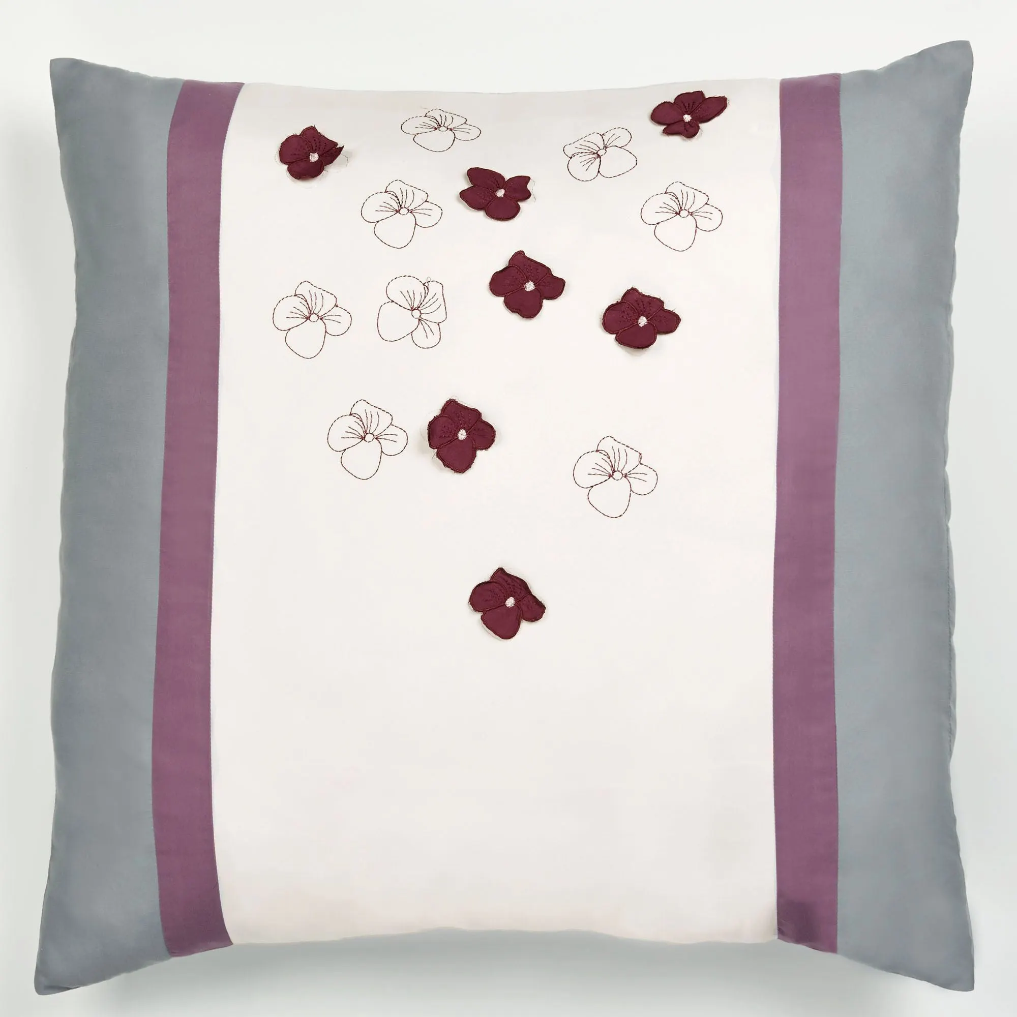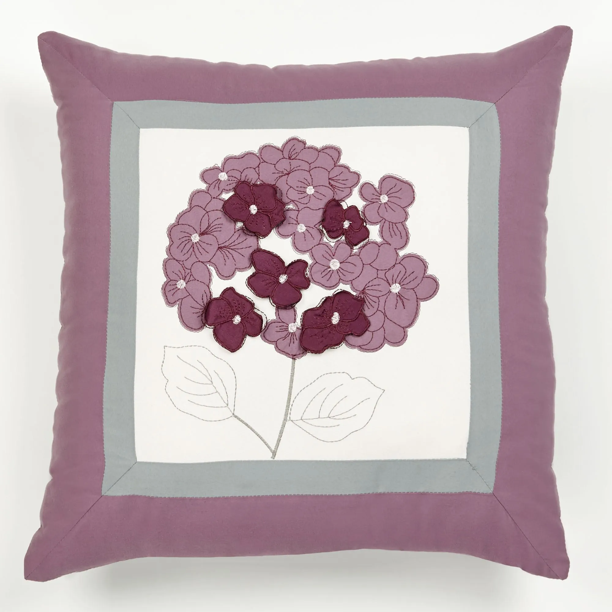 Pillows: Spot clean. Embroidered Square has an ivory center with large embroidered and appliqued florals framed in gray with an orchid outer edge. Embroidered Rectangle has an ivory center of embroidered and appliqued mini florals encased by orchid bands and gray sides. Tailored Square is plum with a large, appliqued, dimensional hydrangea in the upper right corner.