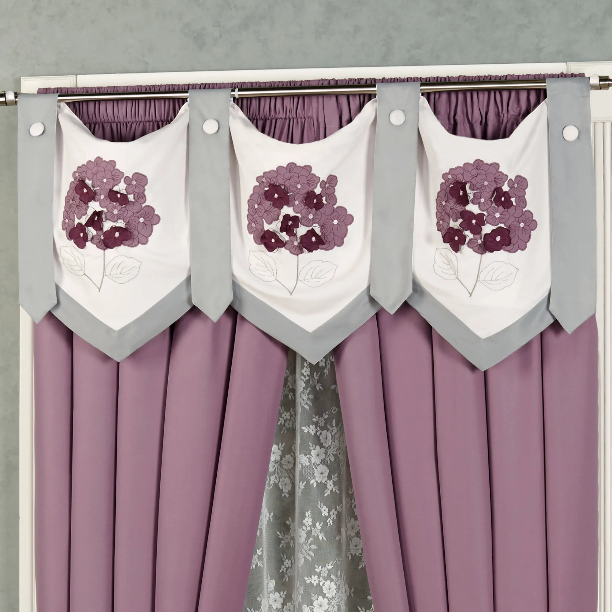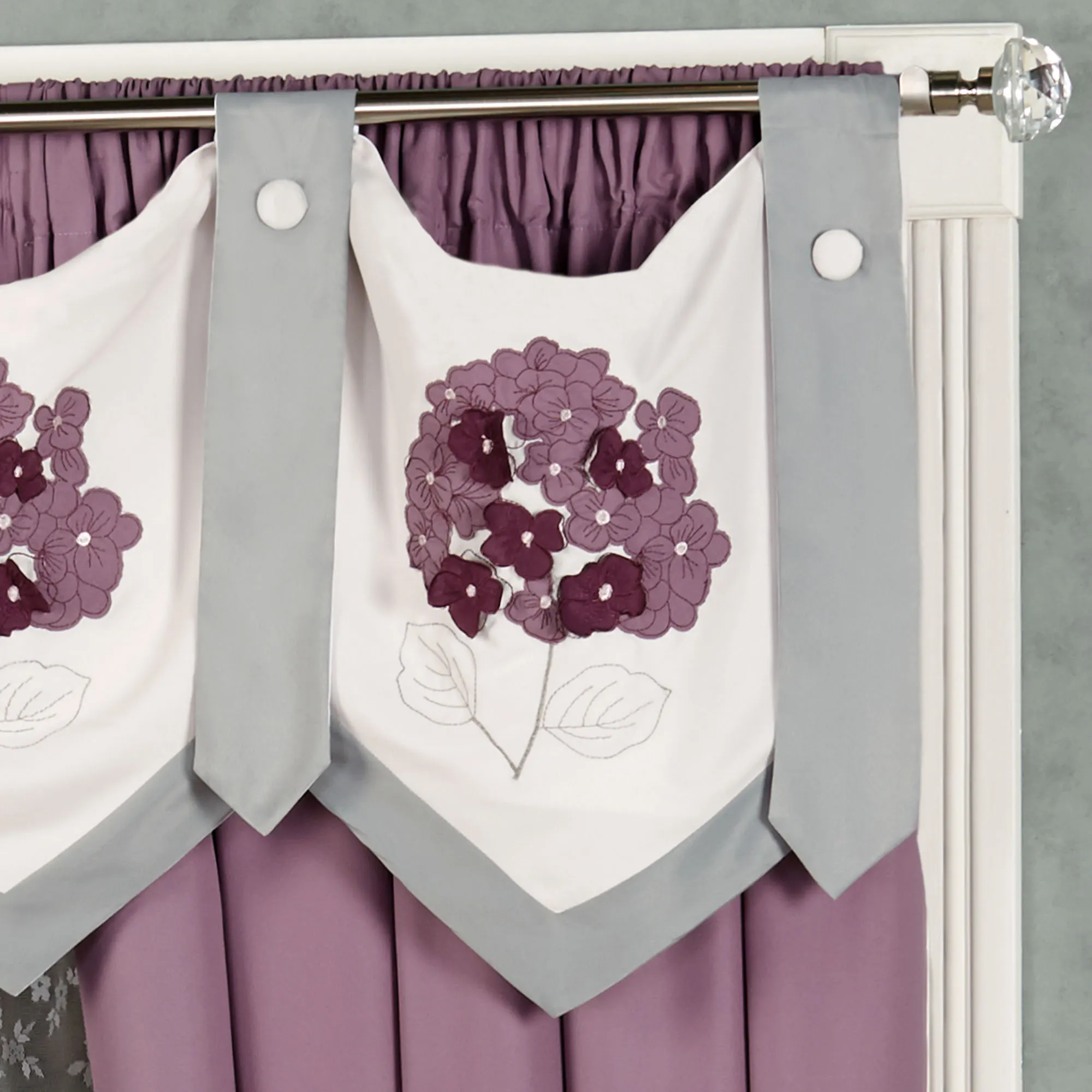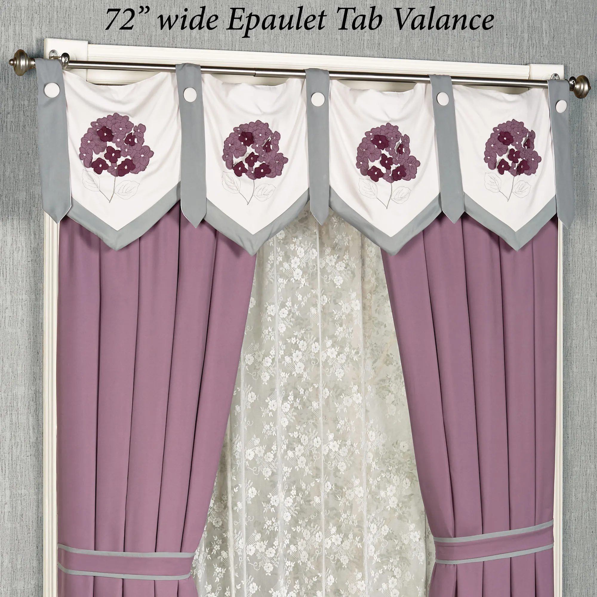 Give your room an atmosphere of humble peacefulness with the polyester Harmony Floral Epaulet Tab Valance. The valance has ivory panels with embroidered and appliqued florals and a gray border with self-covered button accents at the top. The flowers and leaves are in shades of gray, plum, and orchid. Opening for rod enclosure is formed from 3" tabs. Valance is 20"L. Machine washable. Imported. Sorry, the curtains shown are no longer available.