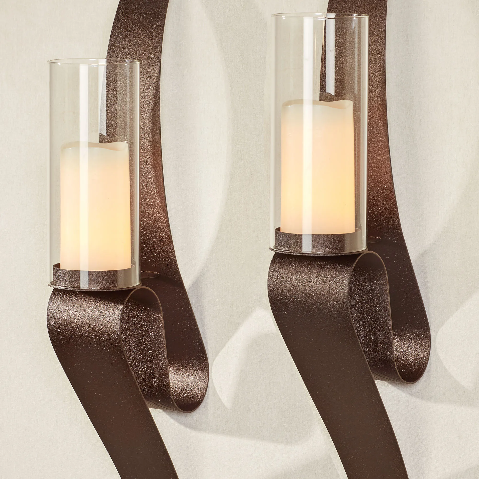 Create Harmony in a space with the undulating charm of this wall sconce pair designed by JasonW Studios(R). Curving with depth and dimension, each bronze-finished wall sconce lifts an included 4"dia.x9.5"H glass hurricane, which holds your 3" dia. pillar candle. Proudly made in the USA, the unique design is handcrafted by American craftsmen of 14-gauge steel and finished with a UV-, weather-, and tarnish-resistant powder-coat hue that complements your decor. Overall, each wall sconce measures 4"Wx8"Dx34"H. Pair weighs 10 lbs.