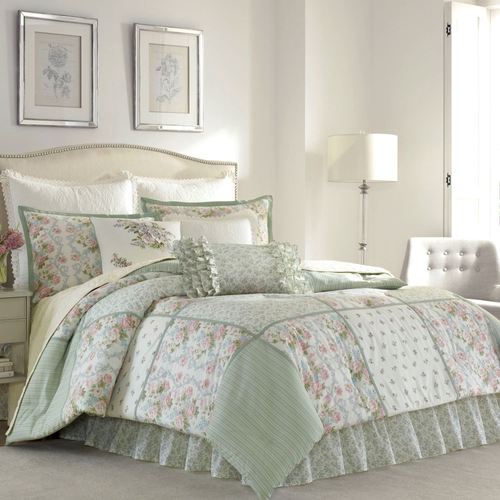 Bring sweet charm to your bedroom with the Harper Floral Comforter Bedding by Laura Ashley. Comforter features ivory cotton and top-stitched celadon taping, which creates a pieced block design of celadon ticking stripes; celadon florals; small gray and pink-hued bouquets; and a larger-scale floral design of sage, cypress, gray, sky blue, rose, tea rose, and pale pink florals on acanthus vines. Comforter is backed in celadon ticking stripes on ivory cotton. Fill is polyester. Machine washable. Imported/USA.