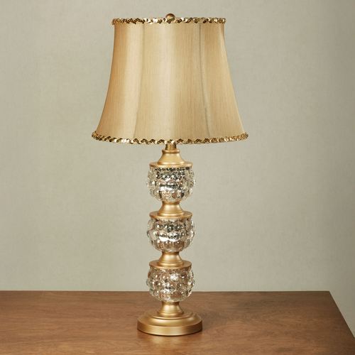 Textured mercury glass orbs radiate style on the Harper Table Lamp. Detailed with brushed brass metal spacers and a stepped bottom base with a brushed champagne bronze finish, this table lamp has a golden polyester bell shade with sparkling sequin trim. UL listed. Requires one 100W max. bulb. Overall, the table lamp measures 14"dia.x29"H, including the 1"H finial.