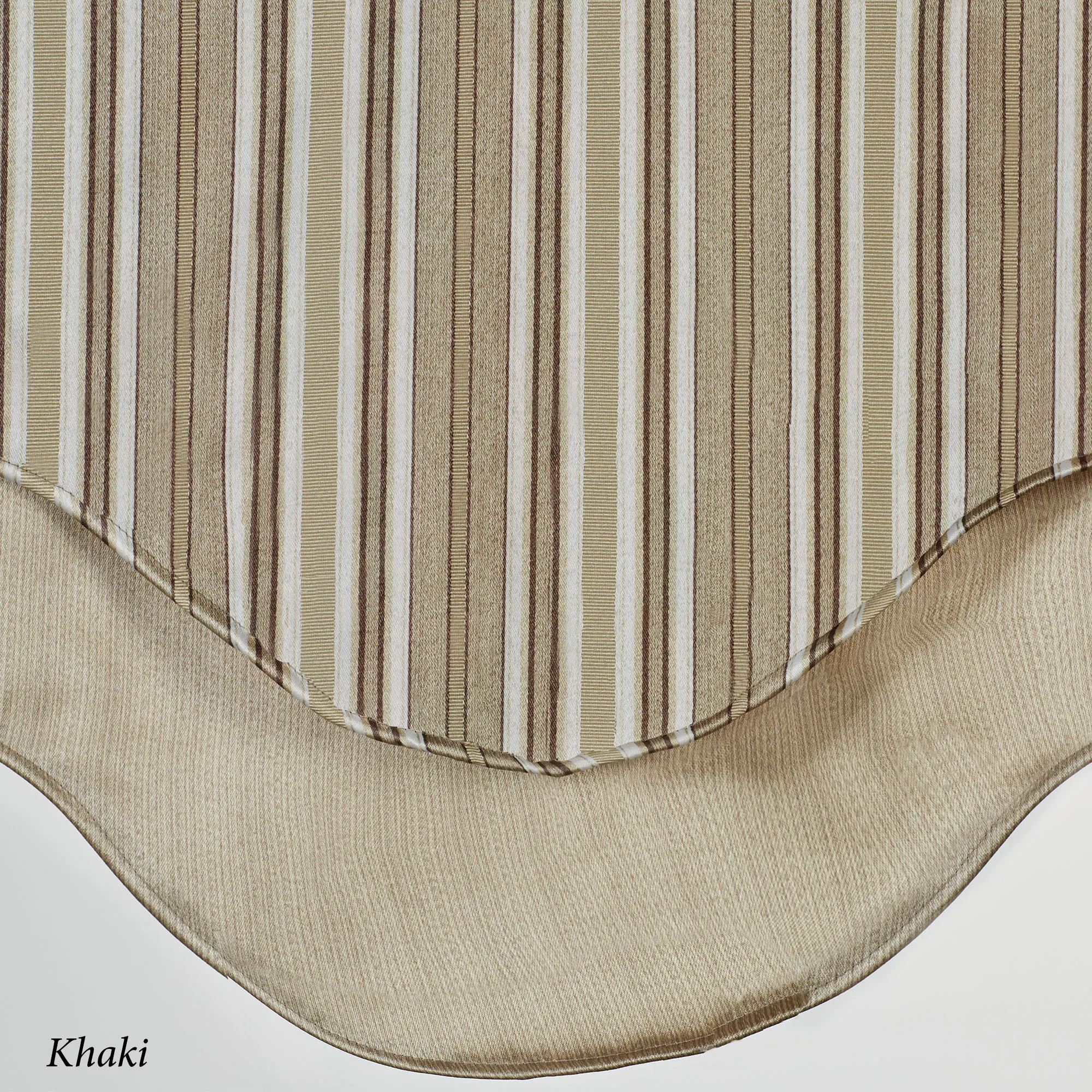 Stripe designs look handsome on the Harrington Layered Window Valance. This polyester/cotton double-layered valance has stripes on the top and a solid shaped bottom. Rod pocket is 3". Brown includes shades of light cream, cream, beige, and brown. Khaki includes colors of ivory, brown, khaki, and sand. Measures 56"Wx17"L. Machine washable. Imported.