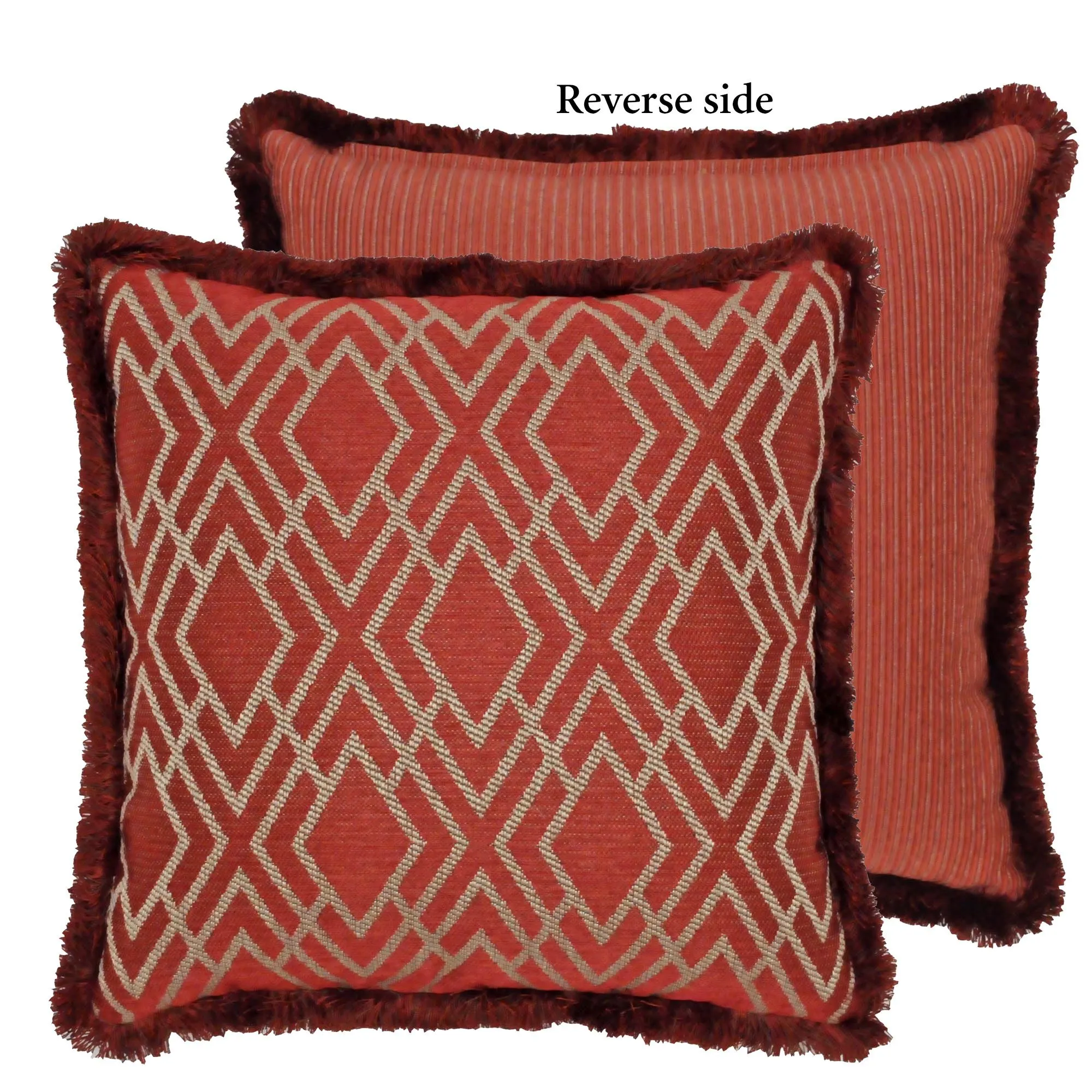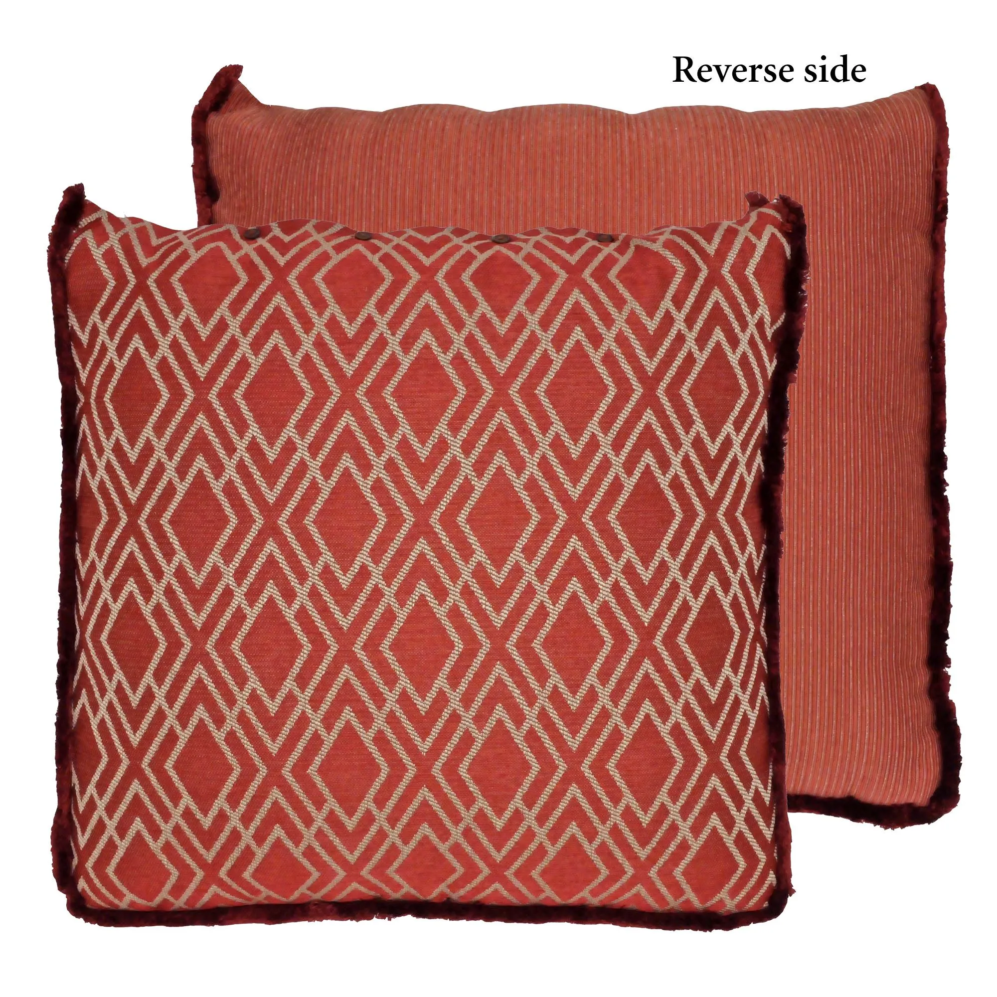 European Sham has a face of light taupe geometric diamonds on ember glow, a striped reverse accented with chenille, and 3" side gussets trimmed in fringe; button closure; dry clean only.