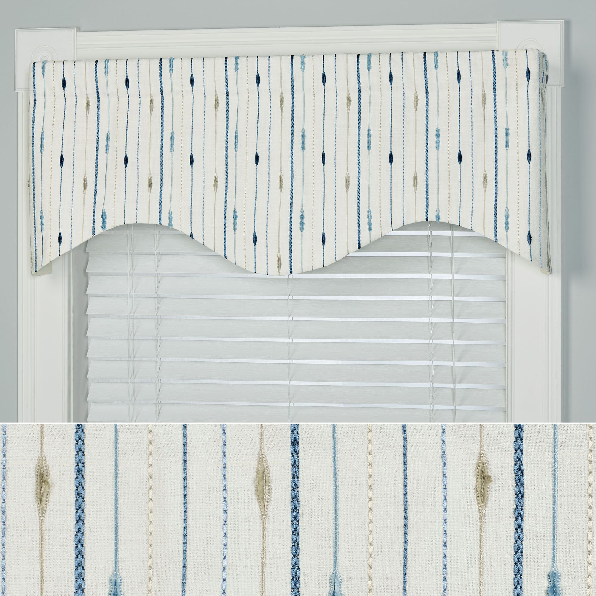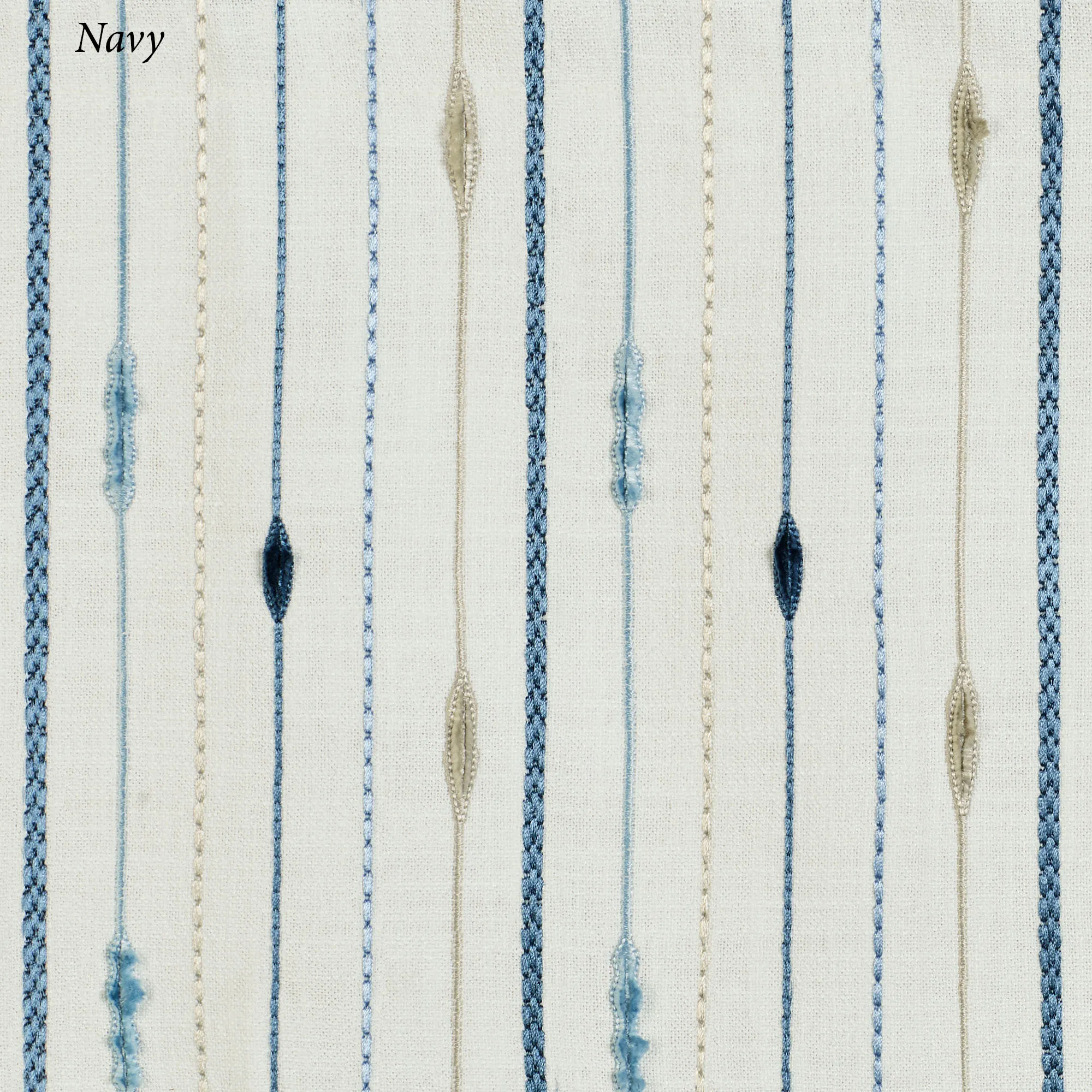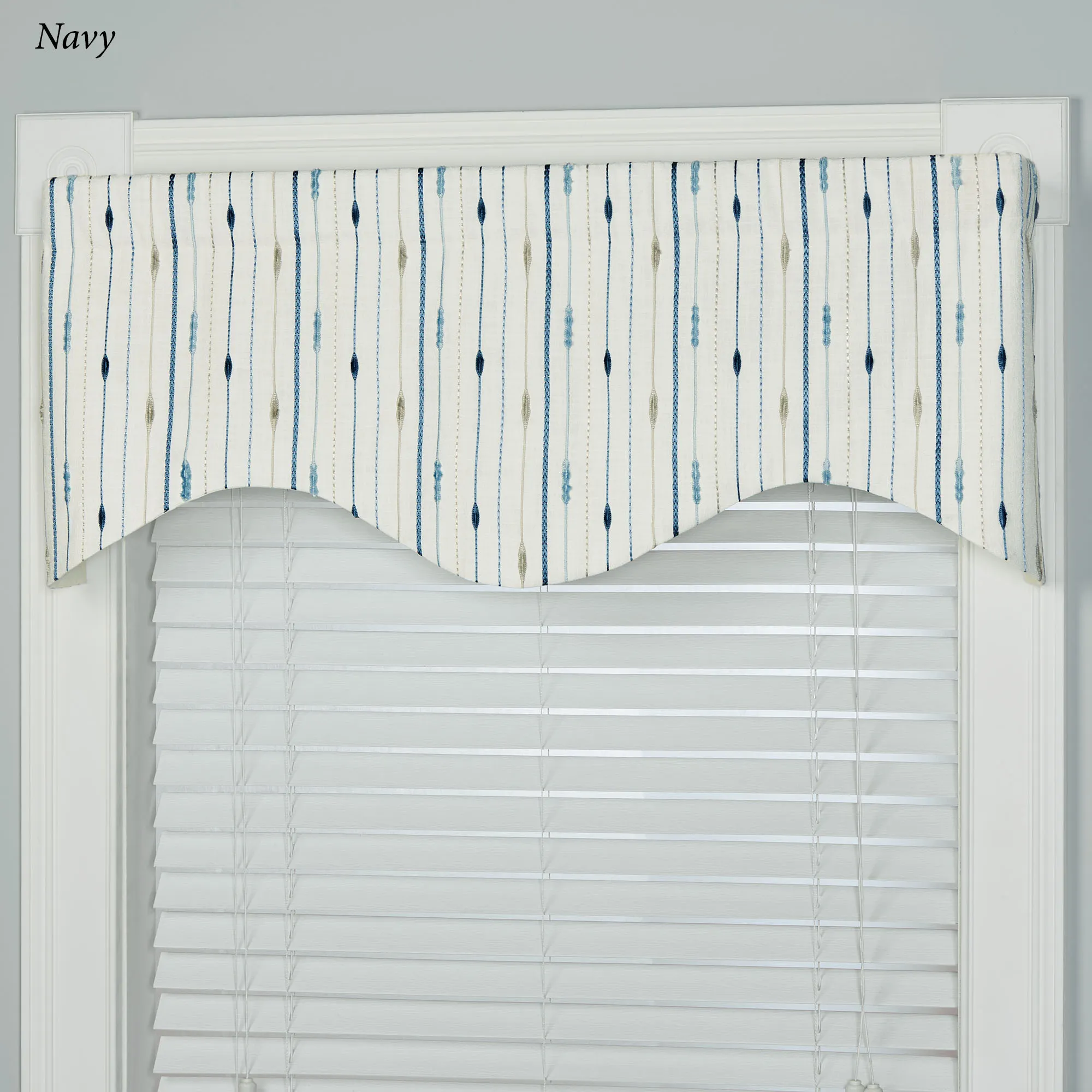 The Harstad Cornice Window Valance effortlessly boosts the charm in your space. With a woven cotton ground, the shaped valance features embroidered stripes in inviting hues with textural accenting. Navy has navy, light blue, light taupe, and parchment lines on eggshell. Silver has silver, gray, taupe, and light brown motifs on parchment. The light cream lining is a polyester/cotton blend. Rod pocket is 3". Valance measures 50"Wx17"L. Spot clean only. Made in the USA from imported materials.