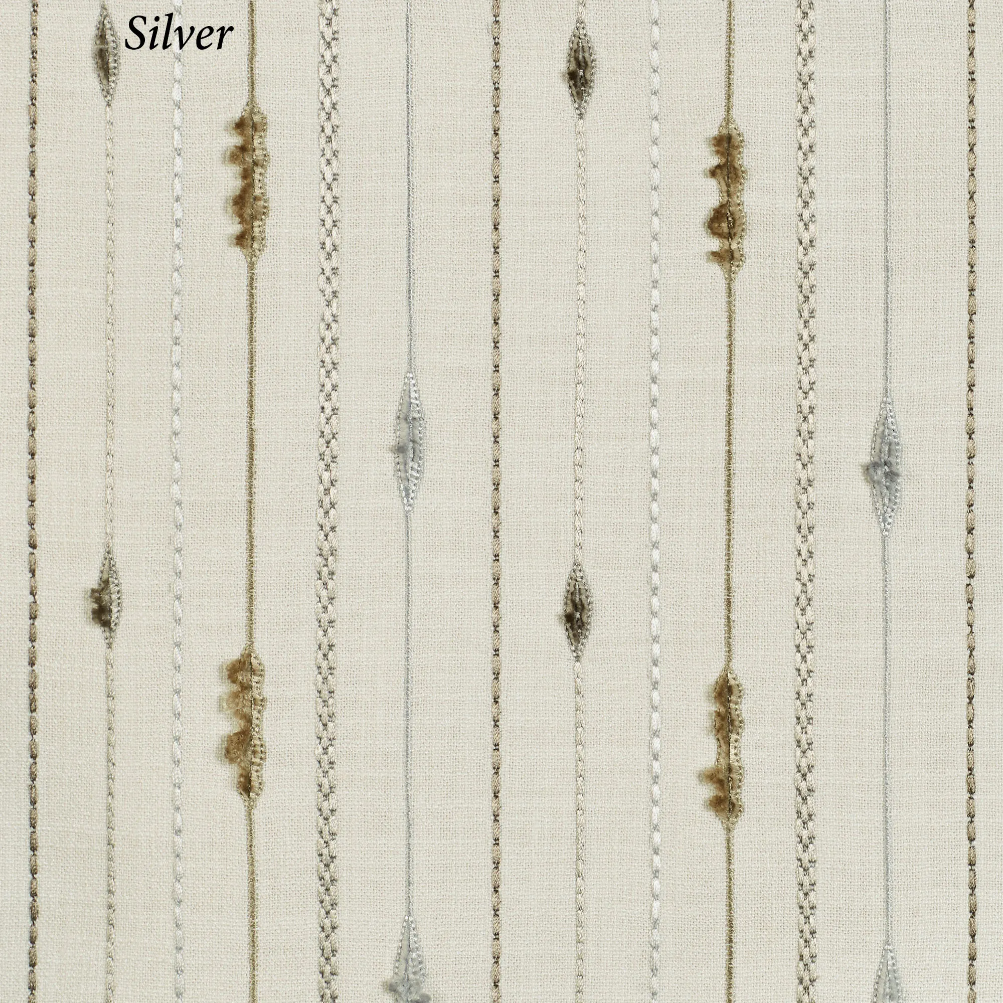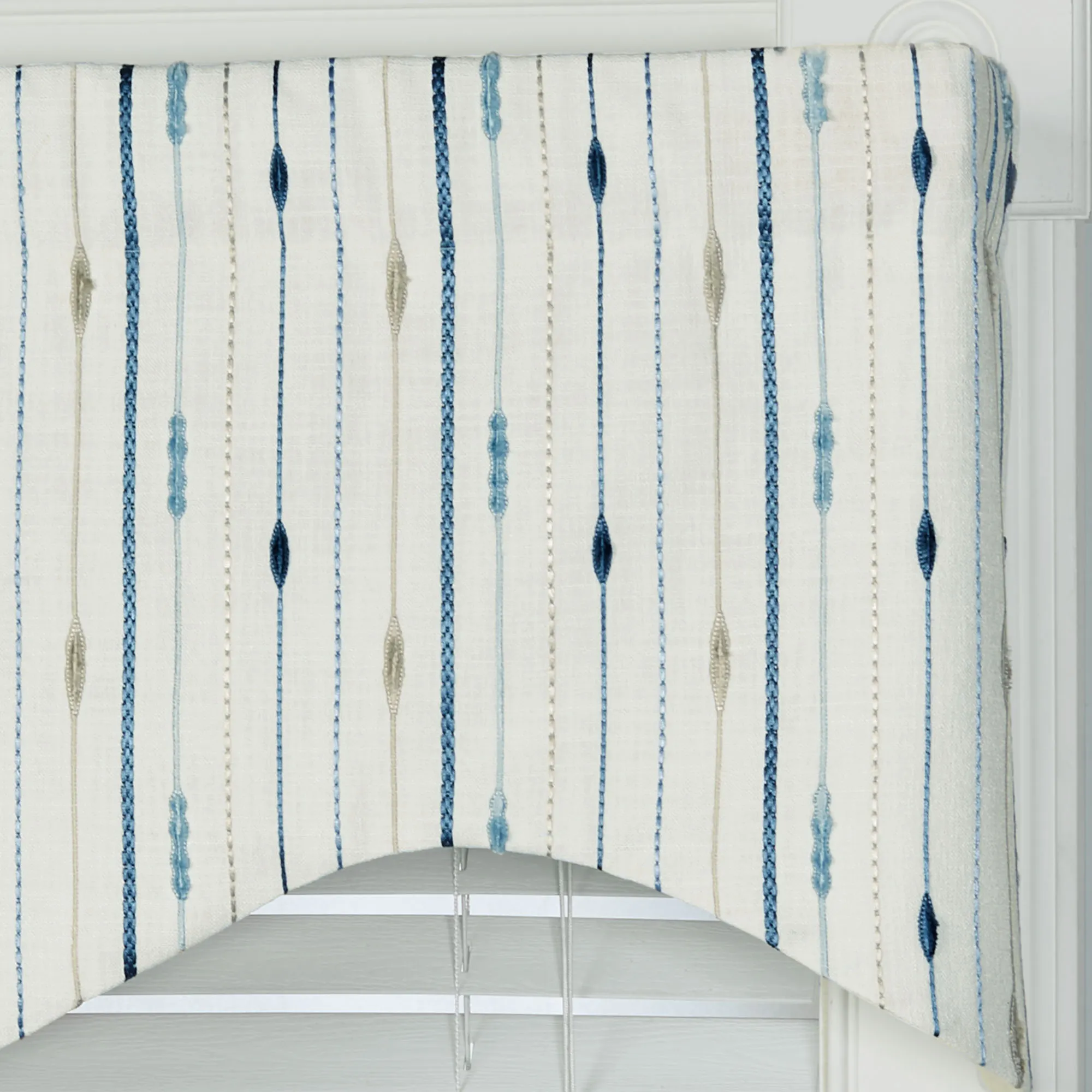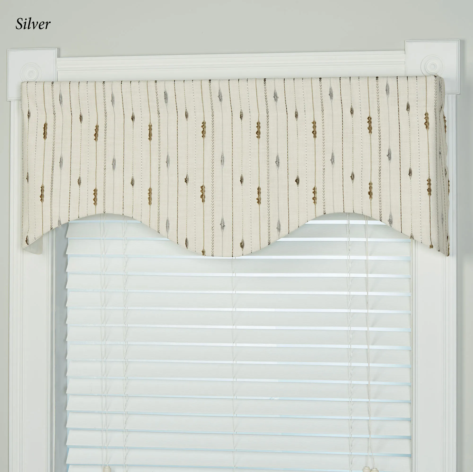 The Harstad Cornice Window Valance effortlessly boosts the charm in your space. With a woven cotton ground, the shaped valance features embroidered stripes in inviting hues with textural accenting. Navy has navy, light blue, light taupe, and parchment lines on eggshell. Silver has silver, gray, taupe, and light brown motifs on parchment. The light cream lining is a polyester/cotton blend. Rod pocket is 3". Valance measures 50"Wx17"L. Spot clean only. Made in the USA from imported materials.