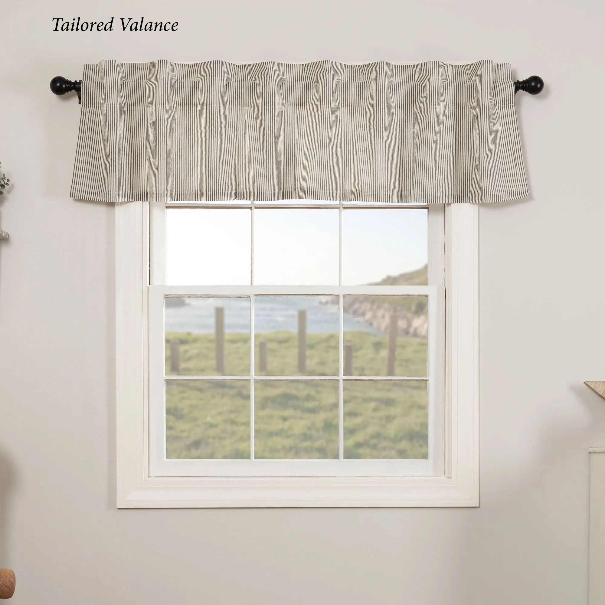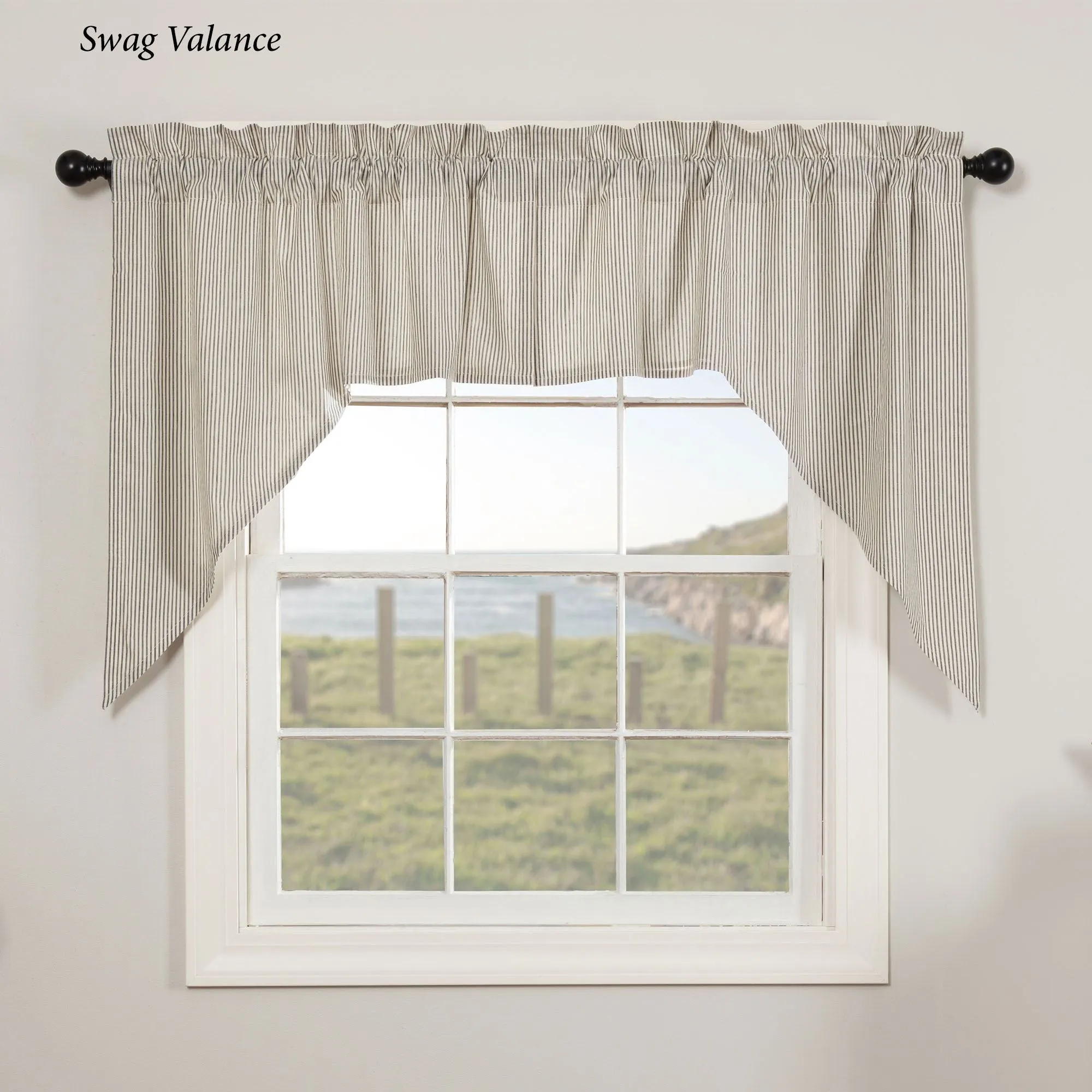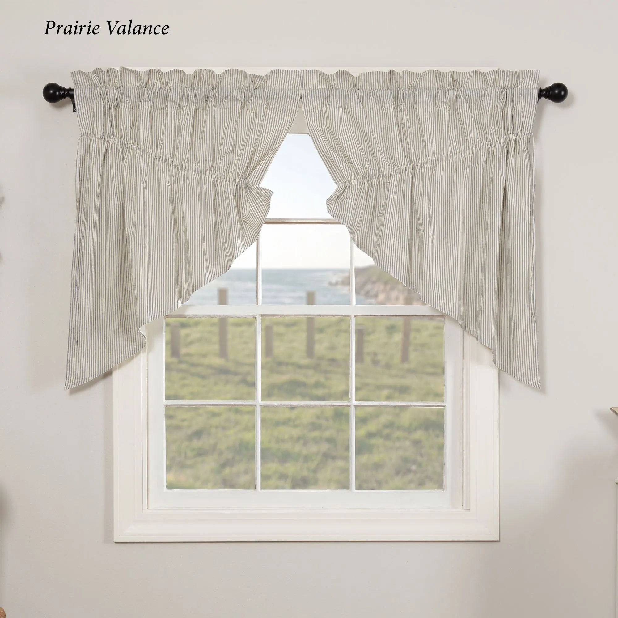 Window Treatment has 3.25" rod pockets. Tailored Curtain Pair: choose 72"Wx63"L or 80"Wx84"L. Tailored Valance is 16"L; choose 60"W or 72"W. Prairie Swag Valance Pair, 72"Wx36"L. Swag Valance Pair, 72"Wx36"L.