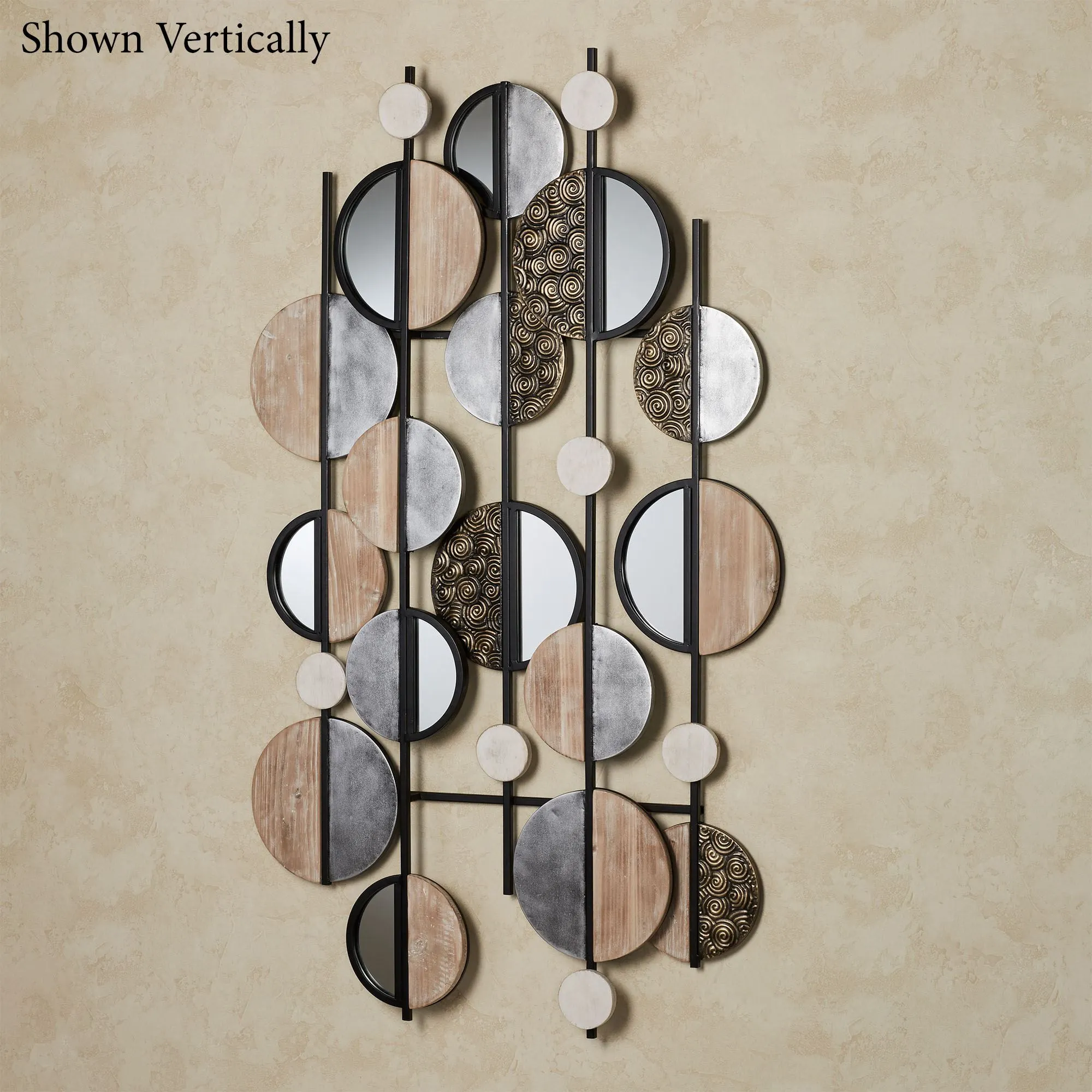 The Hayes Mirrored Wall Sculpture reflects modern style with geometric flair. With a dimensional design, the black metal framework features a variety of circle motifs crafted from natural and whitewash wooden hues, mirrored glass, gray-finished metal, and pressed bronze spirals. Wall art may hang horizontally or vertically. Overall, measures 47"Wx2.5"Dx29"H and weighs 14 lbs.