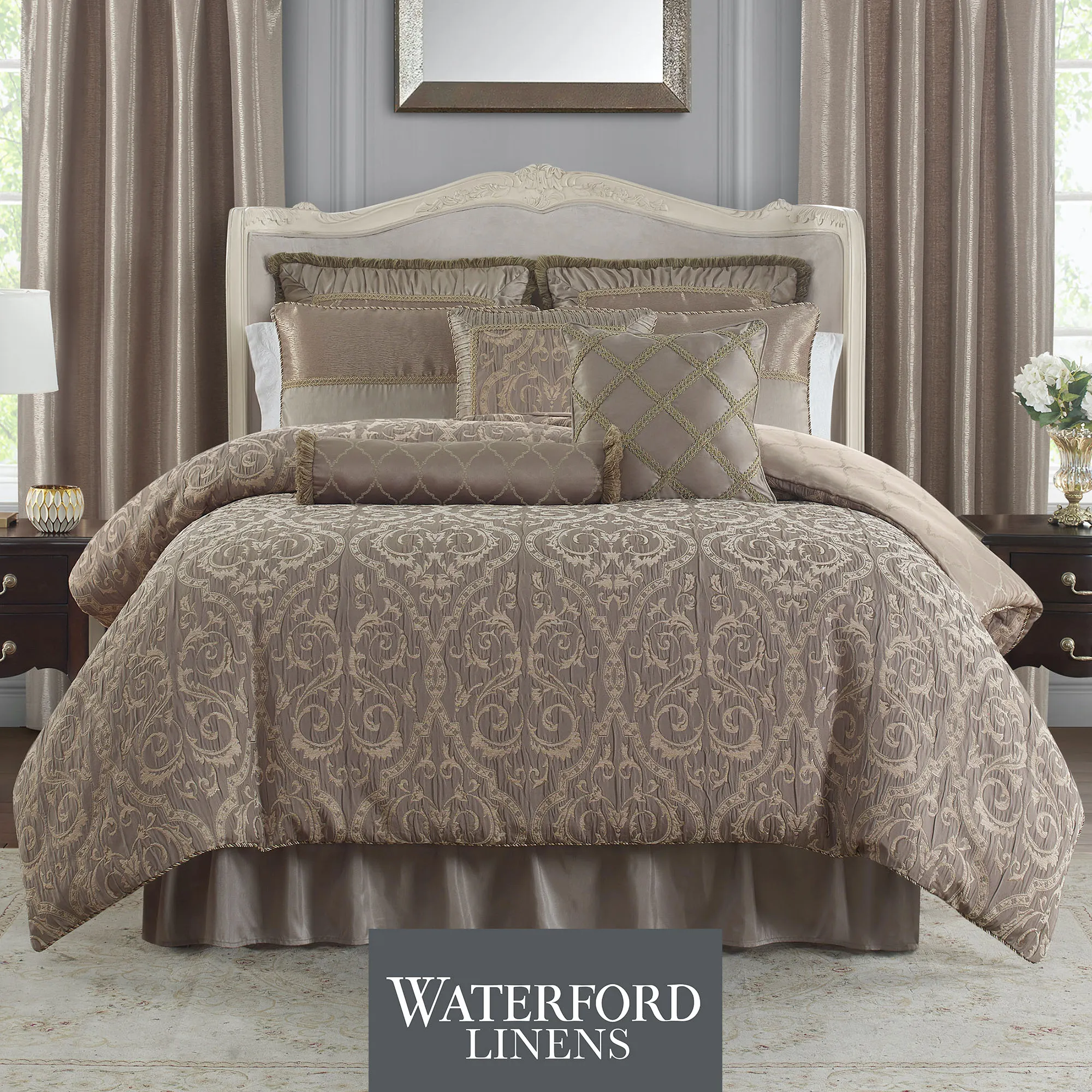 Decorate with the classic beauty of the Hazeldene Bedding from Waterford(R) Linens. The 6-piece Bed Set includes a comforter, a bedskirt, 2 shams, and 2 European shams. Made of polyester, the jacquard-woven comforter features a Venetian ironwork scroll design in beige chenille on a ruched taupe background. Oversized comforter reverses to a large outline of woven ironwork scrolls on solid taupe. Click on the Details tab to read about the other items. Fill is polyester. Dry clean. Imported.