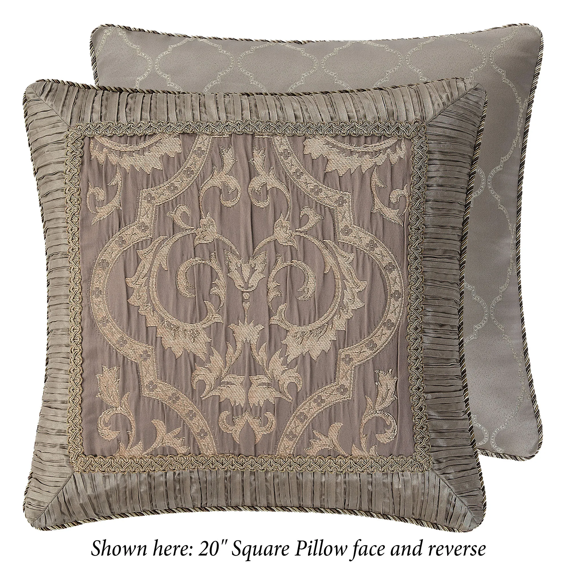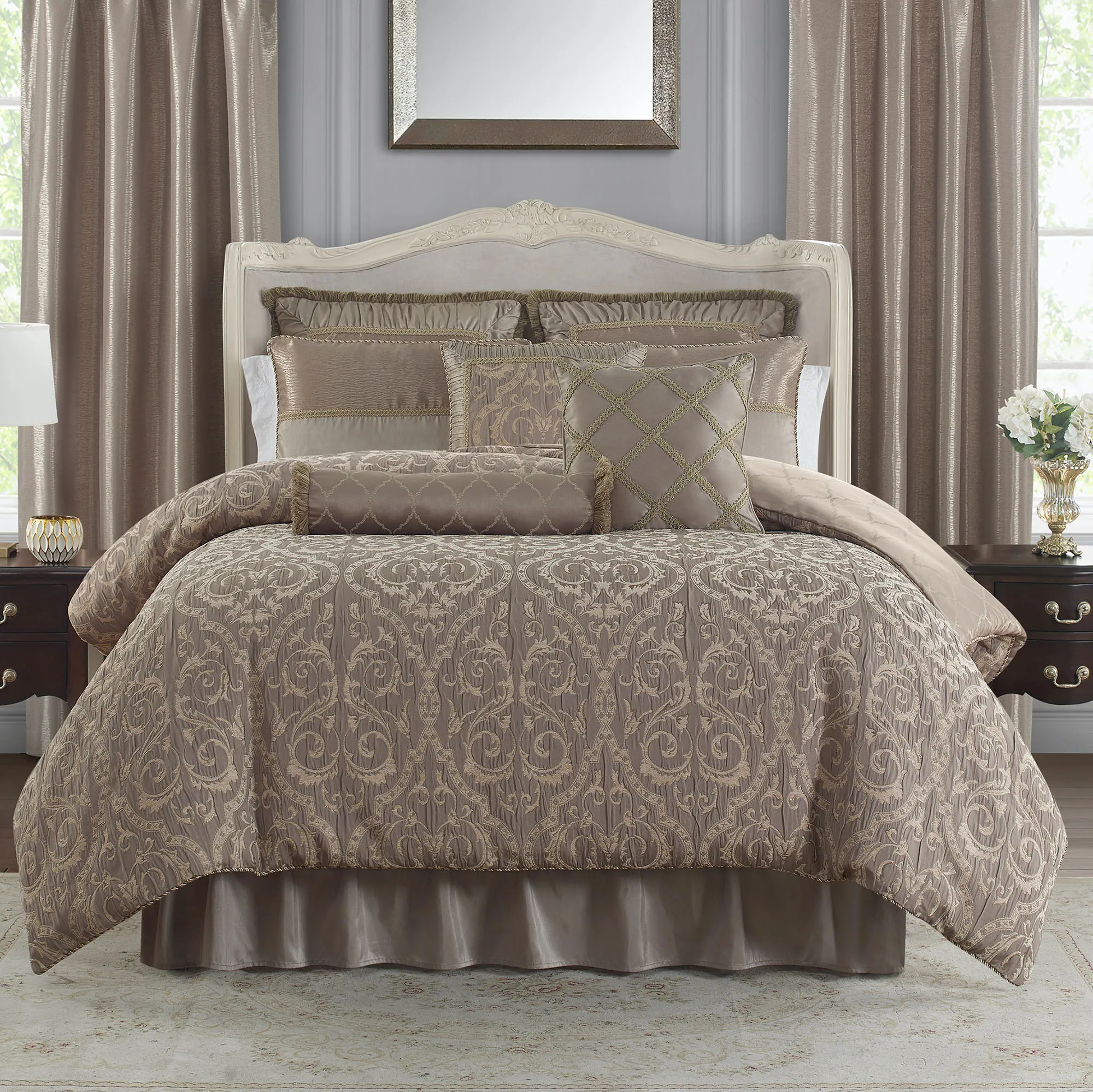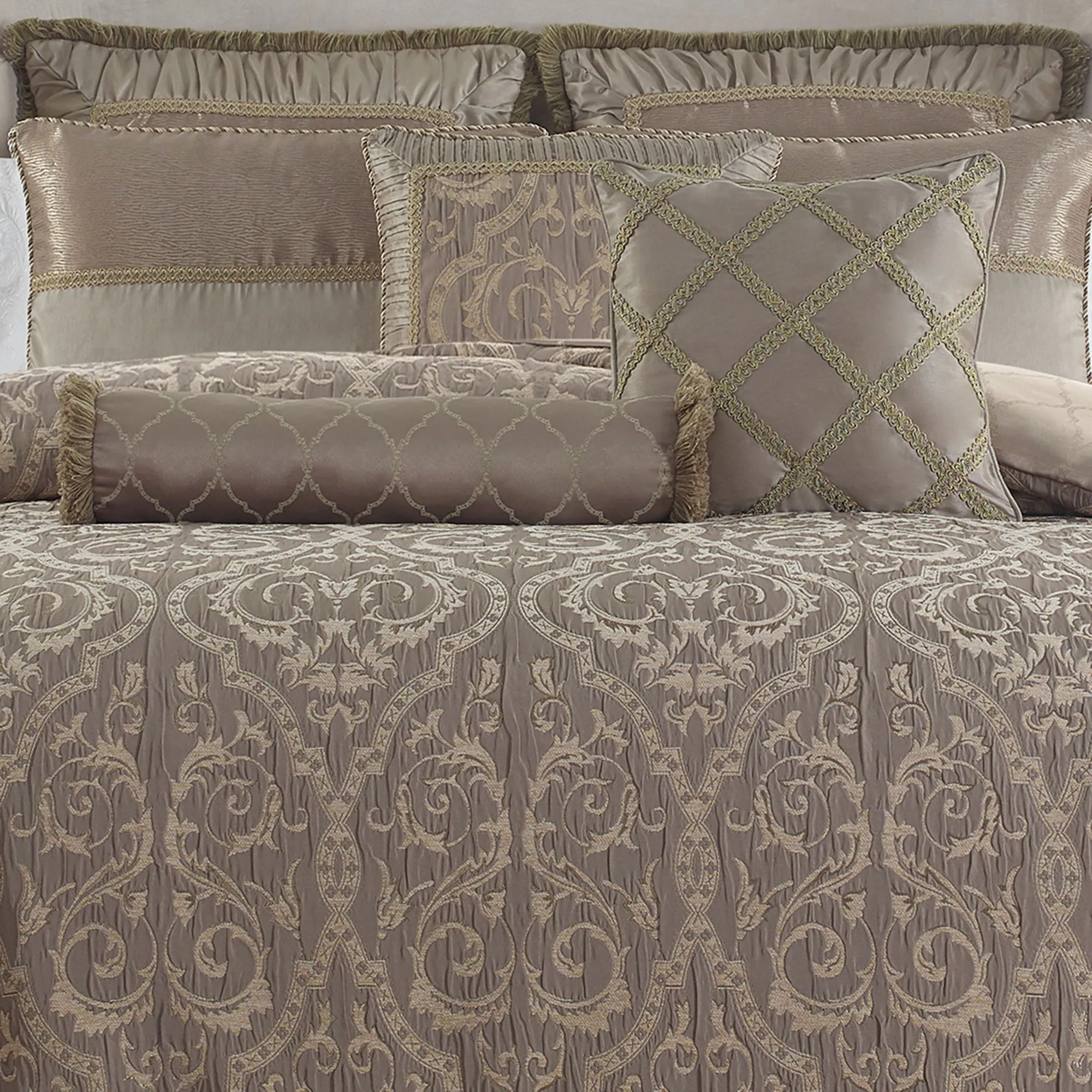 Oversized comforter fits mattresses up to 15". Comforter has an ironwork scroll design on a ruched taupe background and twist cording; reversible to a large outline of woven ironwork scrolls on solid taupe. The light taupe, poly satin bedskirt is gathered and has split corners in the 16" drop. Pieced shams have a woven, textured look at the top, slubbed poly satin at the bottom, gimp trim, twist cording, and zipper closures; reversible to a woven textured pattern in gold and taupe. European shams have a woven textured pattern in the center framed with ruched light taupe poly satin, gimp trim, and mitred corners. European shams have zipper closures and reverse to woven ironwork scrolls on solid taupe. Brushed fringe accents the edges.