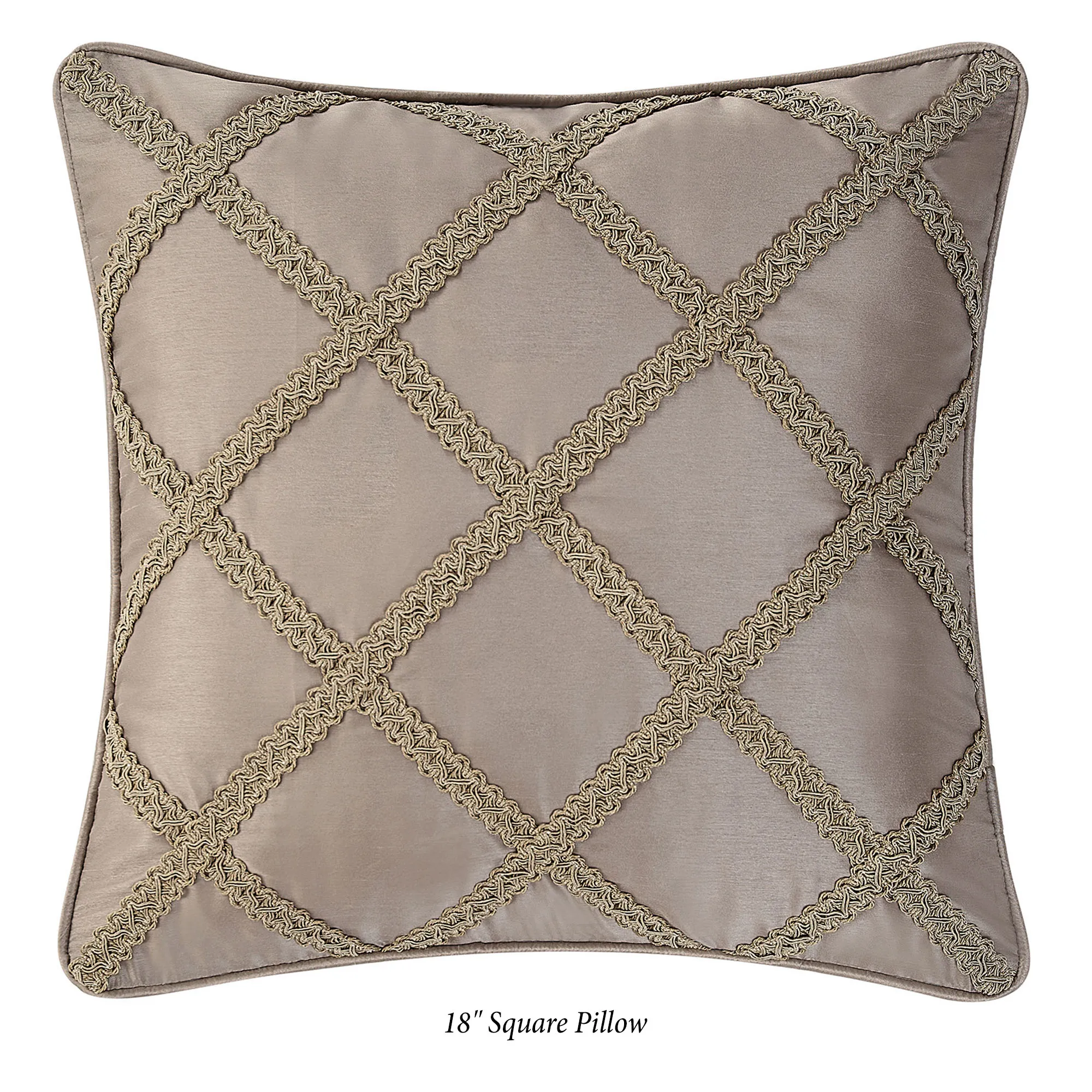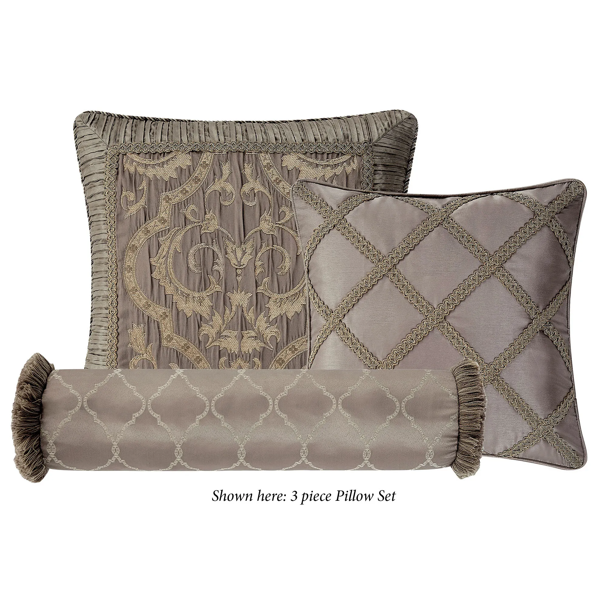 The Pillow Set of 3 includes 2 square pillows and a neckroll pillow. Spot clean. Piped square has gimp trim diamond designs on a light taupe, slubbed poly satin background. Corded square has the ironwork scroll design framed by a light taupe, poly satin pleated border with gimp trim and mitred corners; reverses to ironwork on solid taupe. Neckroll has ironwork scrolls on taupe; ends have a woven textured pattern and brushed fringe.