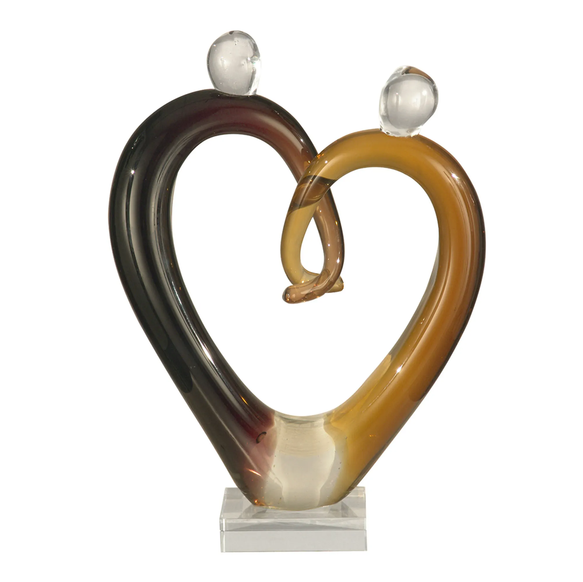 United as one, the Hearts Couple holds hands. This handcrafted Favrile art glass figurine, by Dale Tiffany, displays two lovers in a heart shape. Vibrant colors include shades of orange, brown, and clear. Favrile art glass differs from other colored glass because the color is embedded and runs throughout the glass instead of being painted on the surface, therefore creating a depth of intense color. Each piece showcases subtle variations in color, pattern, and size since each piece is meticulously handcrafted, ensuring every piece is a one of a kind. Measures 8"Wx3"Dx11"H.