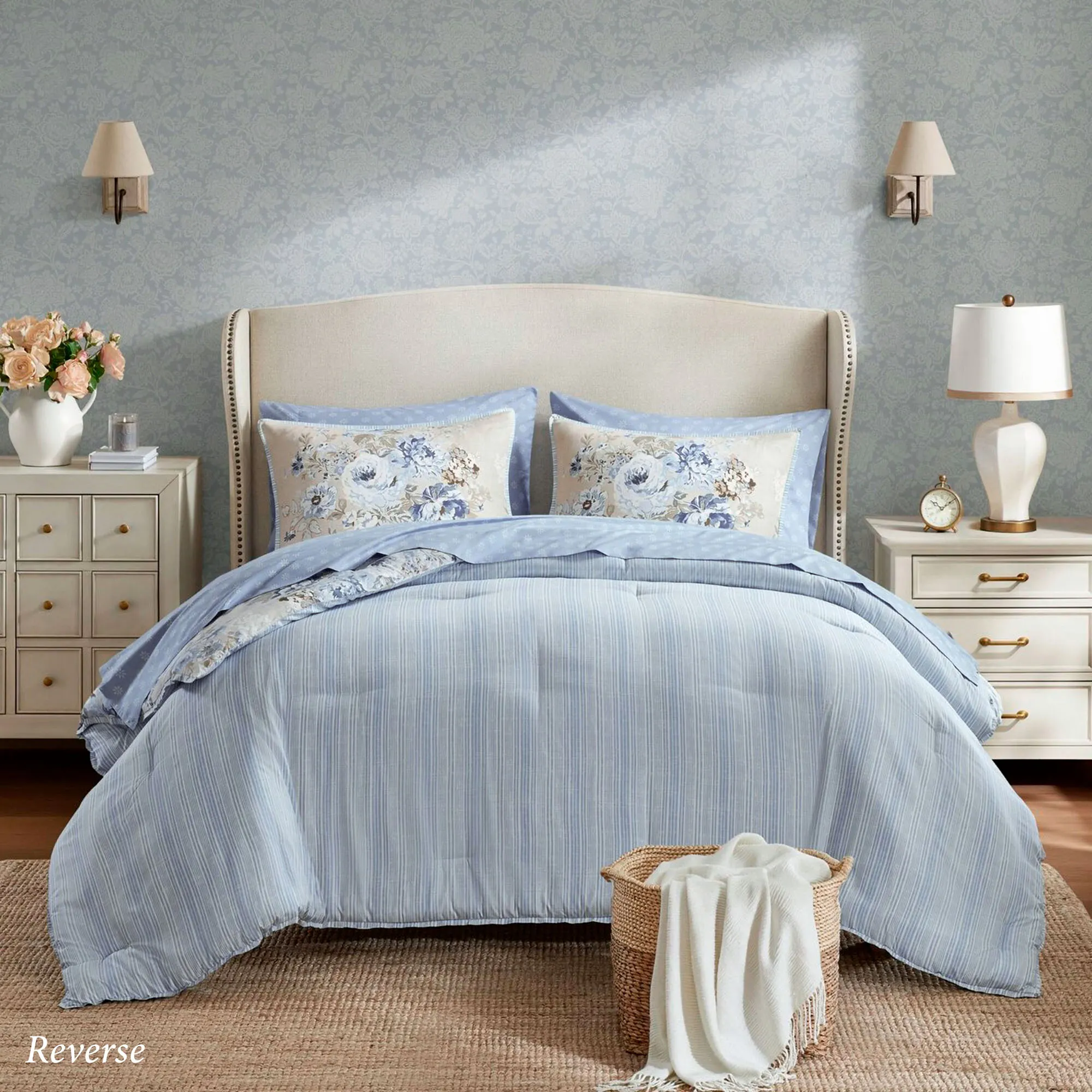 • Comforter reverses to stripes in shades of blue