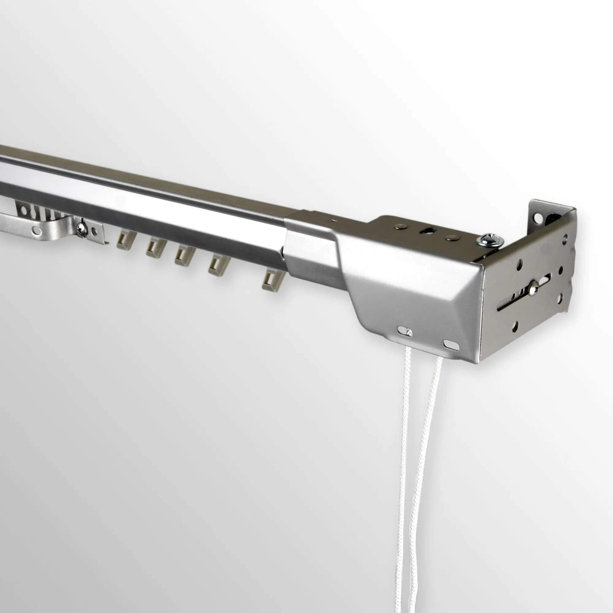 Allow the Heavy Duty Traverse Rod to work perfectly for you. Crafted from steel, the adjustable 1.125" dia. rod is ideal for your pinch-pleat draperies and can be hung on the wall or ceiling. With a superior slide, your curtains can open in the middle and stack on each side, or the rod can be converted to draw to the left or right. The cord drop is pre-strung on the right side, but it can also be moved to the left side; molded cord tension pulley is included. Each end bracket projects 3"-4.125". Center brackets project 2.875"-3.5". The 30"-48" size has 10 sliders. The 48"-84" size has 20 sliders. The 66"-120" size includes 30 sliders and 2 center brackets. The 84"-156" size includes 40 sliders and 3 center brackets. Mounting hardware is included.