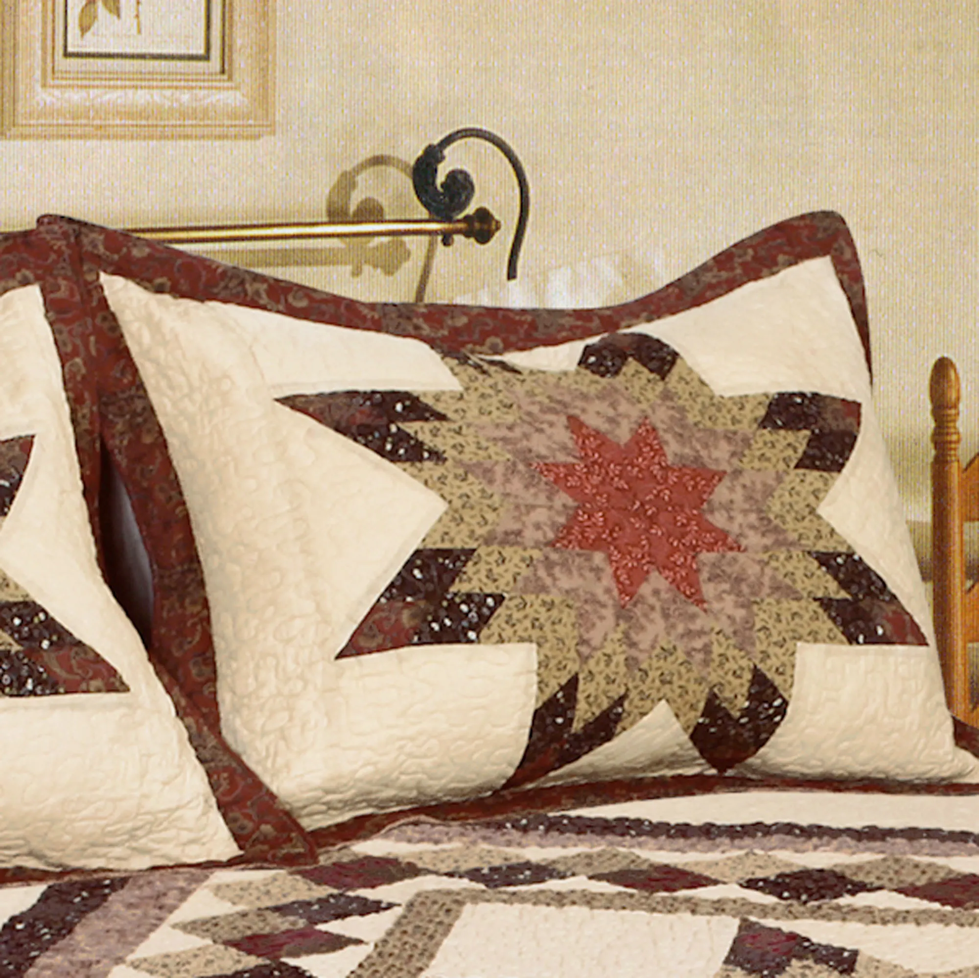 The Heirloom Patchwork Star Standard Sham is full of warm colors that will give your bedroom a cozy feel. The handcrafted, cotton sham features a champagne, vermicelli-quilted ground and an exquisite patchwork star motif accented by various floral prints. Colors include shades of chocolate, dark red, tan, and dark blush. Standard sham has flanged edges and a French back closure. We recommend using three standard shams on King-size beds. Machine washable. Imported.