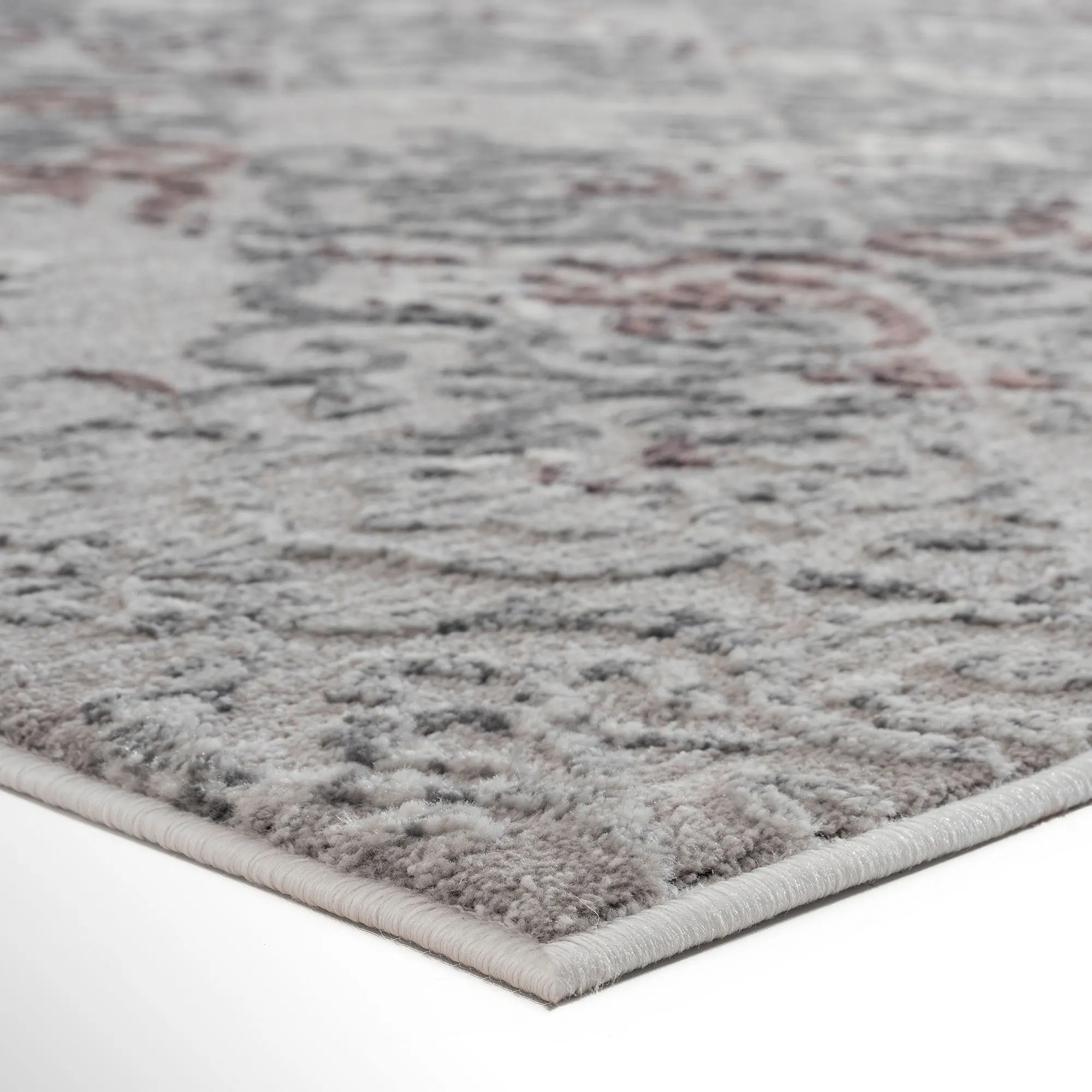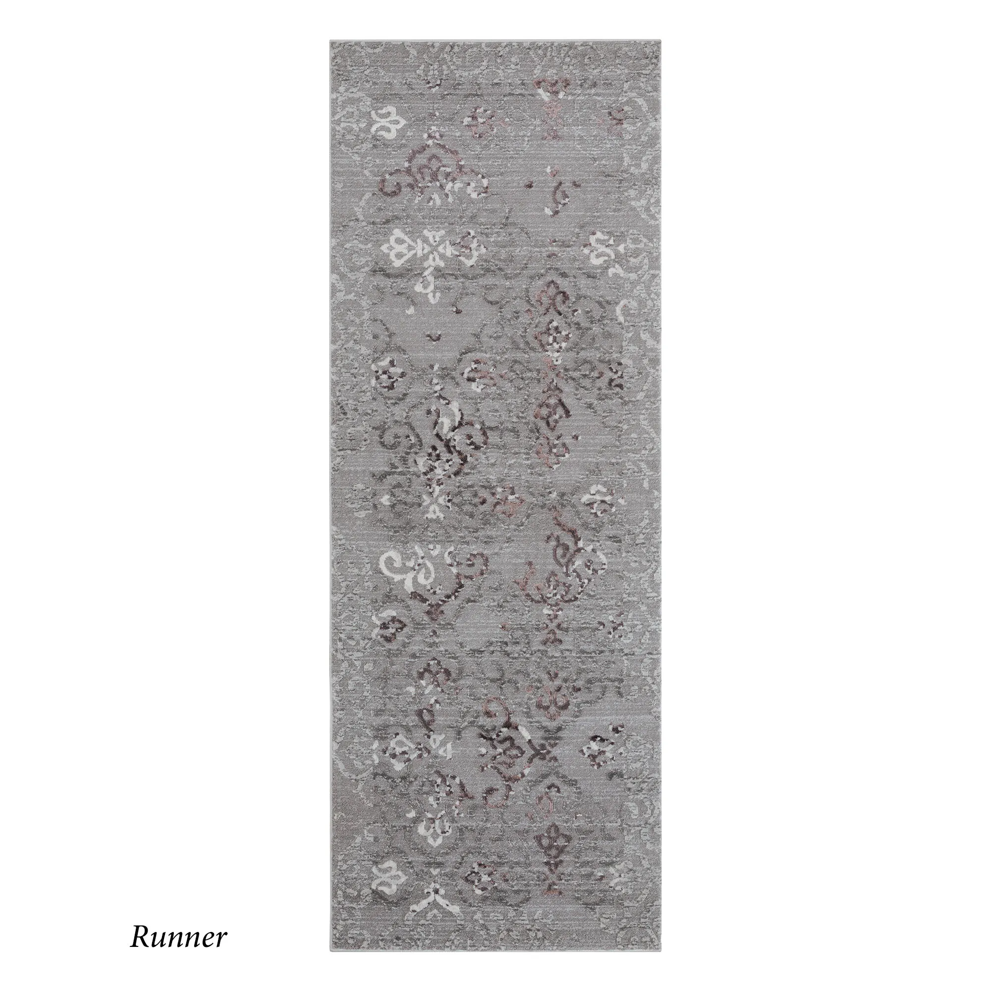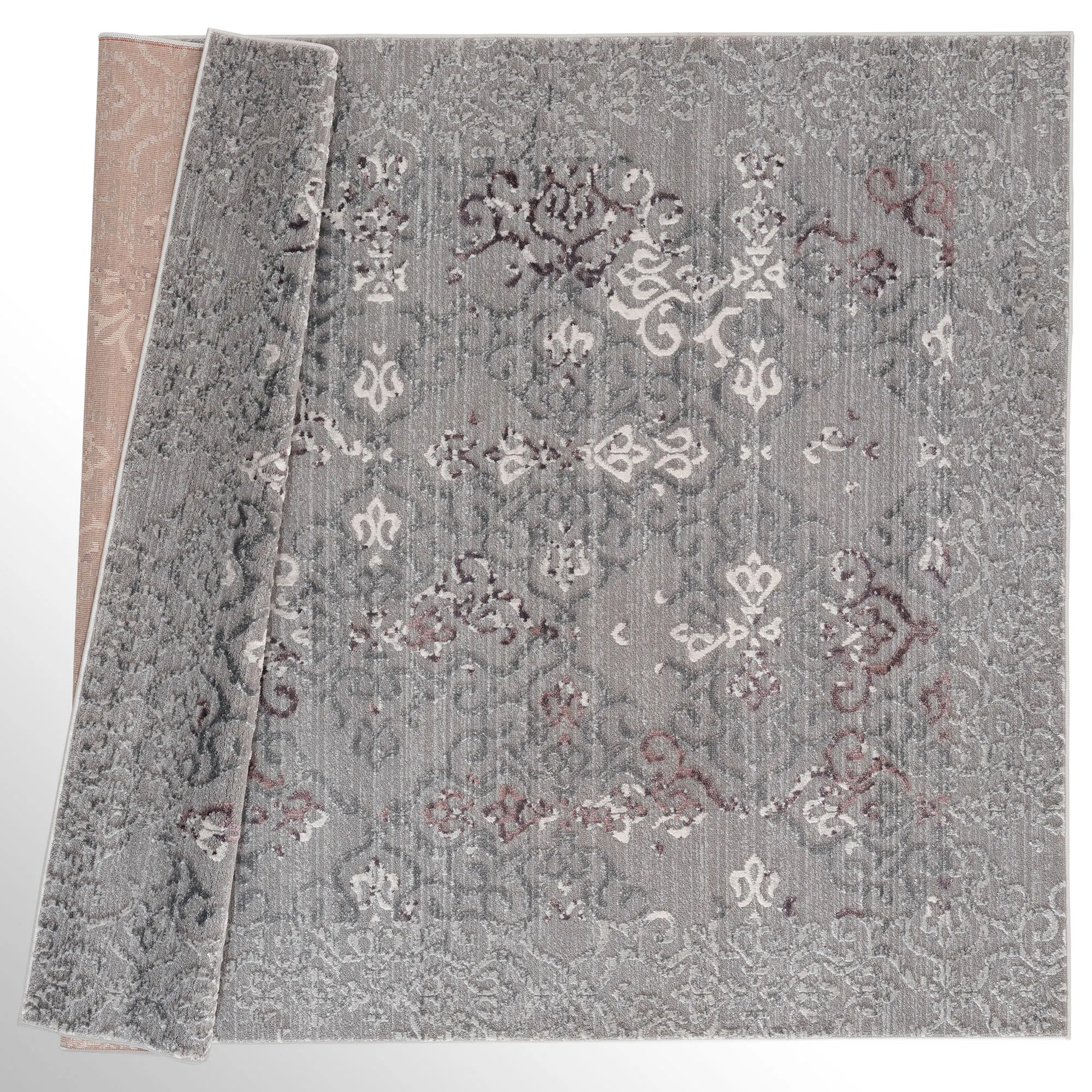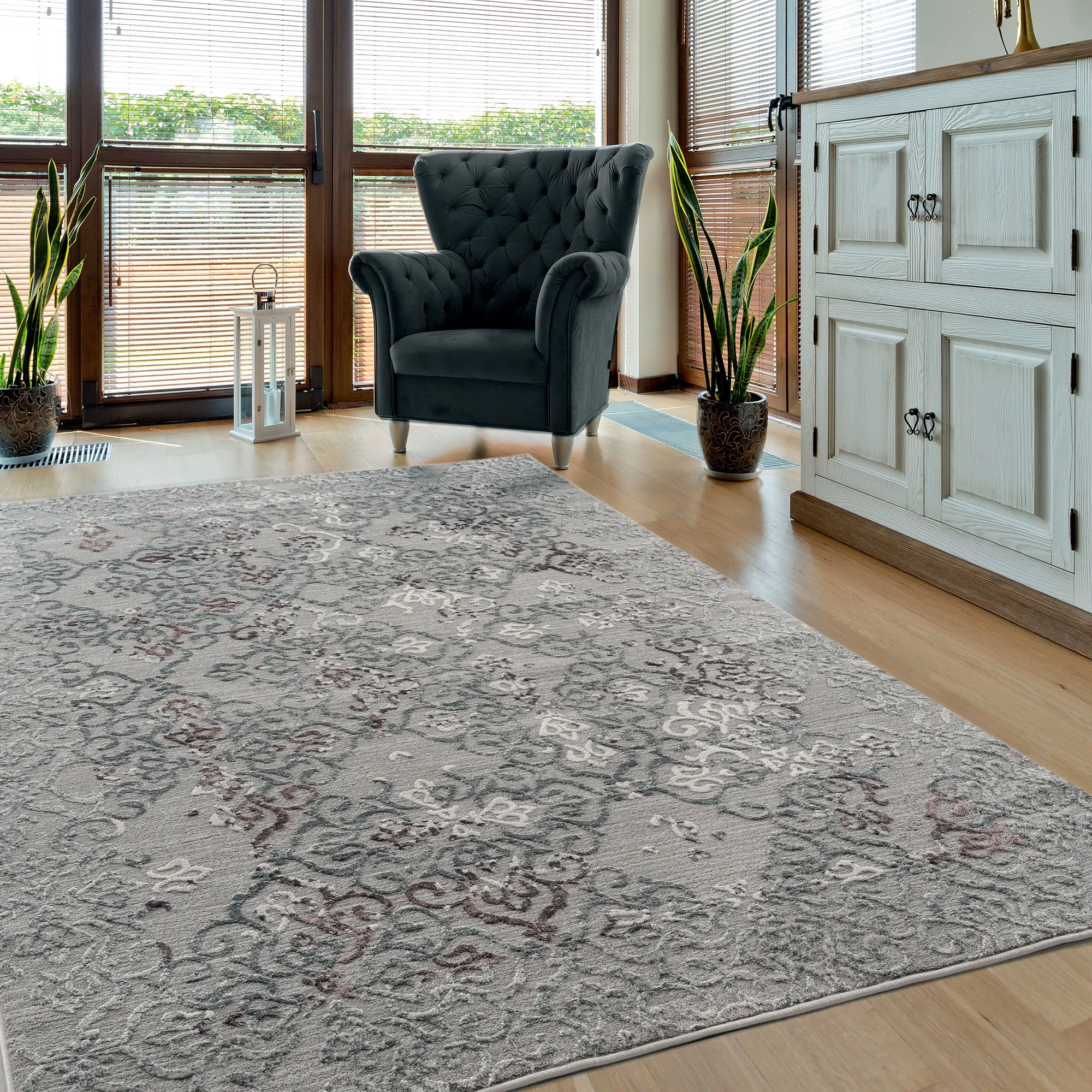 A traditional scrolling design adds unique character to the Helen Rug. Power-loomed of olefin, this area rug, .39" thick, has a distressed, worn appearance. Colors include shades of plum, dark gray, and light gray. We recommend professional cleaning by a rug cleaner. Imported.