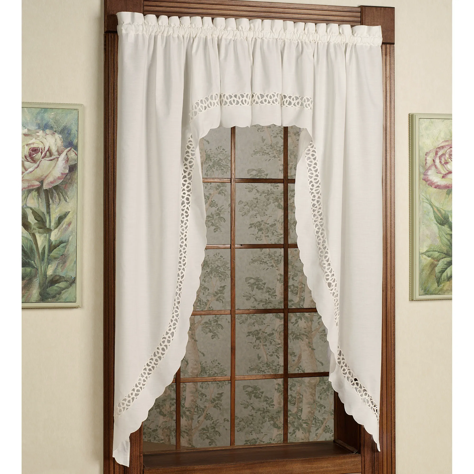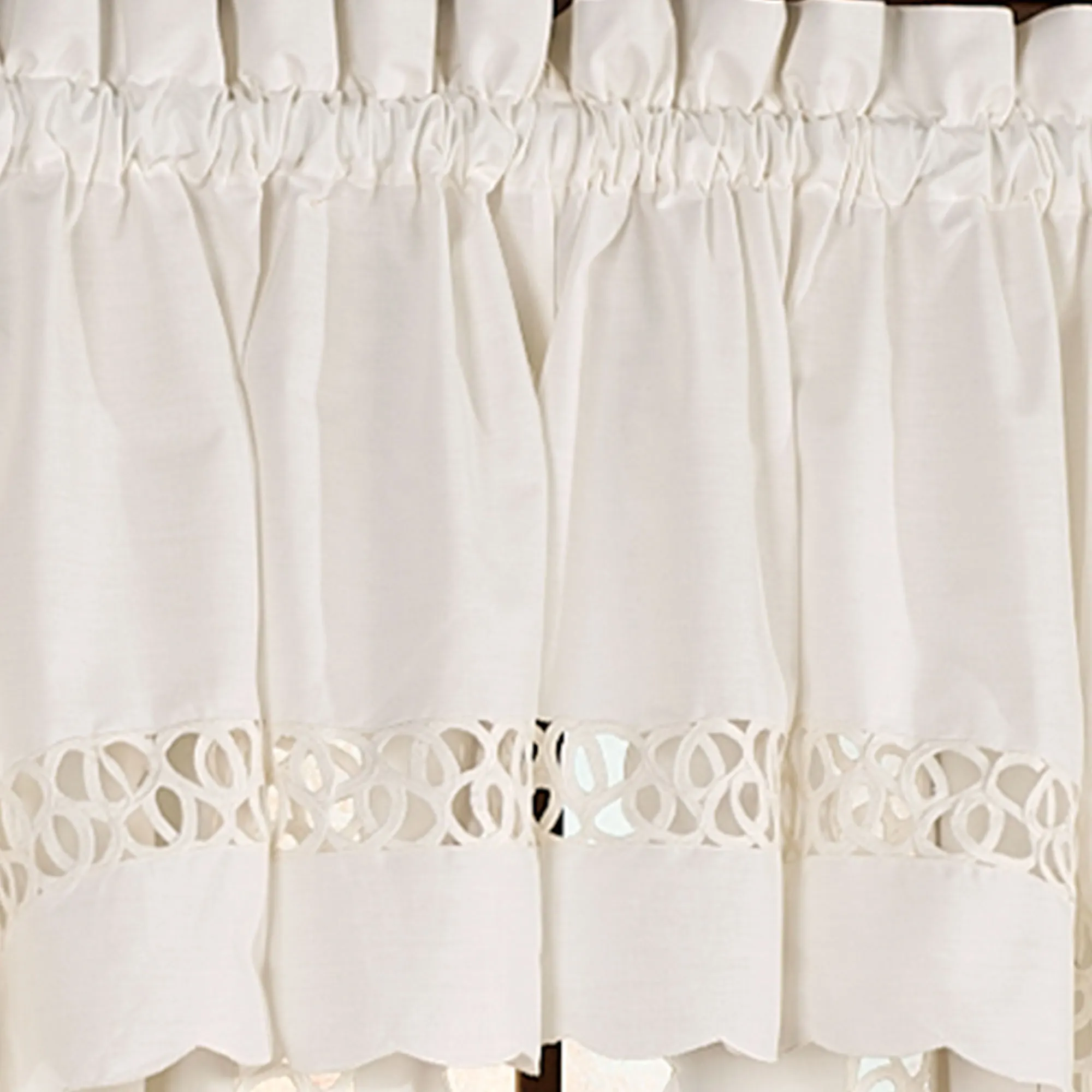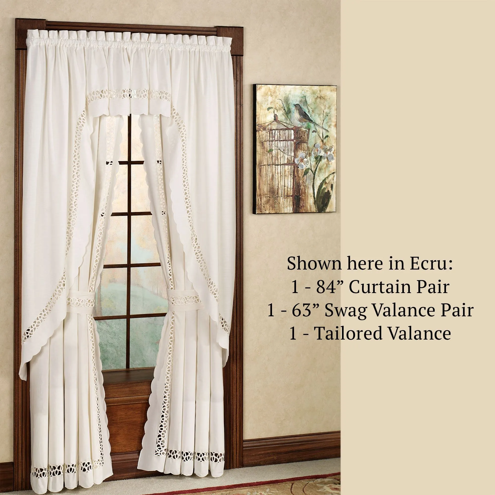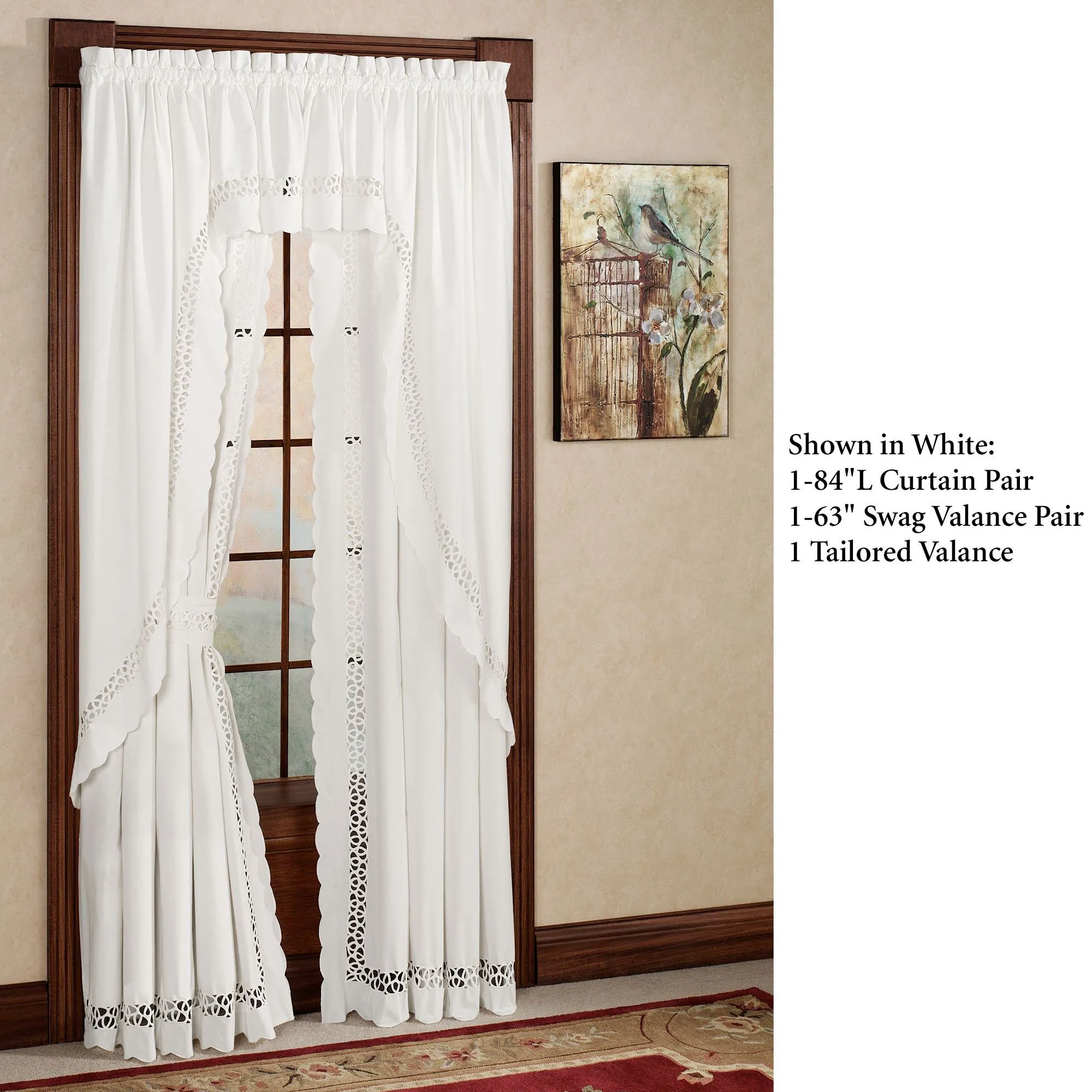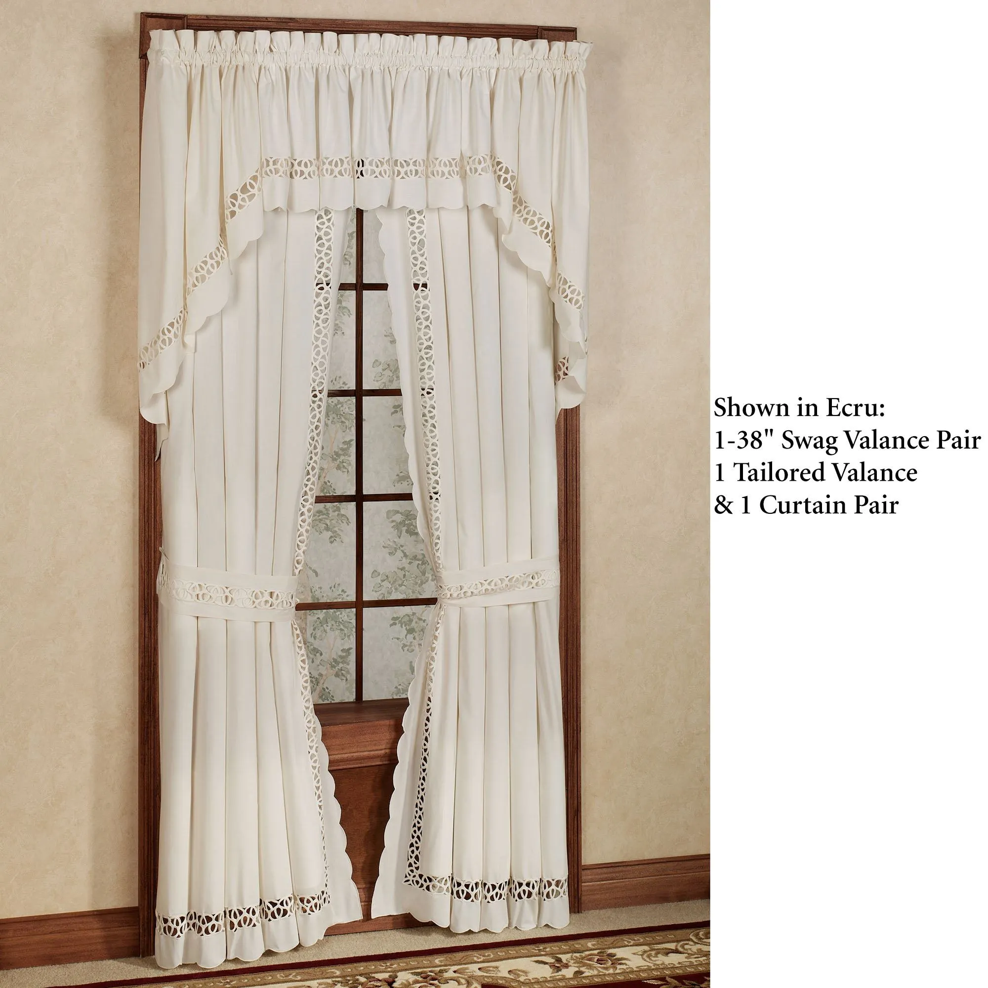 The Hellina Long Swag Valance Pair is solid color, cotton/polyester with elegant tapework insets and scalloped edging on the bottom. Also available: The tailored Curtain Pair is solid color with self tiebacks. Curtains are available in two lengths. Tailored Valance has scalloped edges and tapework on solid color. Window treatment has 1.5" rod pockets. Imported. The curtain pair width is the total width of two panels together.