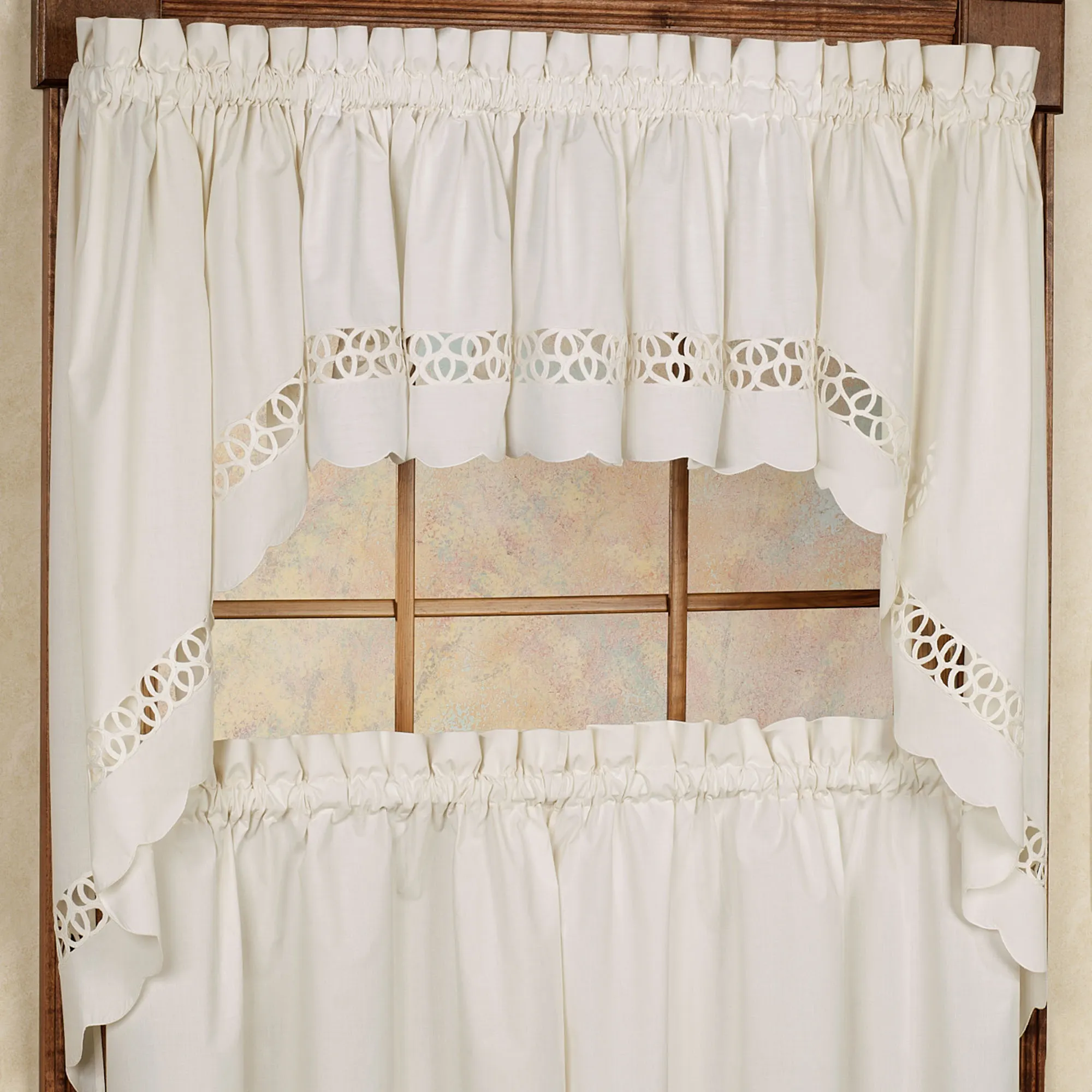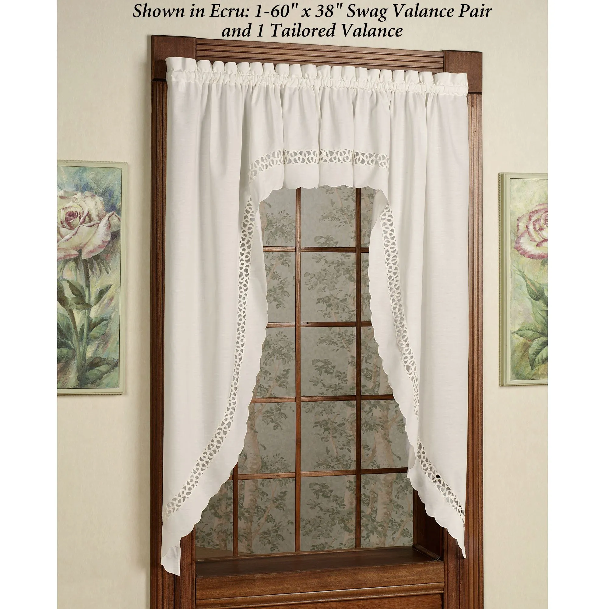 Hellina Swag Valance Pair is solid color, cotton/polyester with elegant tapework insets and scalloped edging on the bottom. Swag valance pair is available in two sizes. Tailored Curtains are solid color with self tiebacks. Curtains are available in two lengths. Also available: Tailored Valance has scalloped edges and tapework on solid color. Window accents have 1.5" rod pockets. Imported.