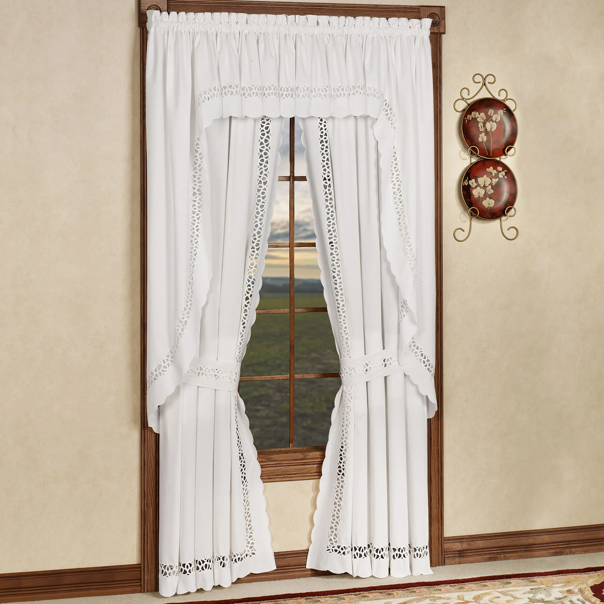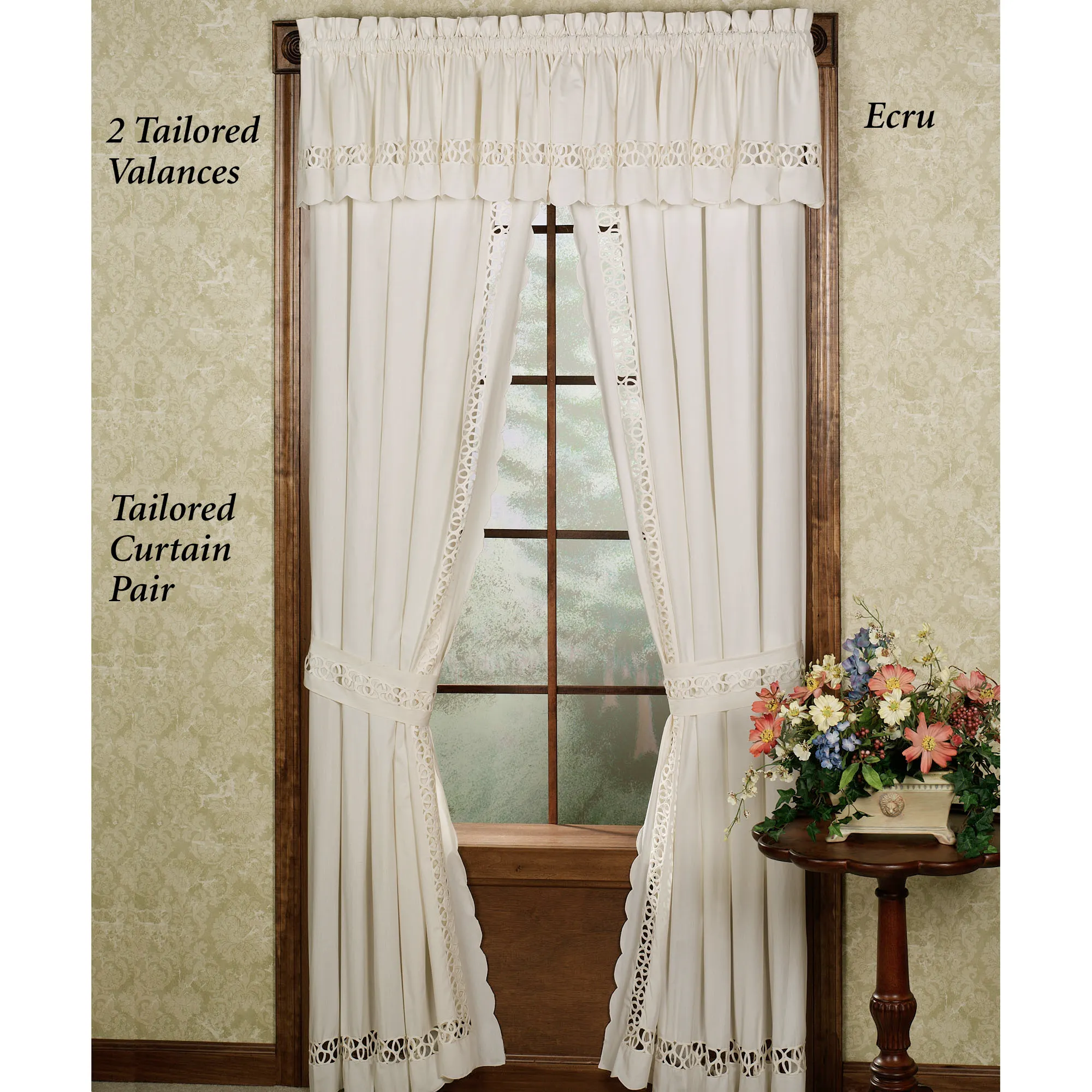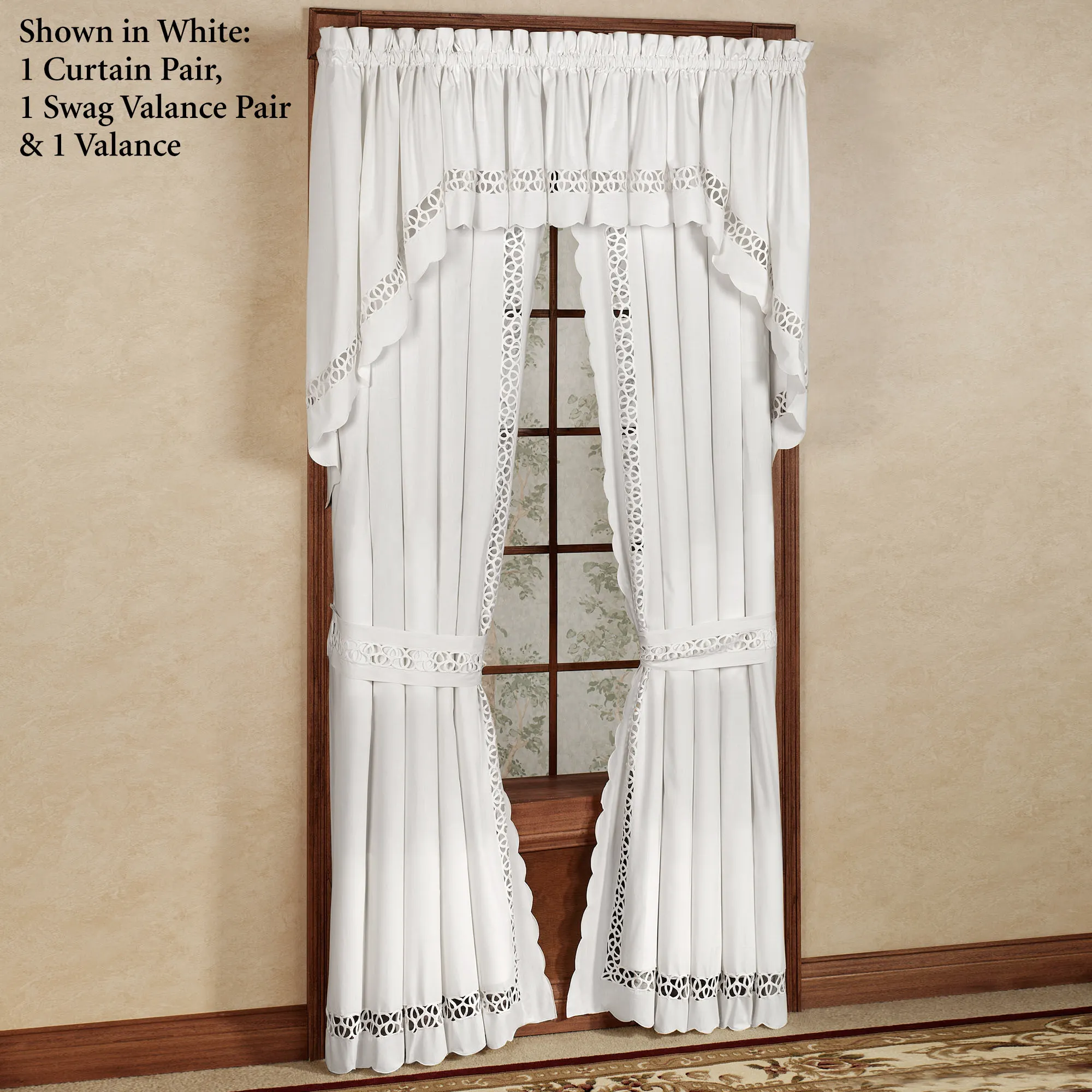 The Hellina Window Treatment is solid color, cotton/polyester with elegant tapework insets and scalloped edging on the bottom. Specify Curtain Pair, Swag Valance Pair, or Tailored Valance. Curtains are a solid color with self tiebacks. Swag Valance Pair is a solid color with open tapework and scalloped edges. Tailored Valance has scalloped edges and tapework on a solid color. Window treatment has 1.5" rod pockets. Machine washable. Imported. The curtain pair width is the total width of two panels together.