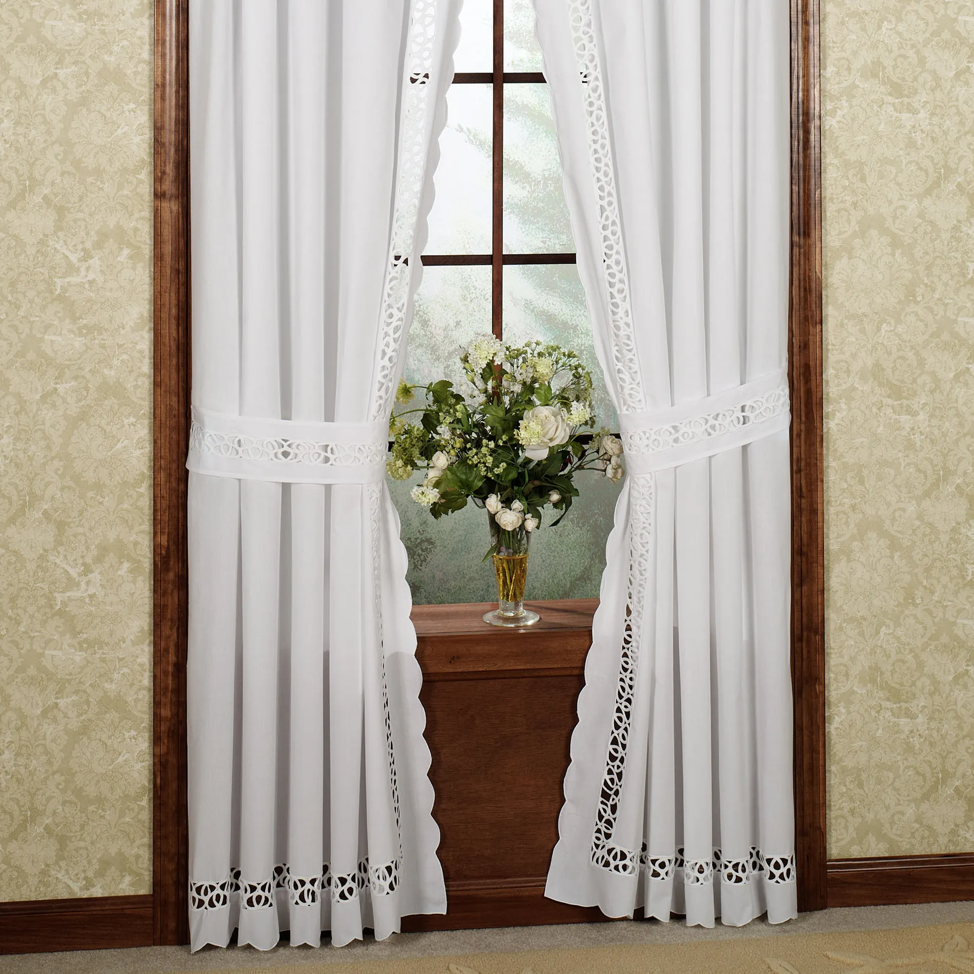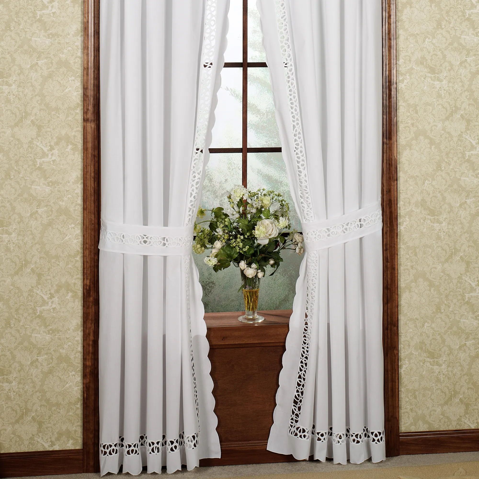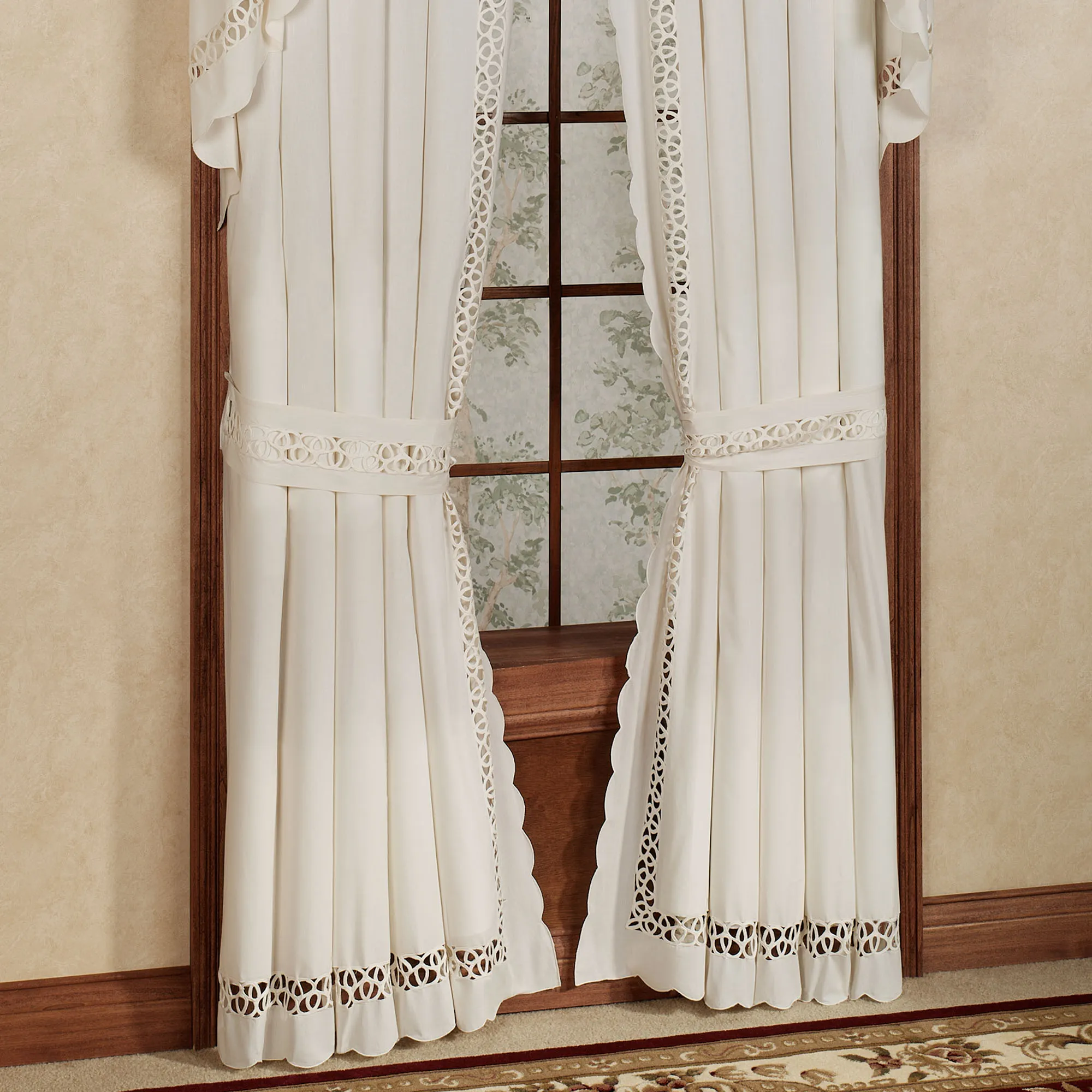 The Hellina Window Treatment is solid color, cotton/polyester with elegant tapework insets and scalloped edging on the bottom. Specify Curtain Pair, Swag Valance Pair, or Tailored Valance. Curtains are a solid color with self tiebacks. Swag Valance Pair is a solid color with open tapework and scalloped edges. Tailored Valance has scalloped edges and tapework on a solid color. Window treatment has 1.5" rod pockets. Machine washable. Imported. The curtain pair width is the total width of two panels together.