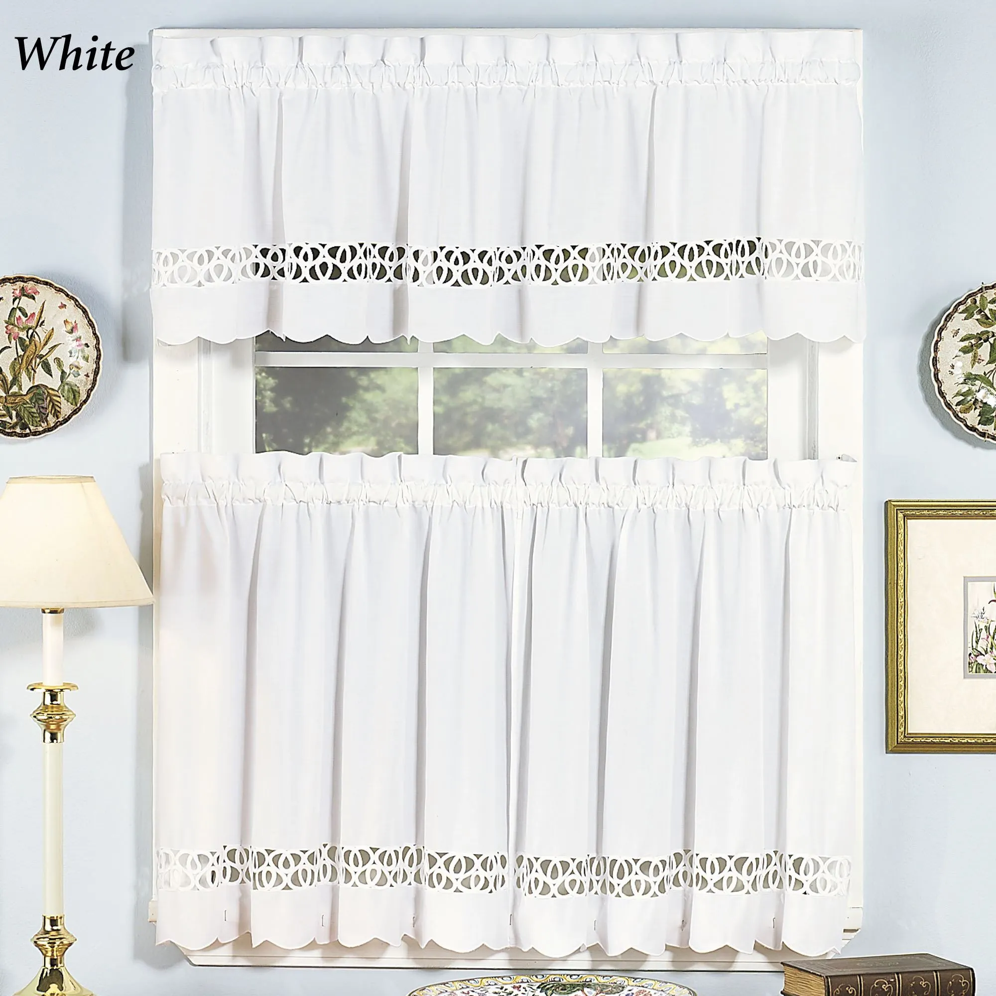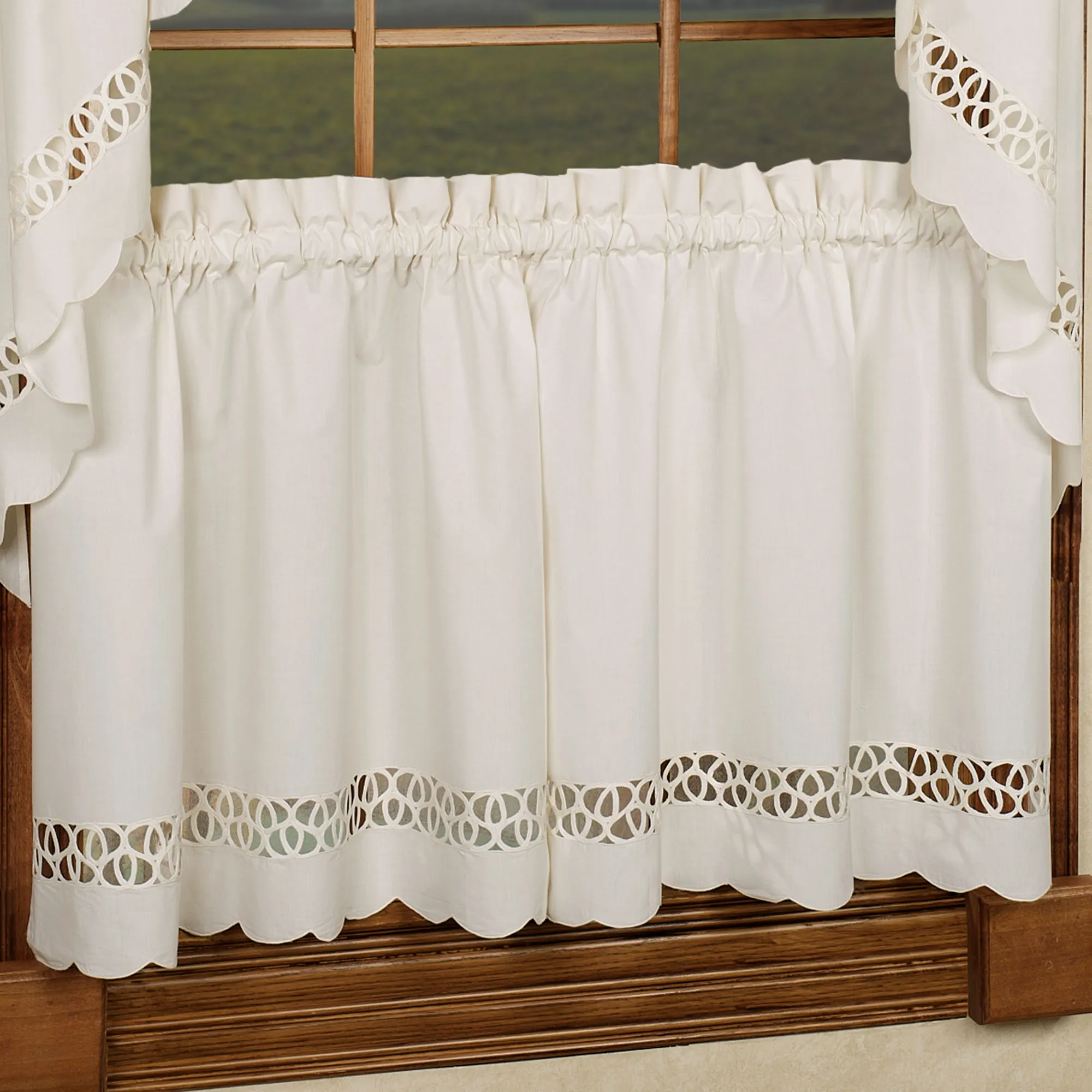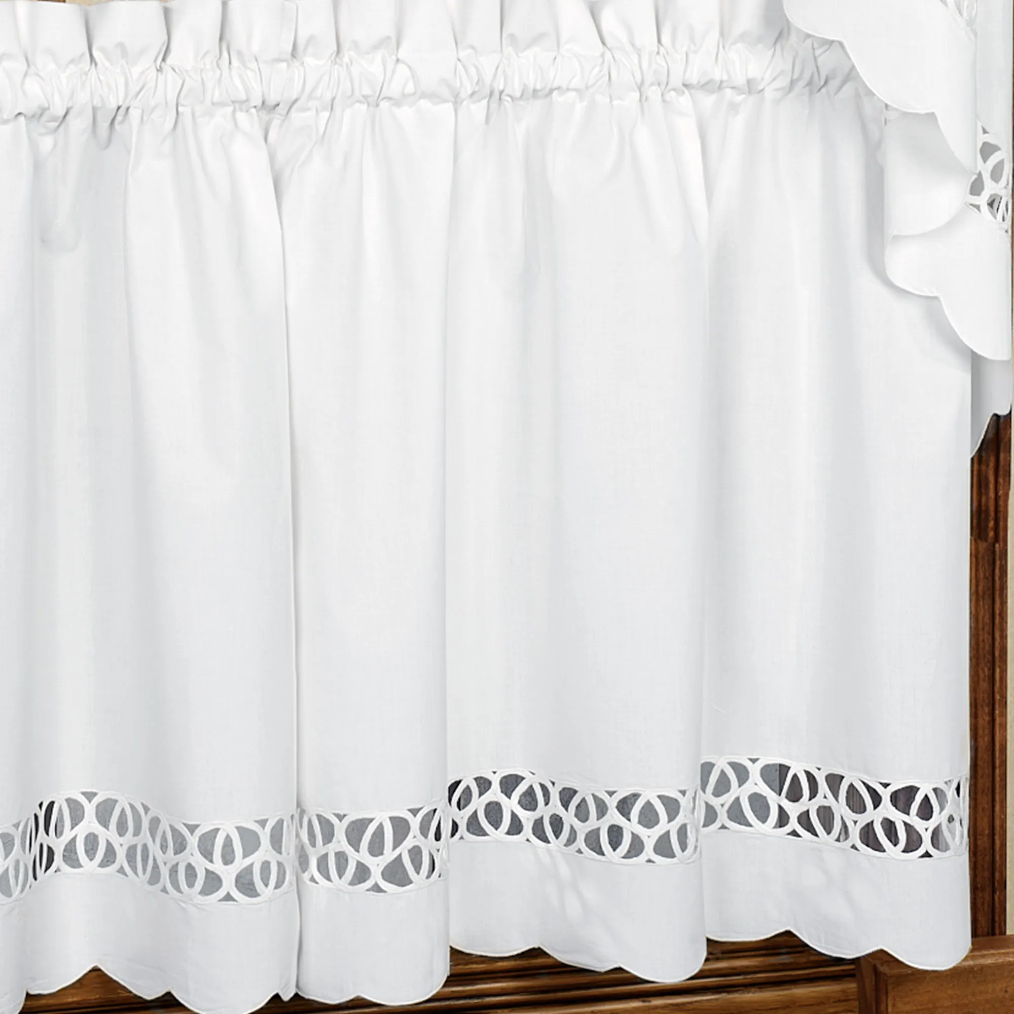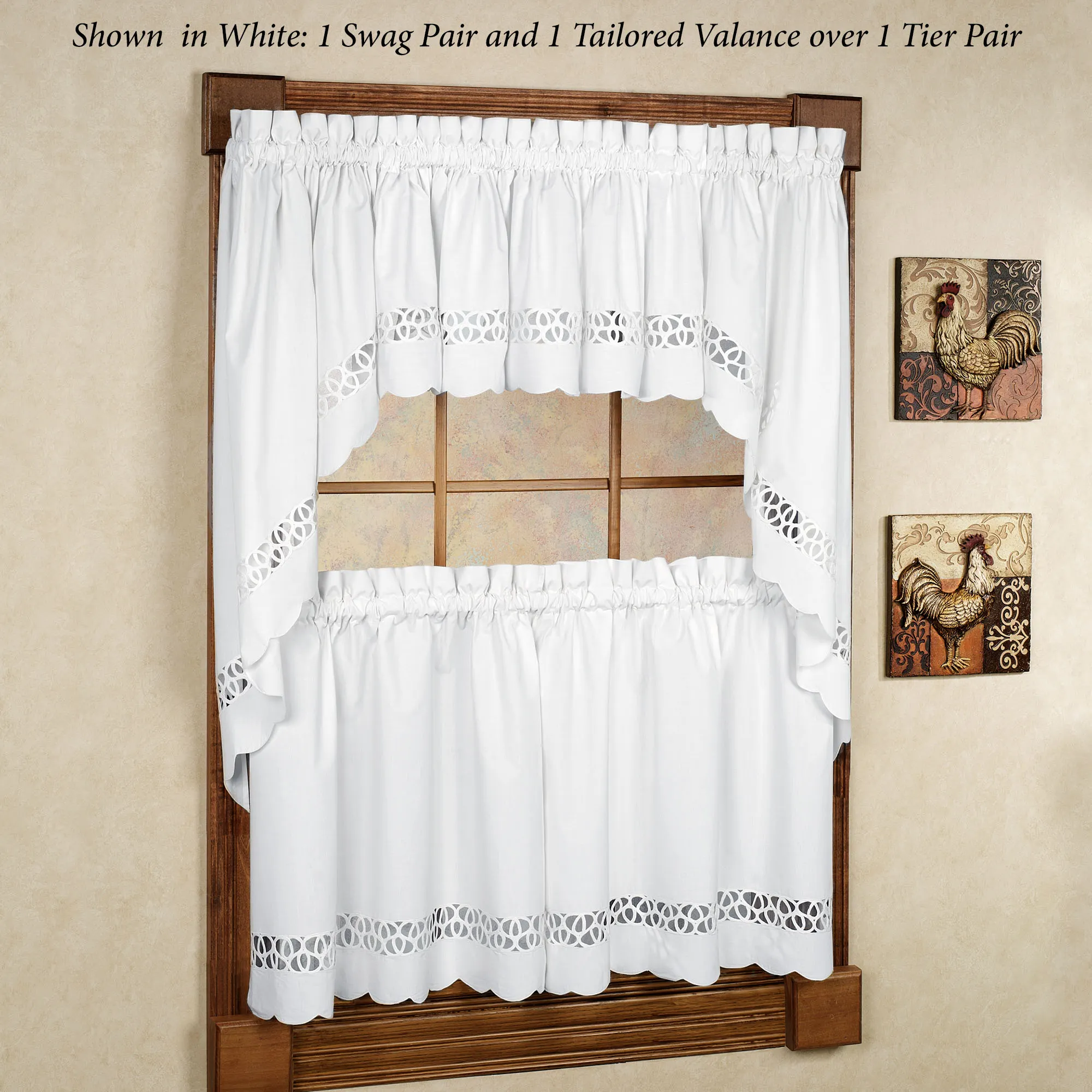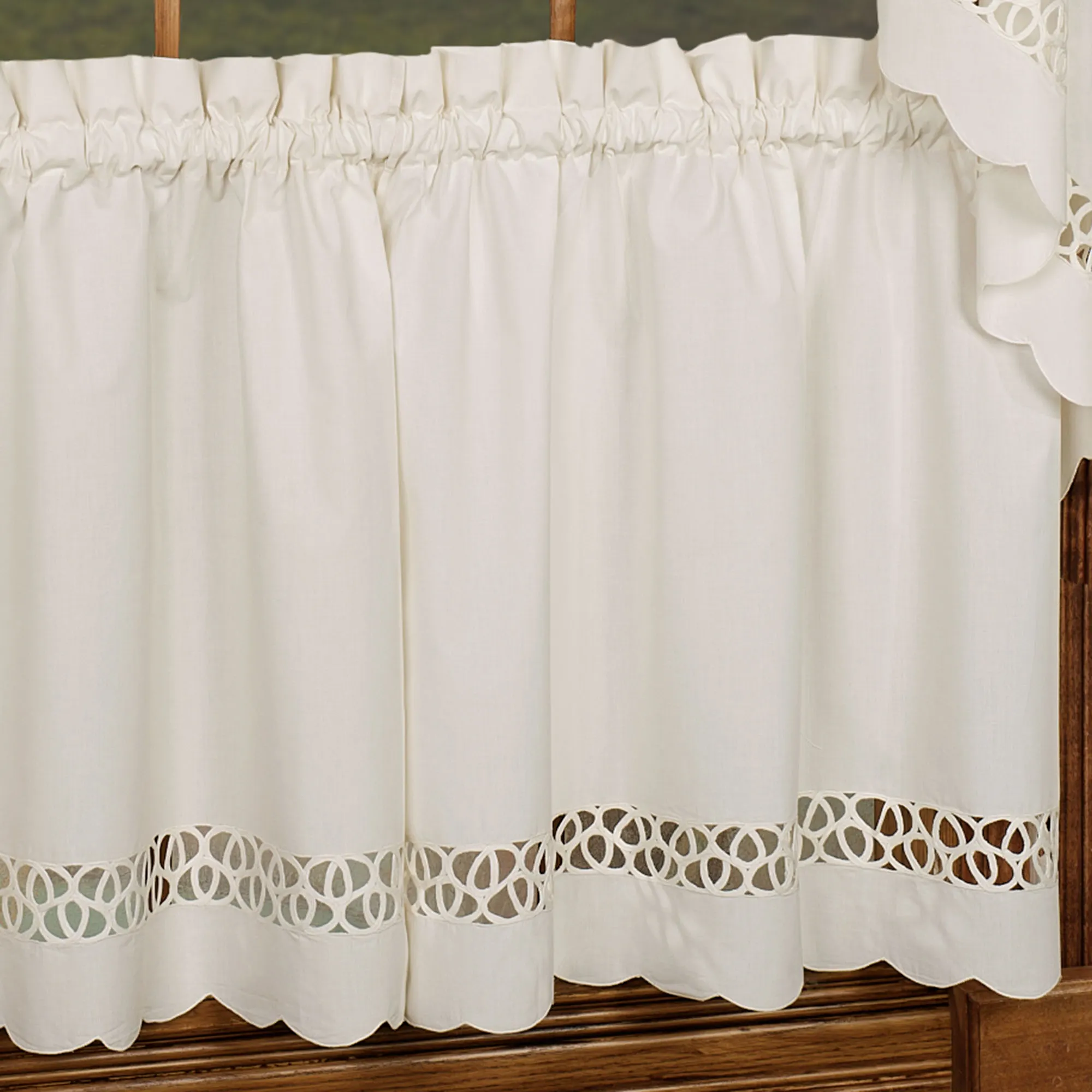 The Hellina Window Treatment is solid color, cotton/polyester with elegant tapework insets and scalloped edging on the bottom. Tier Pair is available in three lengths. Tailored Valance has scalloped edges and tapework on a solid color. Short Swag Valance Pair is a solid color with open tapework and scalloped edges. Accents have 1.5" rod pockets. Imported.