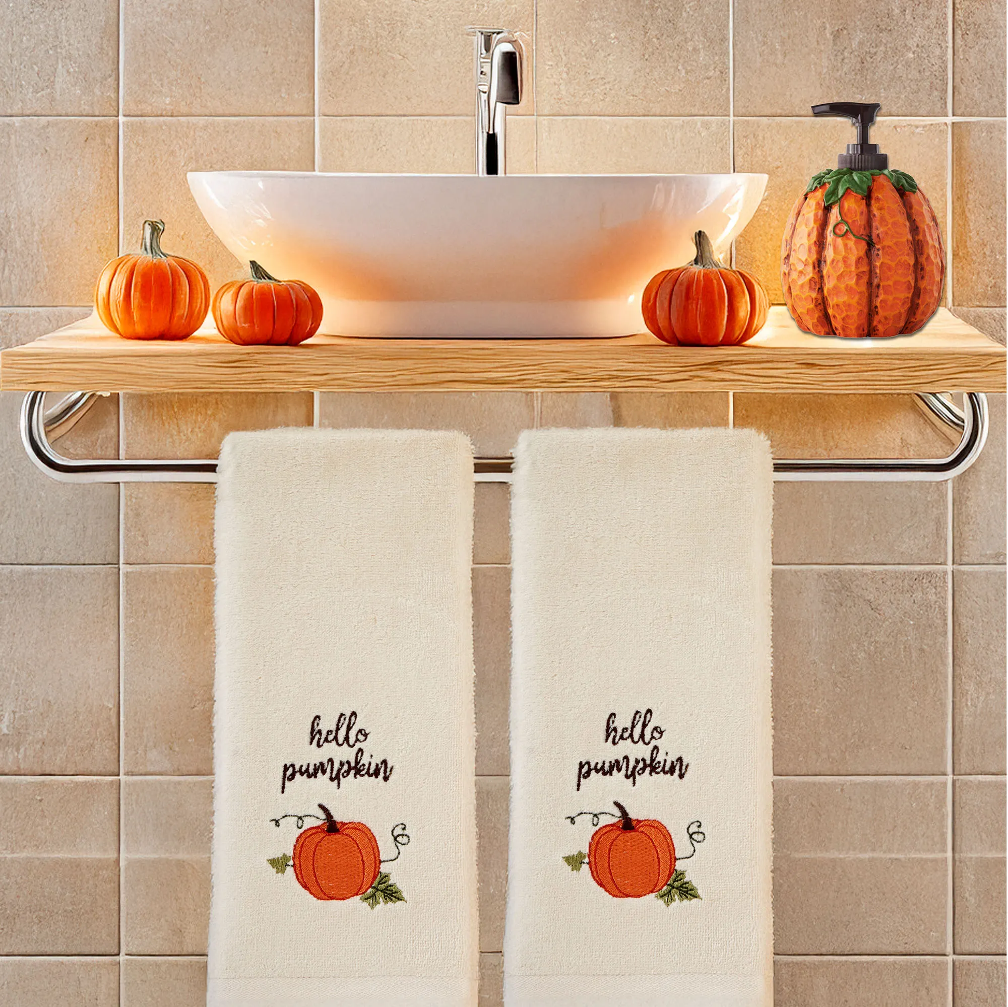 Hello Pumpkin Autumn Lotion Soap Dispenser and Fall Bathroom Hand Towels Set