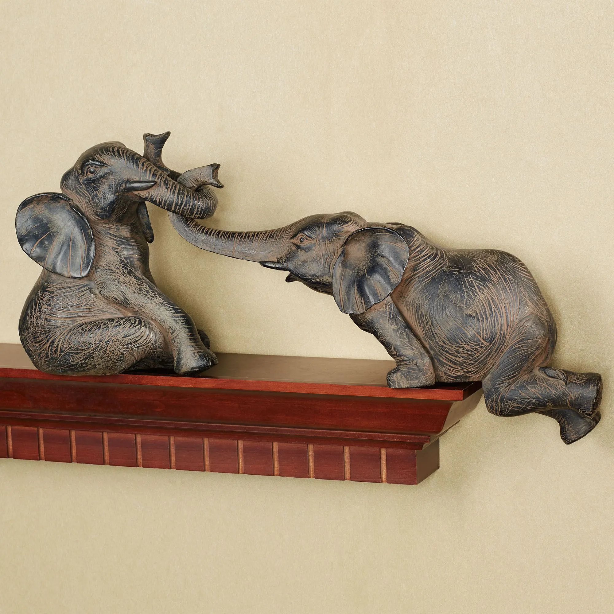 Sometimes we all need a hand (or a trunk) with getting back up, and there's no better representation of this than the Helpful Elephant Shelf Sitter Set. Resin sculpture features two bronze-finished elephants with their trunks interlocked, with one pulling up the other. Elephants can be separated into two individual pieces. Sitting elephant measures 7"Wx7"Dx8.5"H; kneeling elephant is 14"Wx4.5"Dx10"H.
