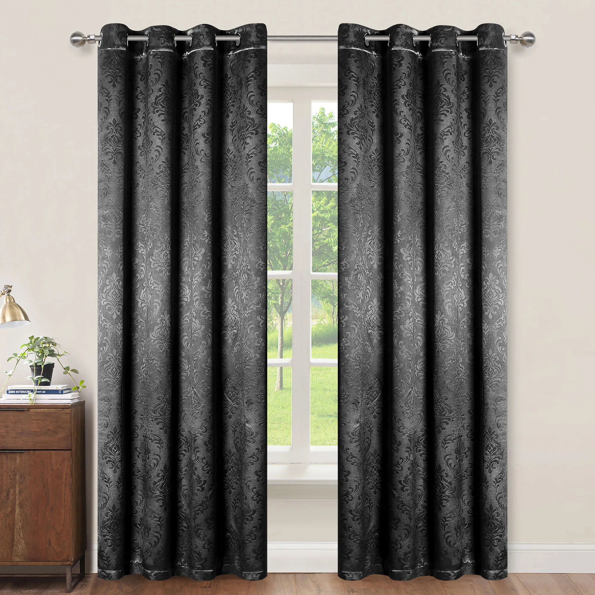 An embossed damask pattern adds to the sophisticated look of the Henline Grommet Curtain Pair. The room darkening, sheen polyester curtains have metal grommets with a silver finish and 1.5" dia. openings. The back has layers of black yarns woven between layers of colored yarns to reduce noise and save energy. The wide curtain pair measures 104"Wx84"L. Machine washable. Imported. The curtain pair width is the total width of two panels together.