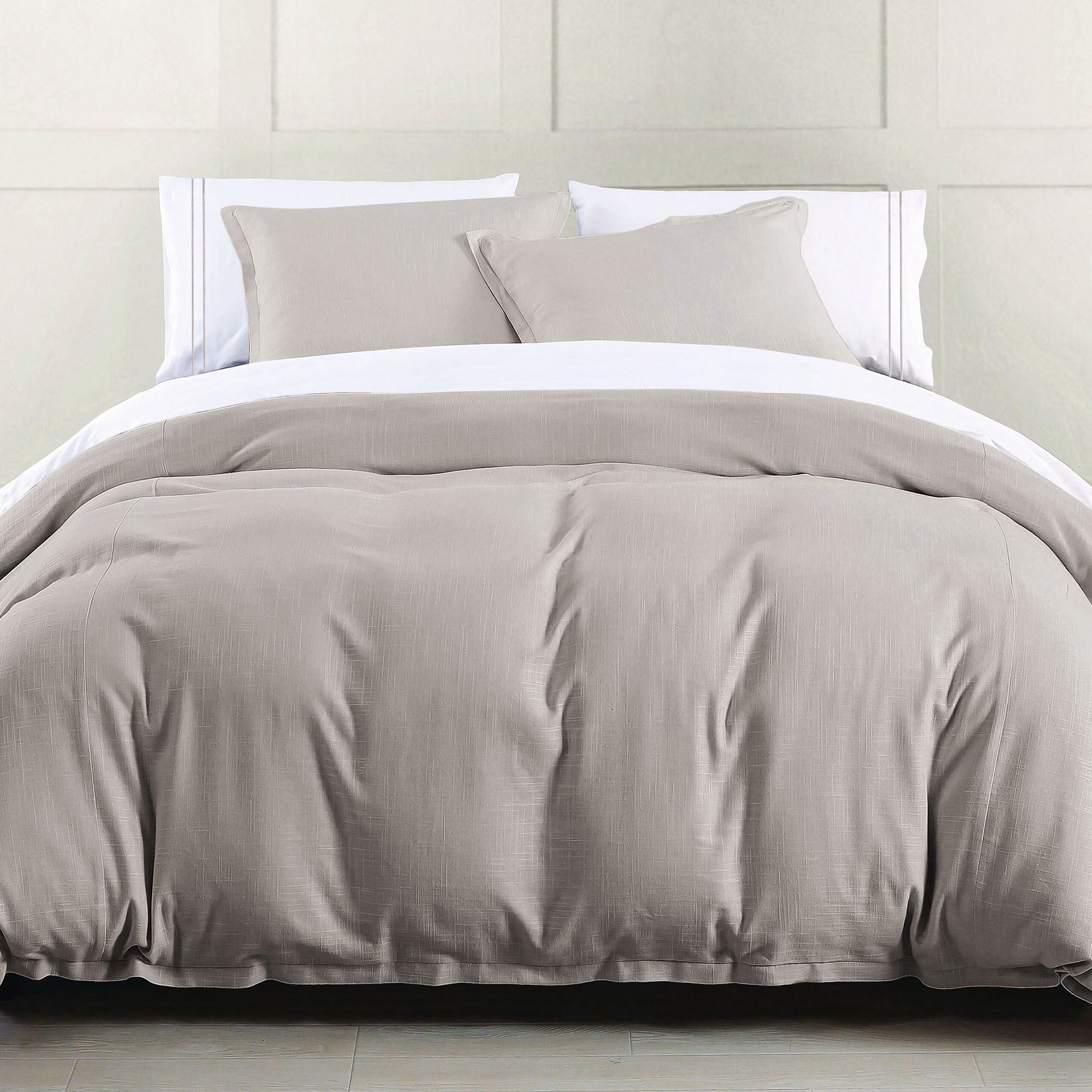 Make a classic statement in any sleeping space with the Hera Light Taupe Bedding. The Mini Comforter Set includes a comforter and two shams. This solid light taupe, woven viscose/linen bedding is easy to care for and mimics the look and textural appeal of linen without the creases. Oversized comforter has flanged ends and a solid color cotton backing; fill is polyester. Flanged shams mimic the comforter and have French back closures. Machine washable. Imported.